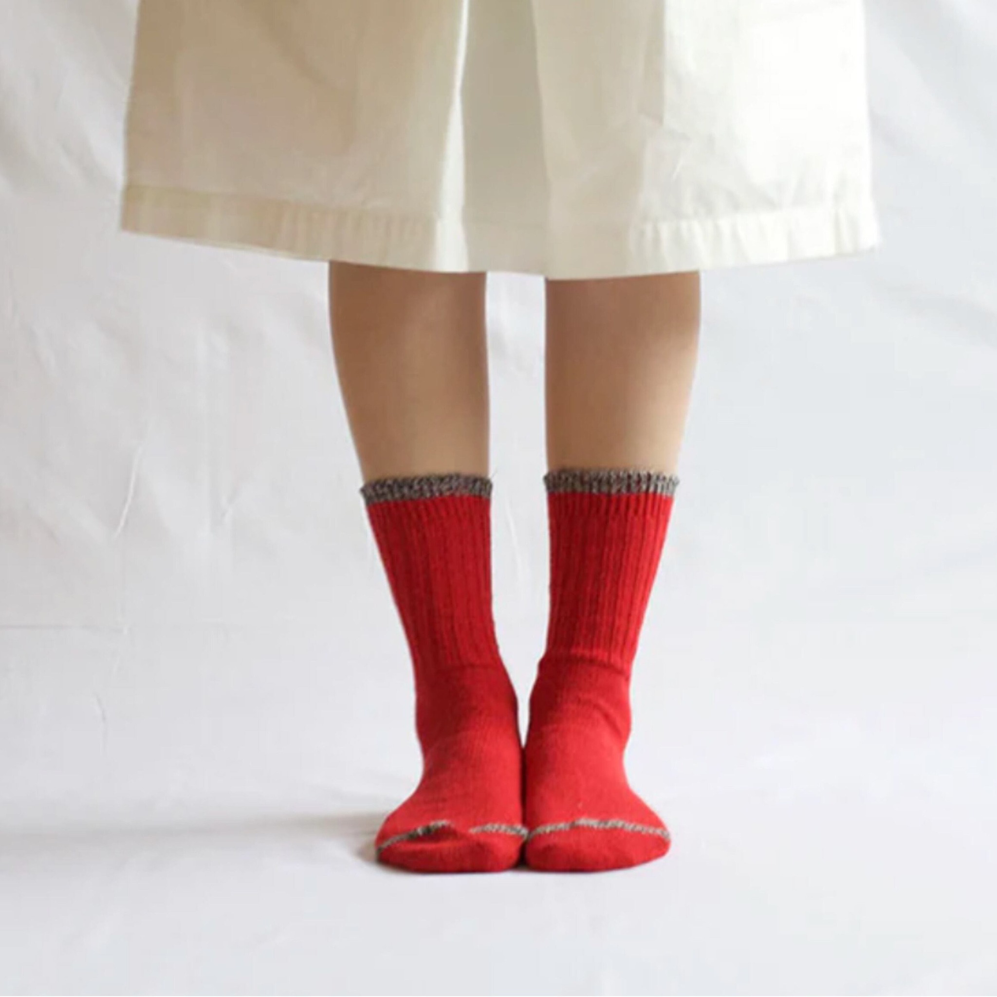 紡績時に糸にならなかったヴァージンコットンを特殊な紡績機にかけたリサイクルコットンとシルク紬糸を合わせた糸を使用しているので、シルクらしいしっとりとした風合いと綿らしい柔らかさが楽しめる靴下。