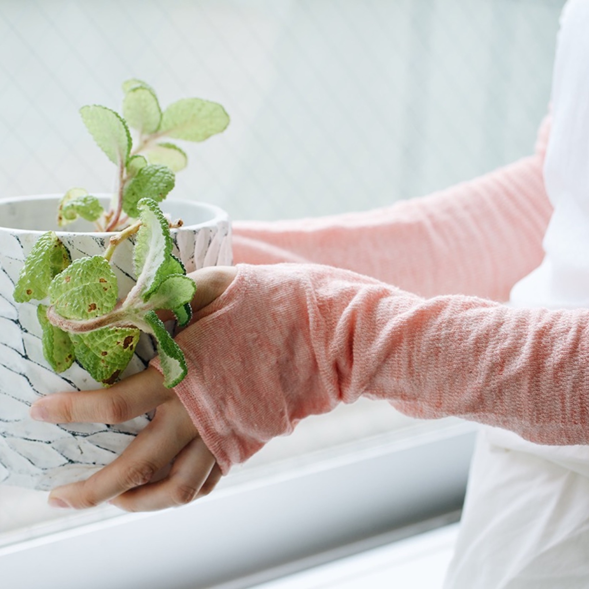 シャリシャリとした清涼感、熱を伝えにくい特徴がある「リネン」をメッシュ編みにしたアームカバー