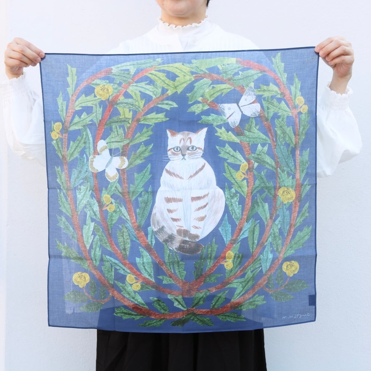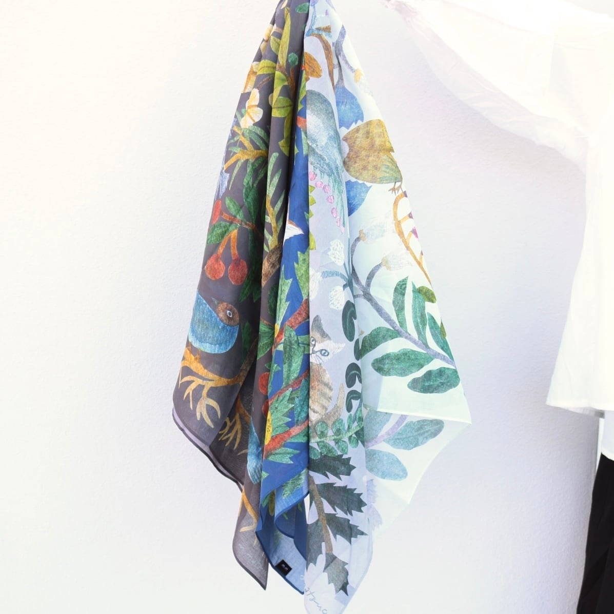 動物と植物のモチーフが広がる大判サイズのコットンハンカチです。
