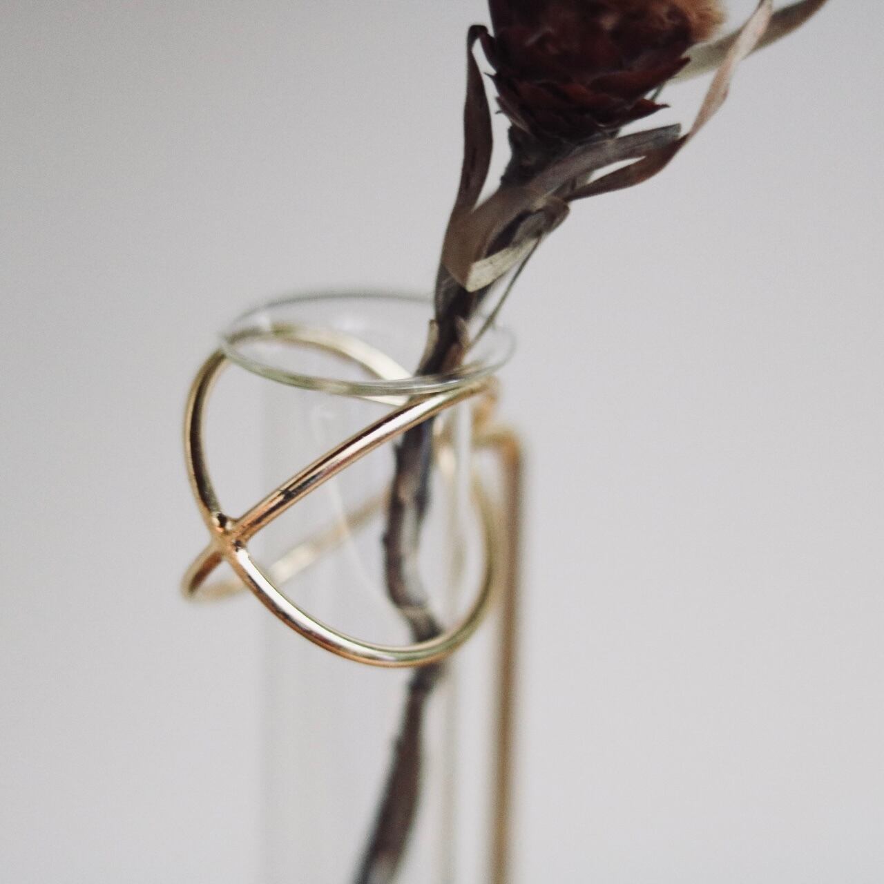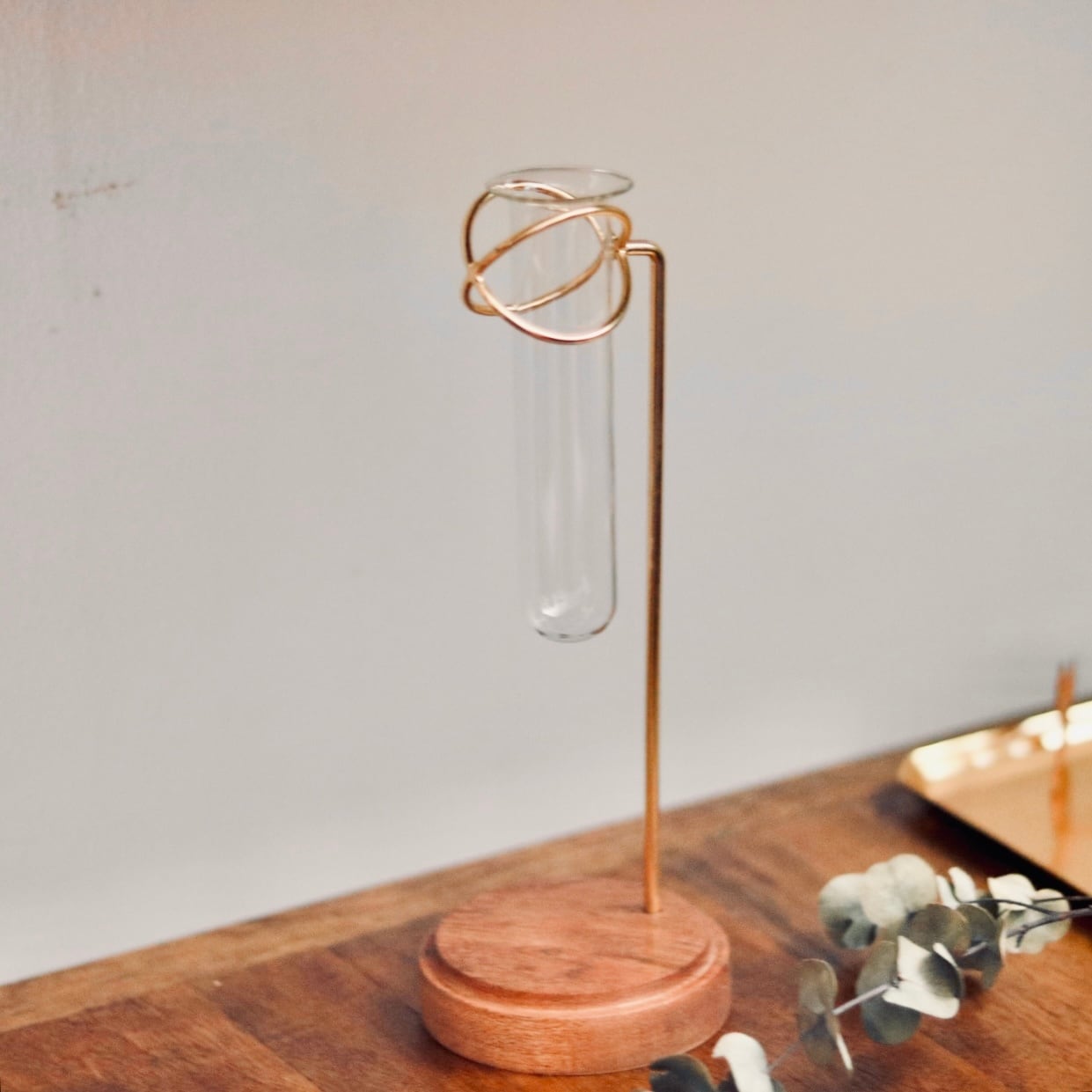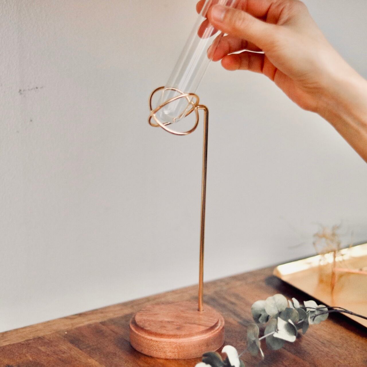 試験管の形をしたガラスベースをアイアンのホルダーにセットしたフラワーベース