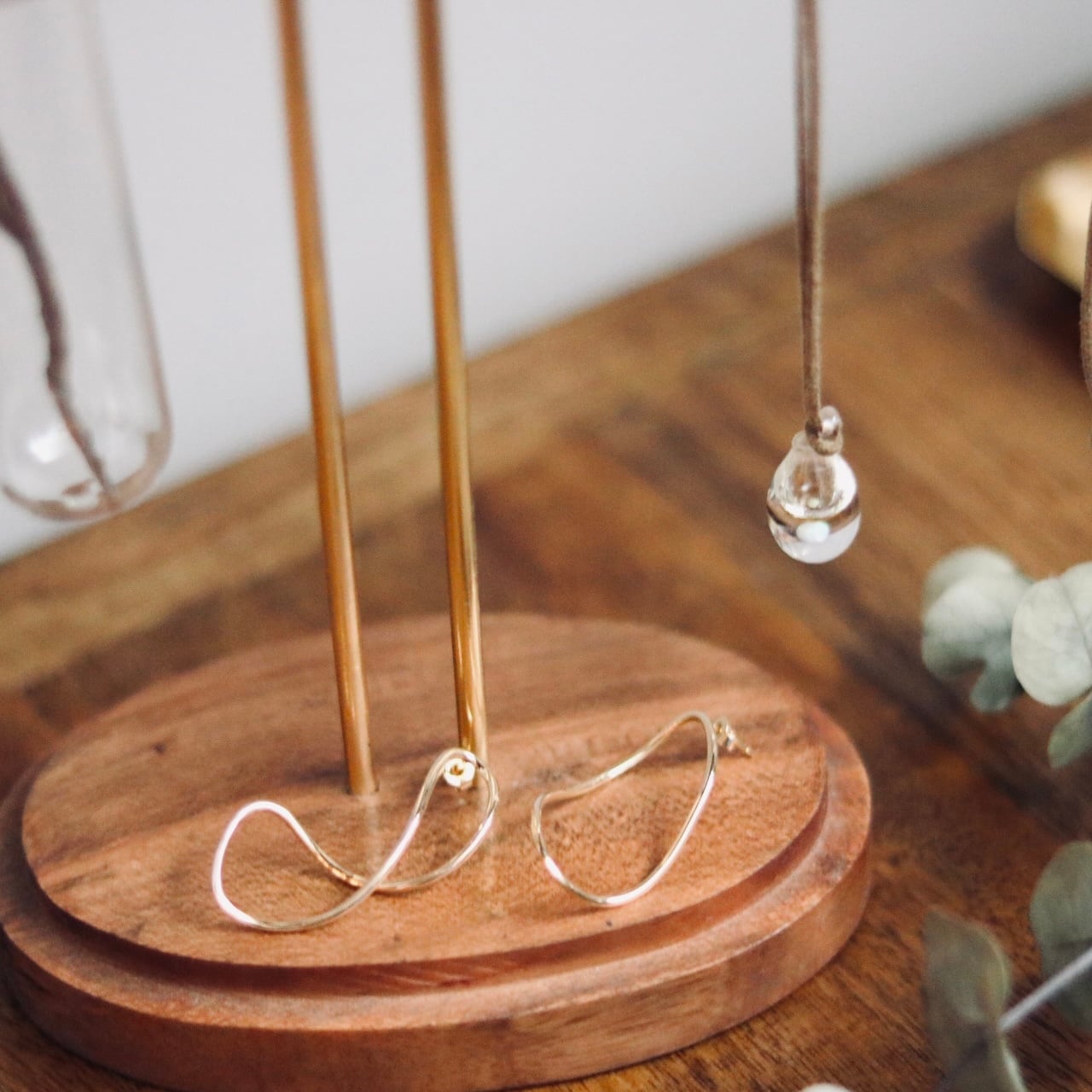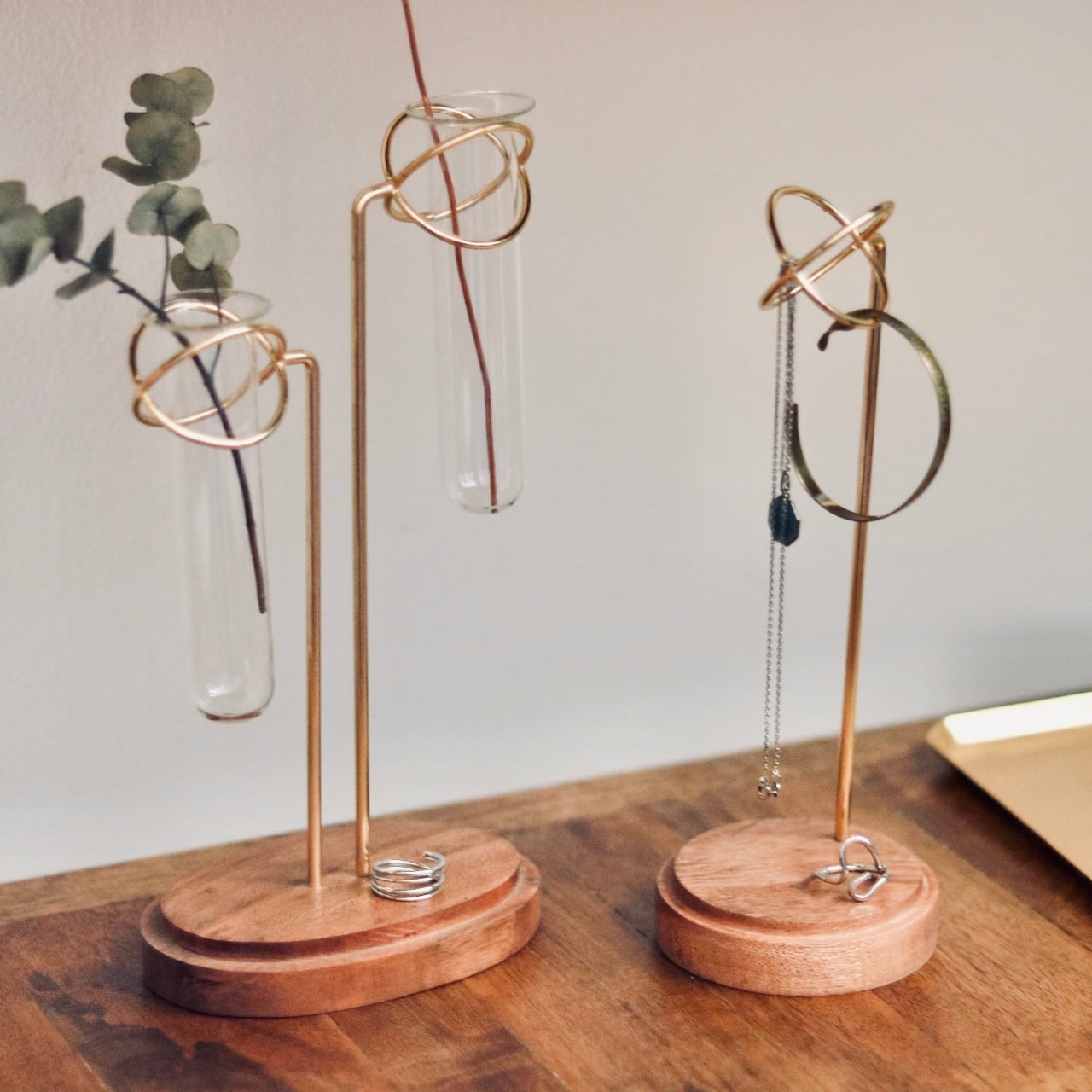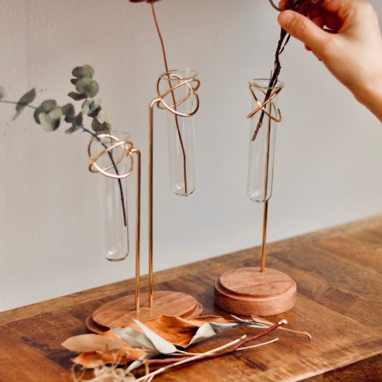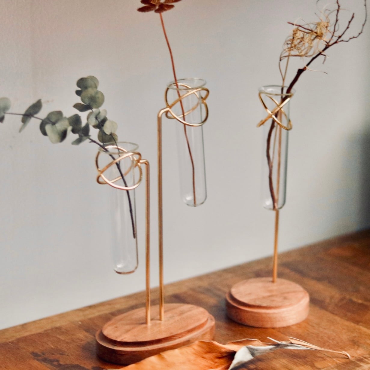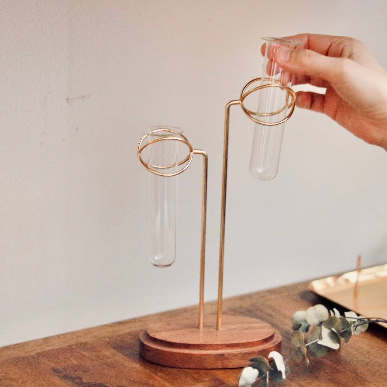 試験管の形をしたガラスベースをアイアンのホルダーにセットしたフラワーベース