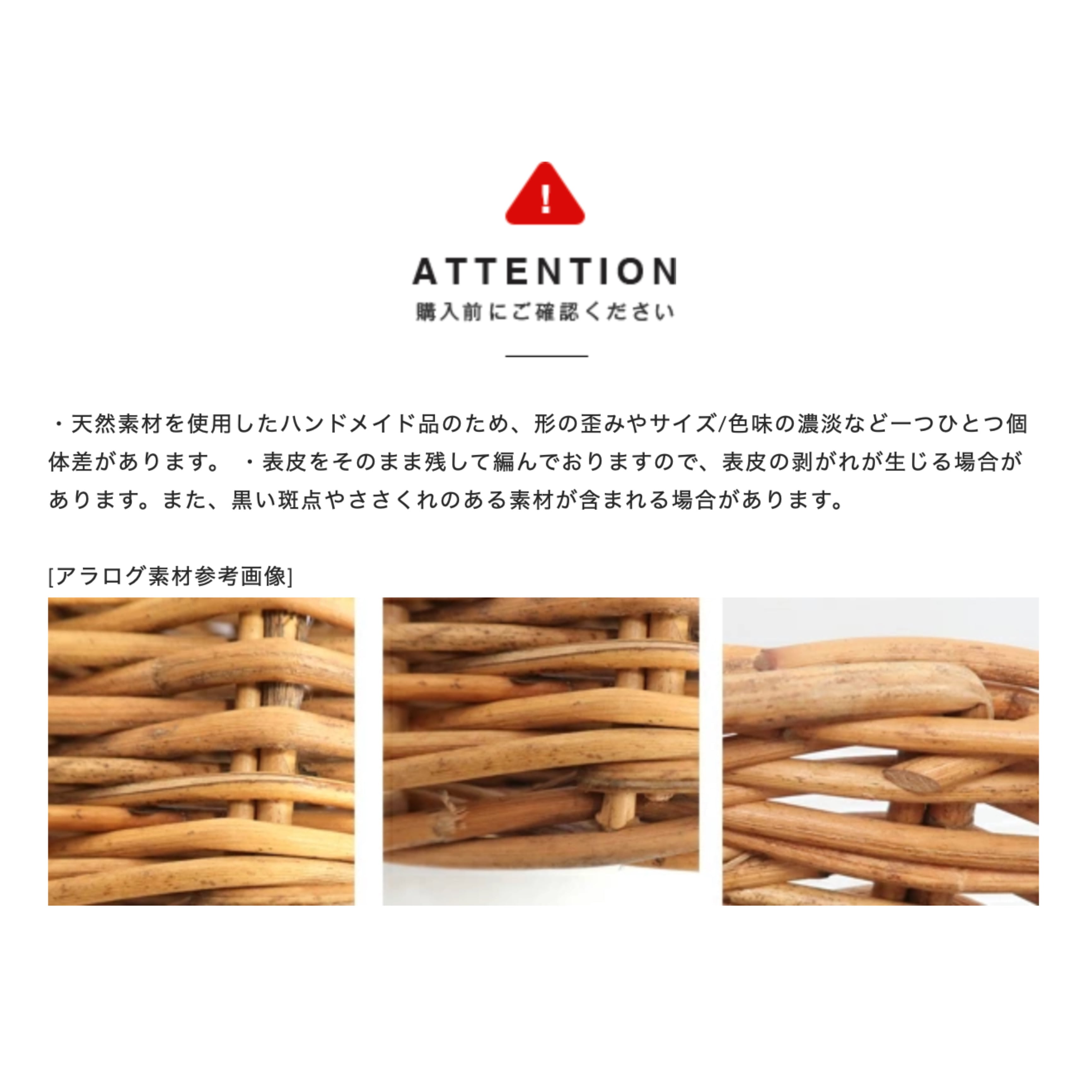 THE AROROG(ジ・アラログ)シリーズのかごは、表皮をそのまま残した皮付きラタン(藤)の中から、不揃いな材を使用することで、アンティークの風合いが感じられます。丈夫な素材のため長年愛用していただけ、いつかは本物のアンティークに、、、