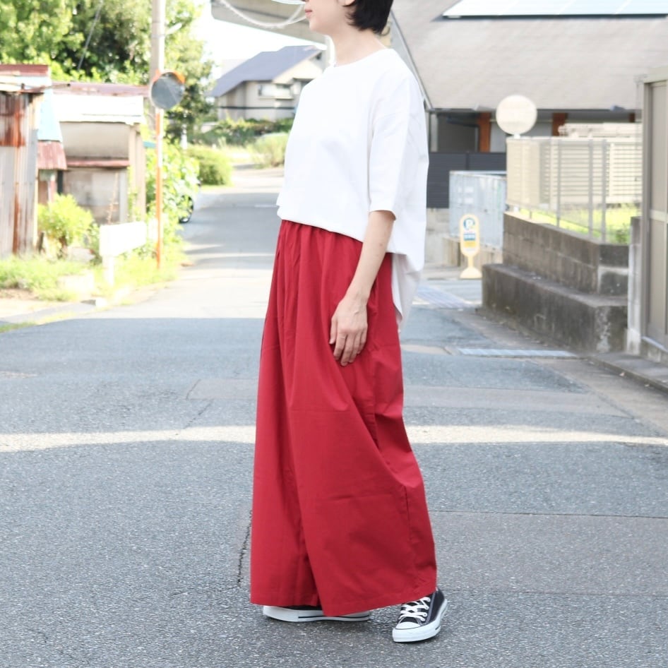 余裕のある身幅でゆったり着用いただけるワイドなパンツは、ポプリン生地で耐久性もありながら柔らかい肌触りです。