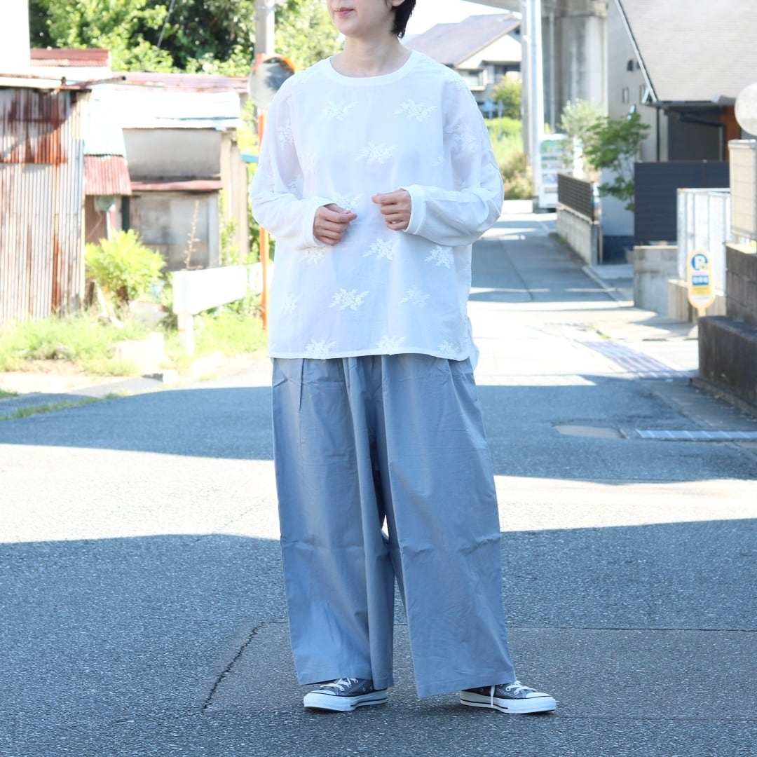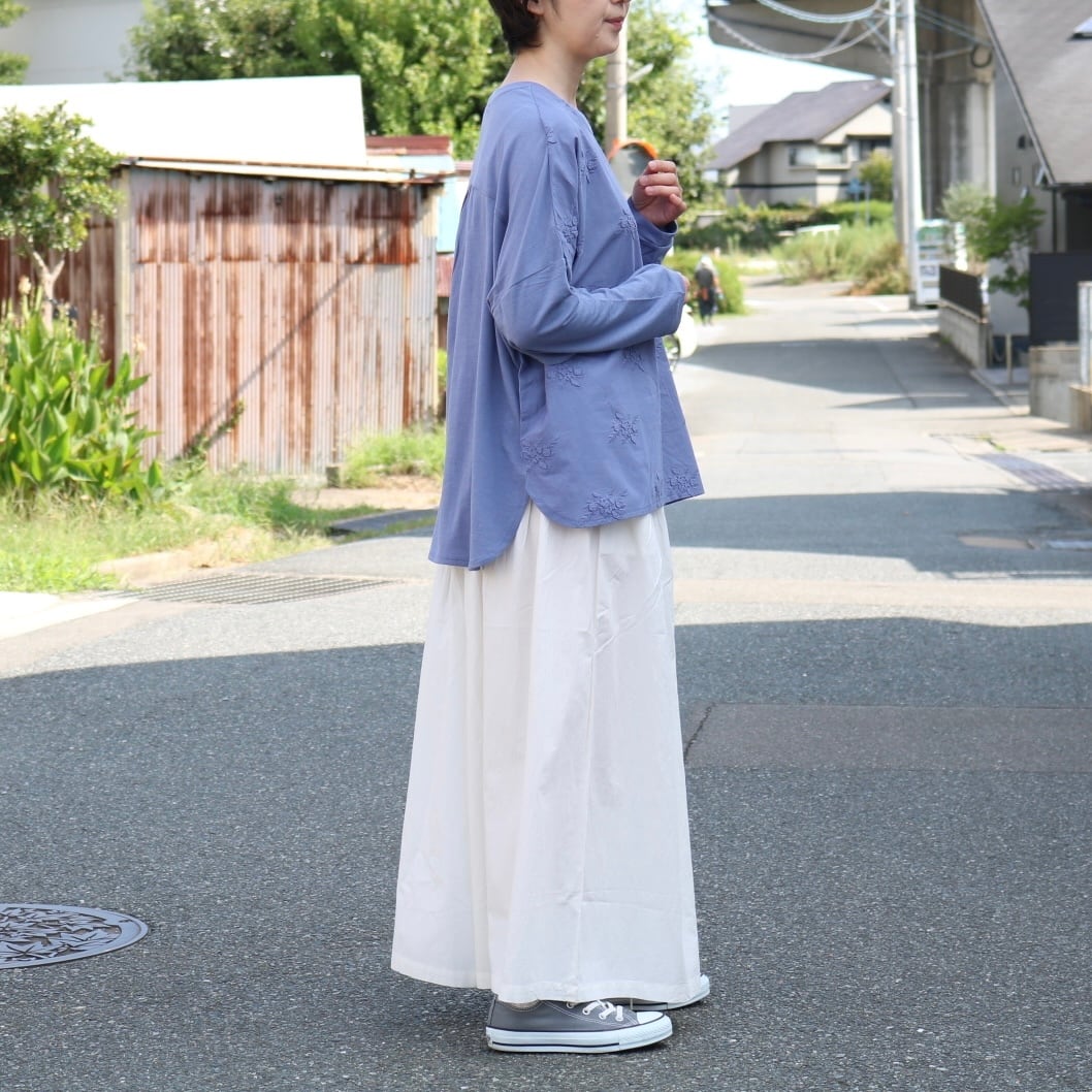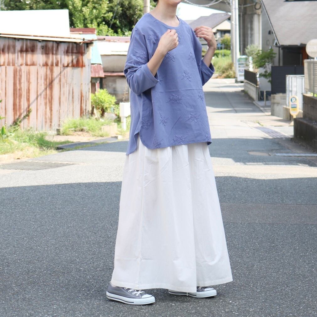 薄手の布帛生地に、立体的な花柄が刺繍された上品な一枚です。