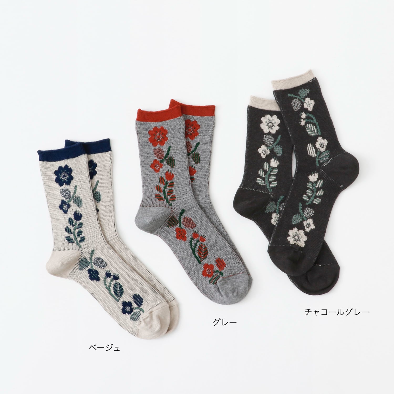 ナチュラルで優しい雰囲気の花柄が素敵なジャガード編みのソックスです。