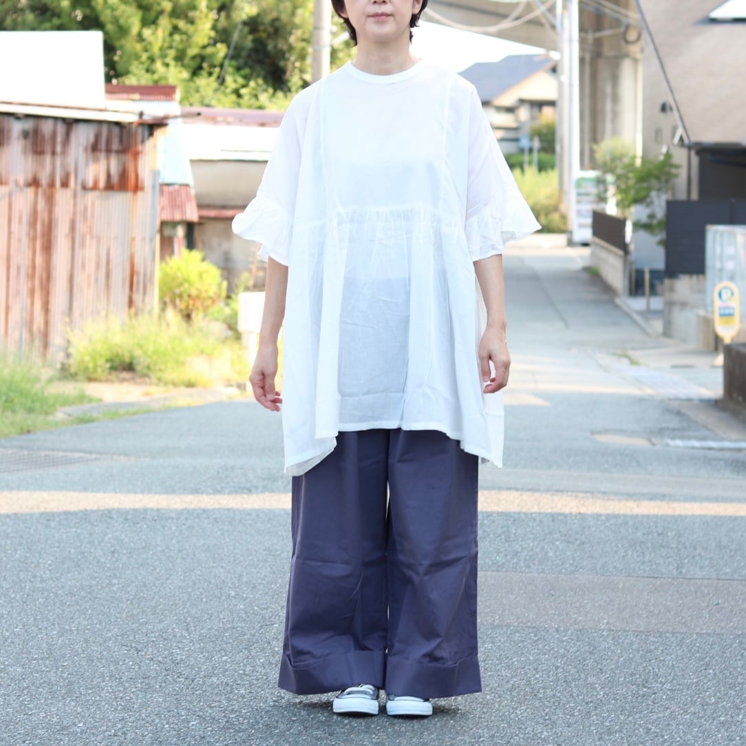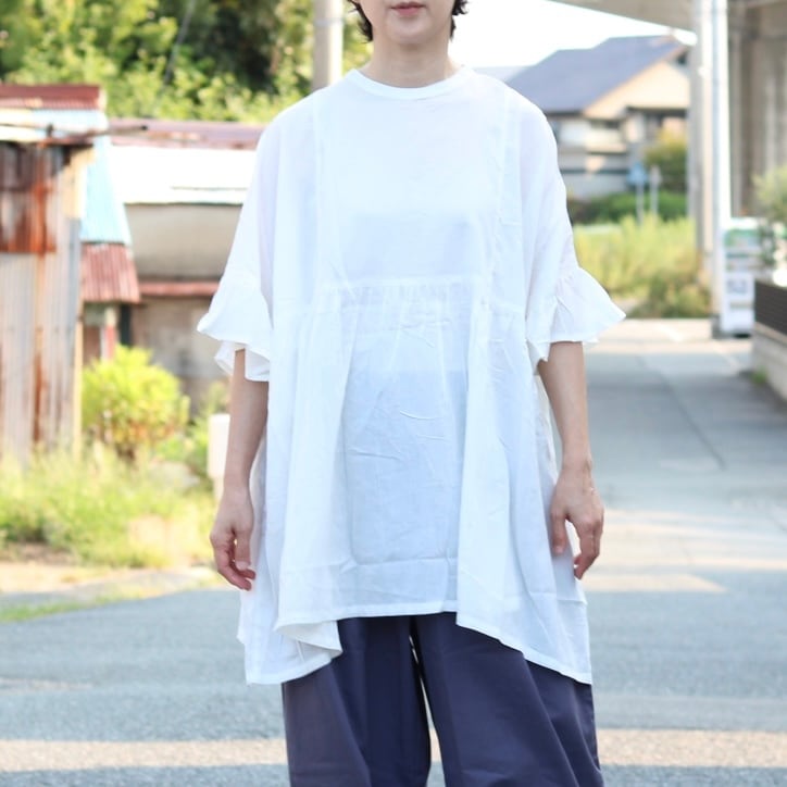 袖のフリルが可愛いボリュームたっぷりのチュニックは、前後着用できて使い回し抜群です。