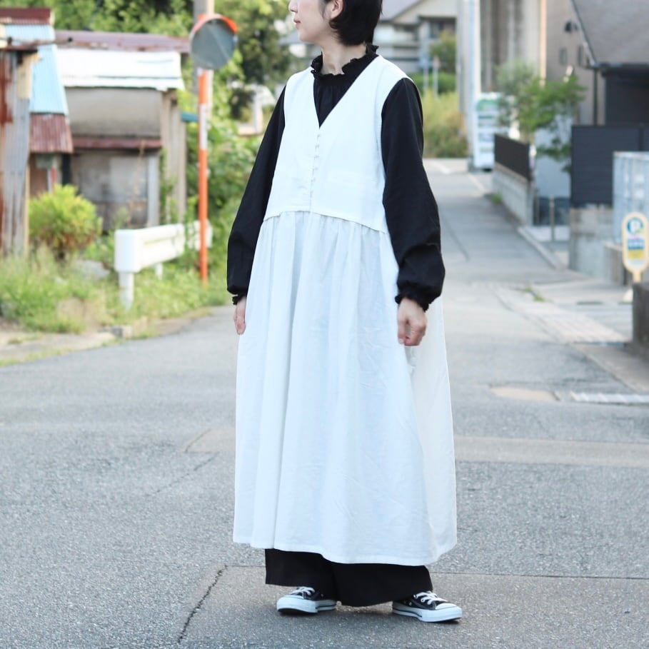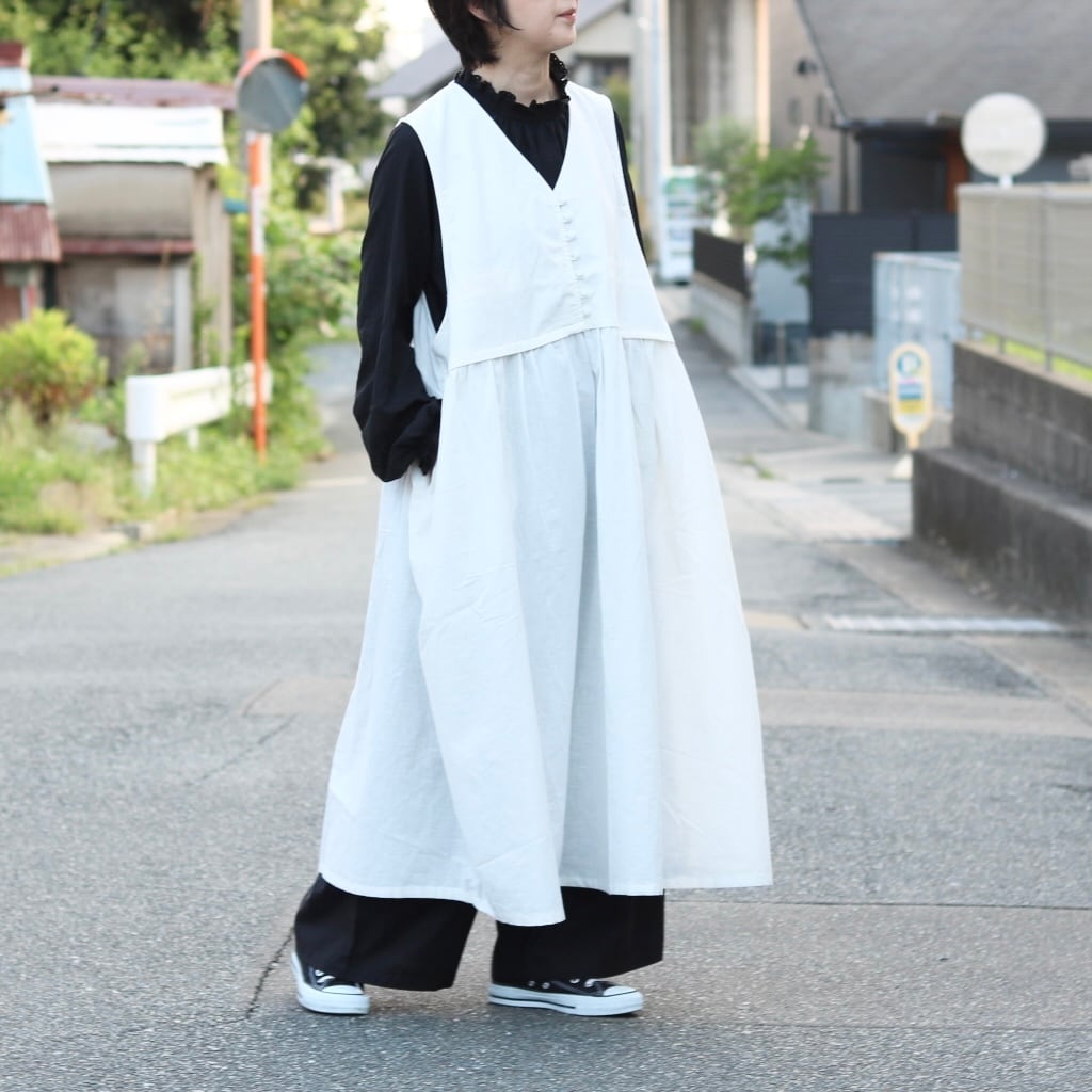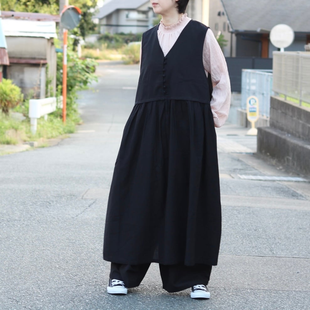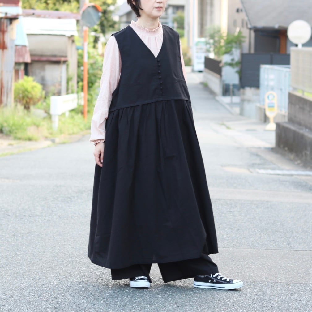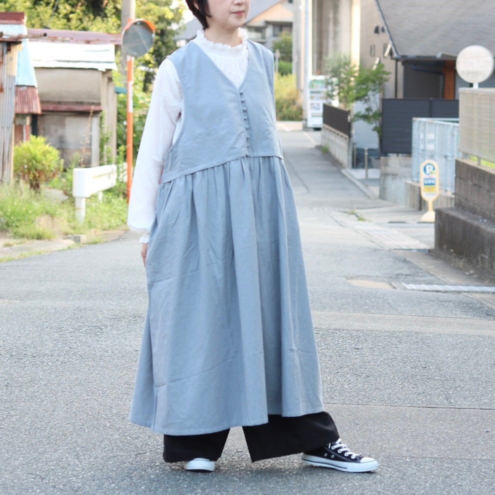 ウエストの切り替え位置が高いので自然とスタイルアップ効果もあるベスト風ワンピースです。