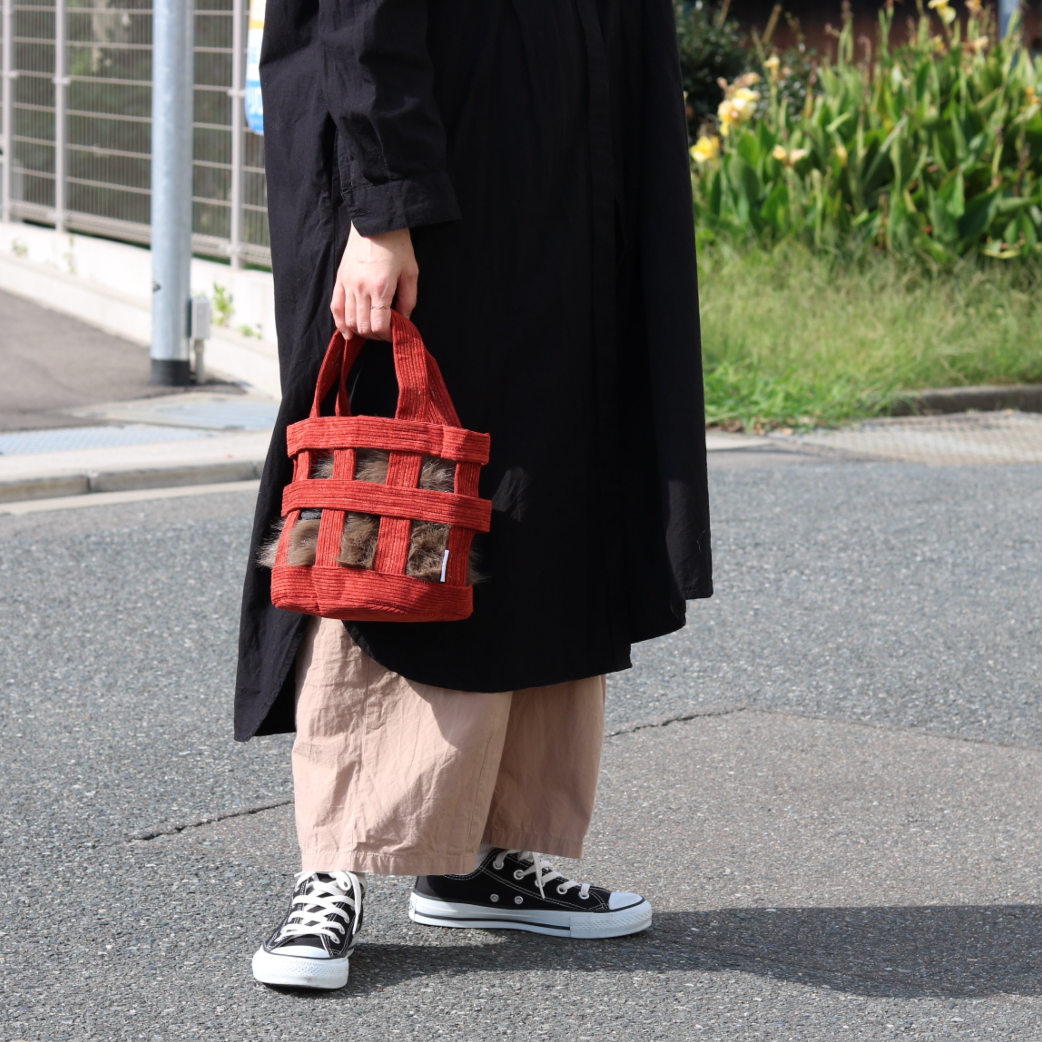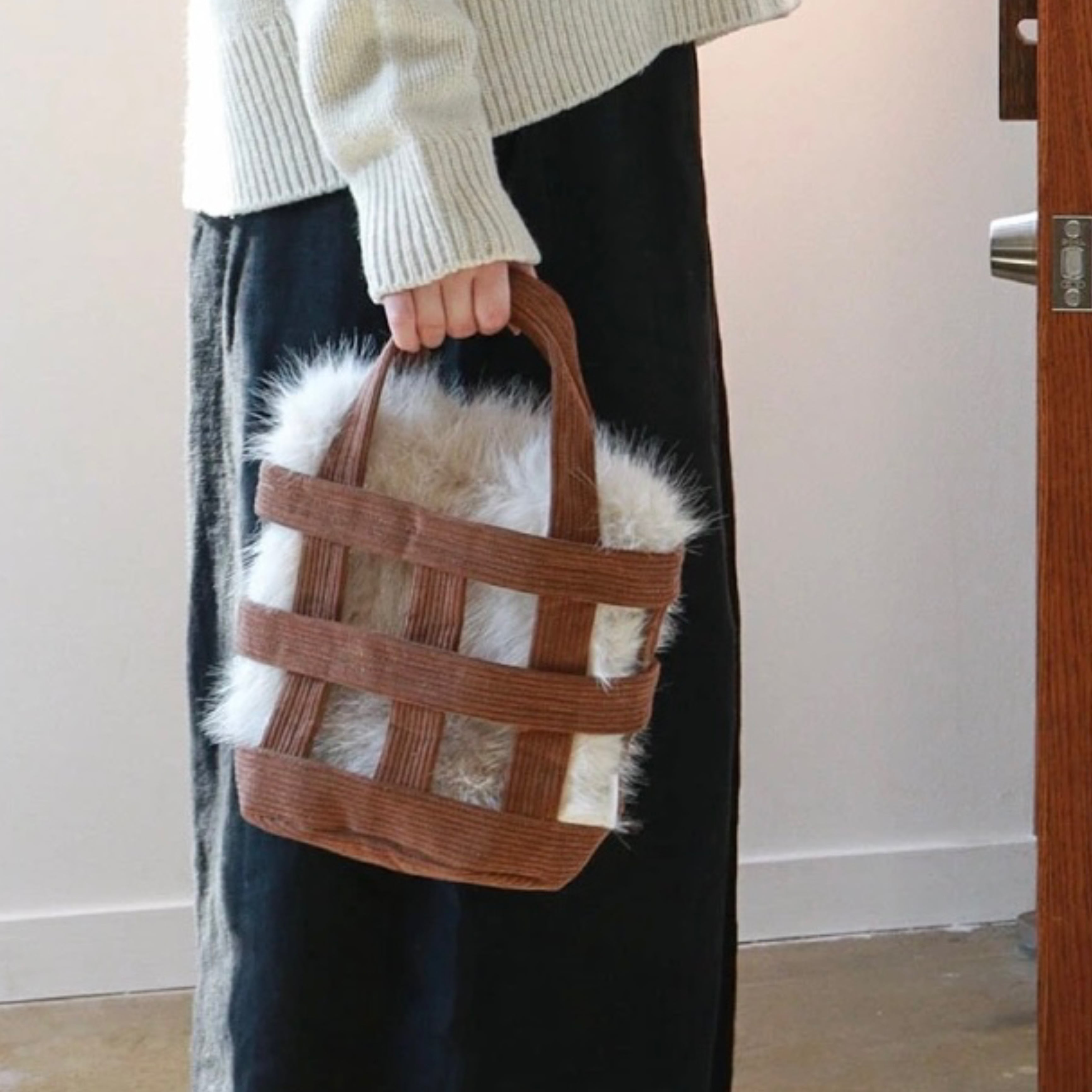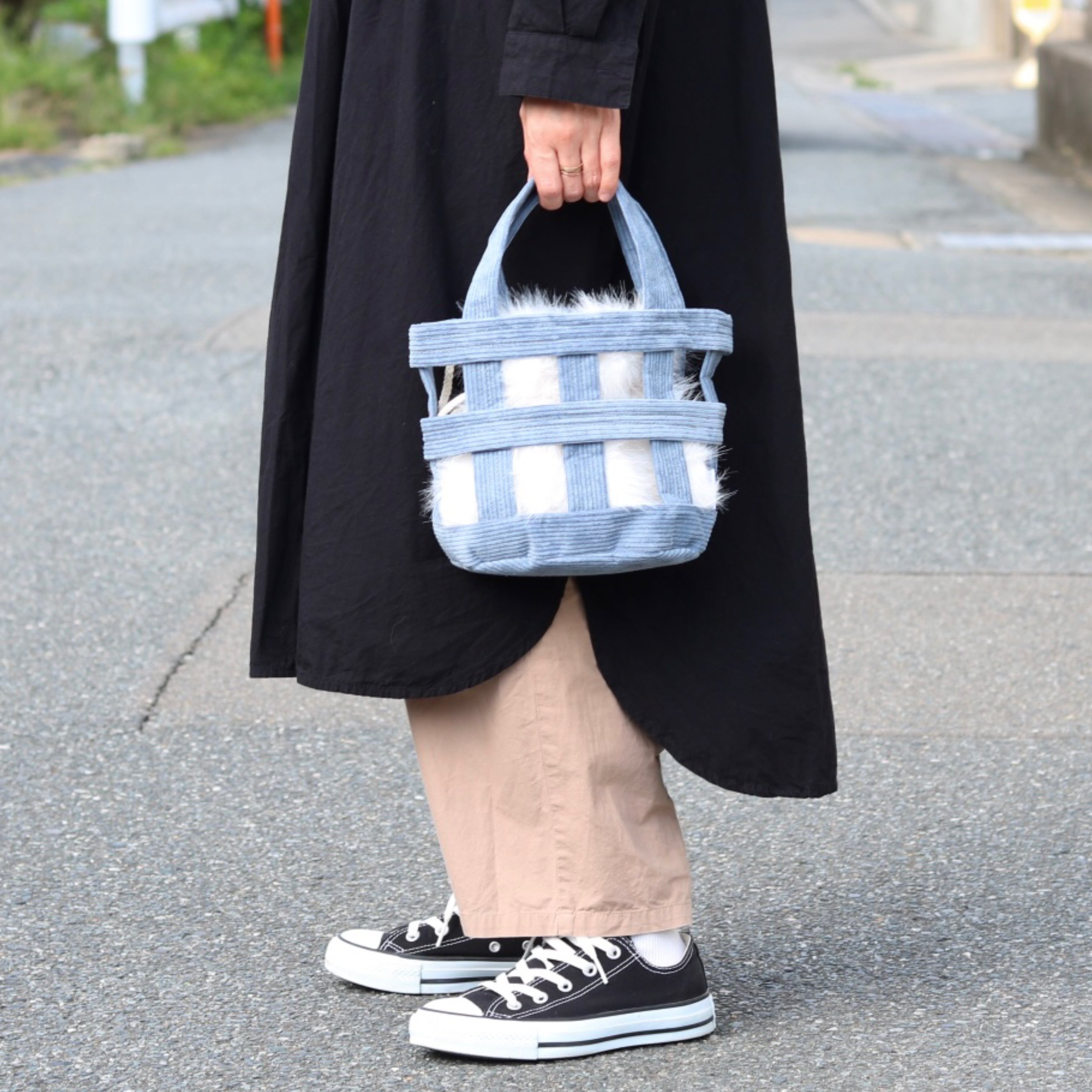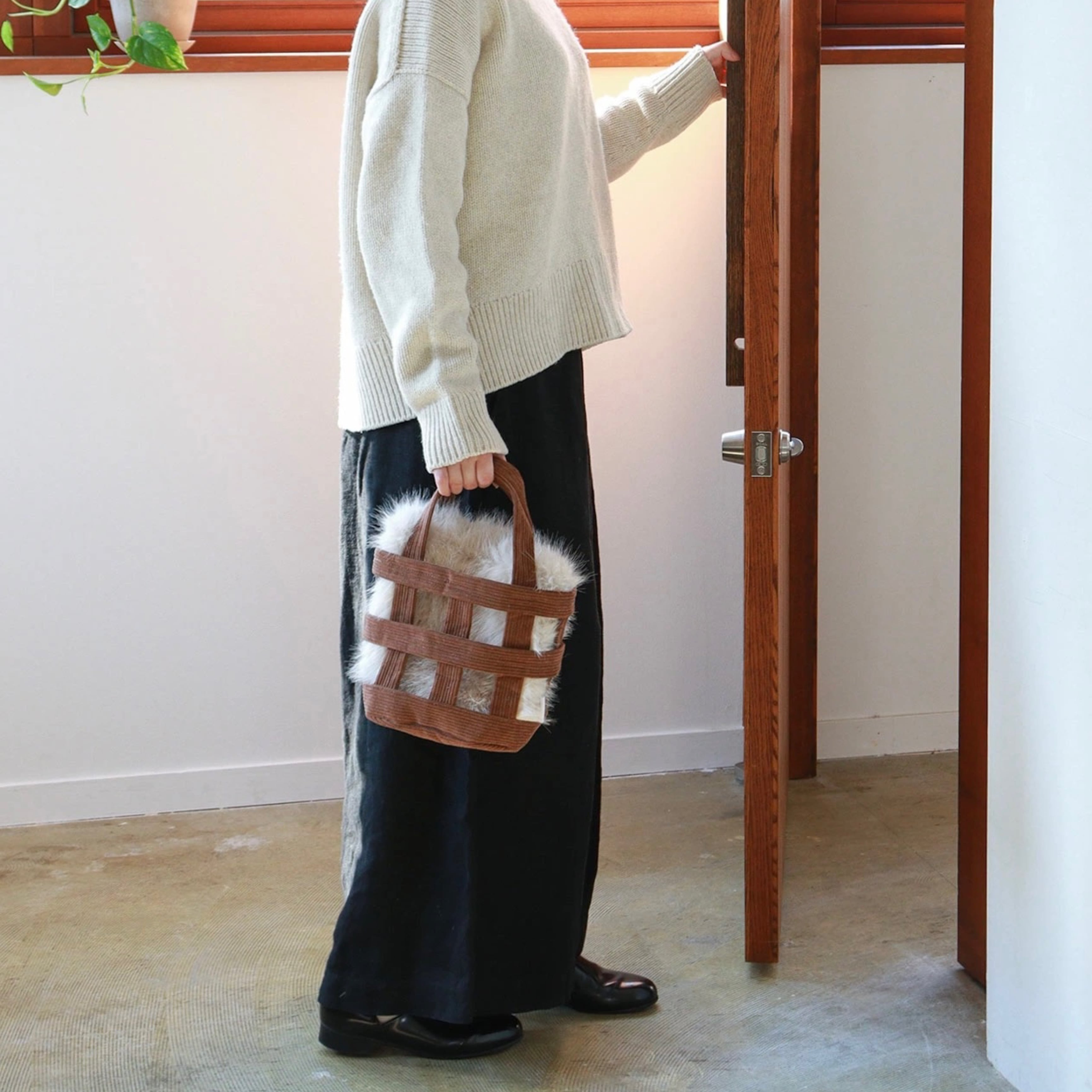 コーデュロイ素材のバスケットに、ふわふわのファー巾着を組み合わせた季節感あふれるバッグです。