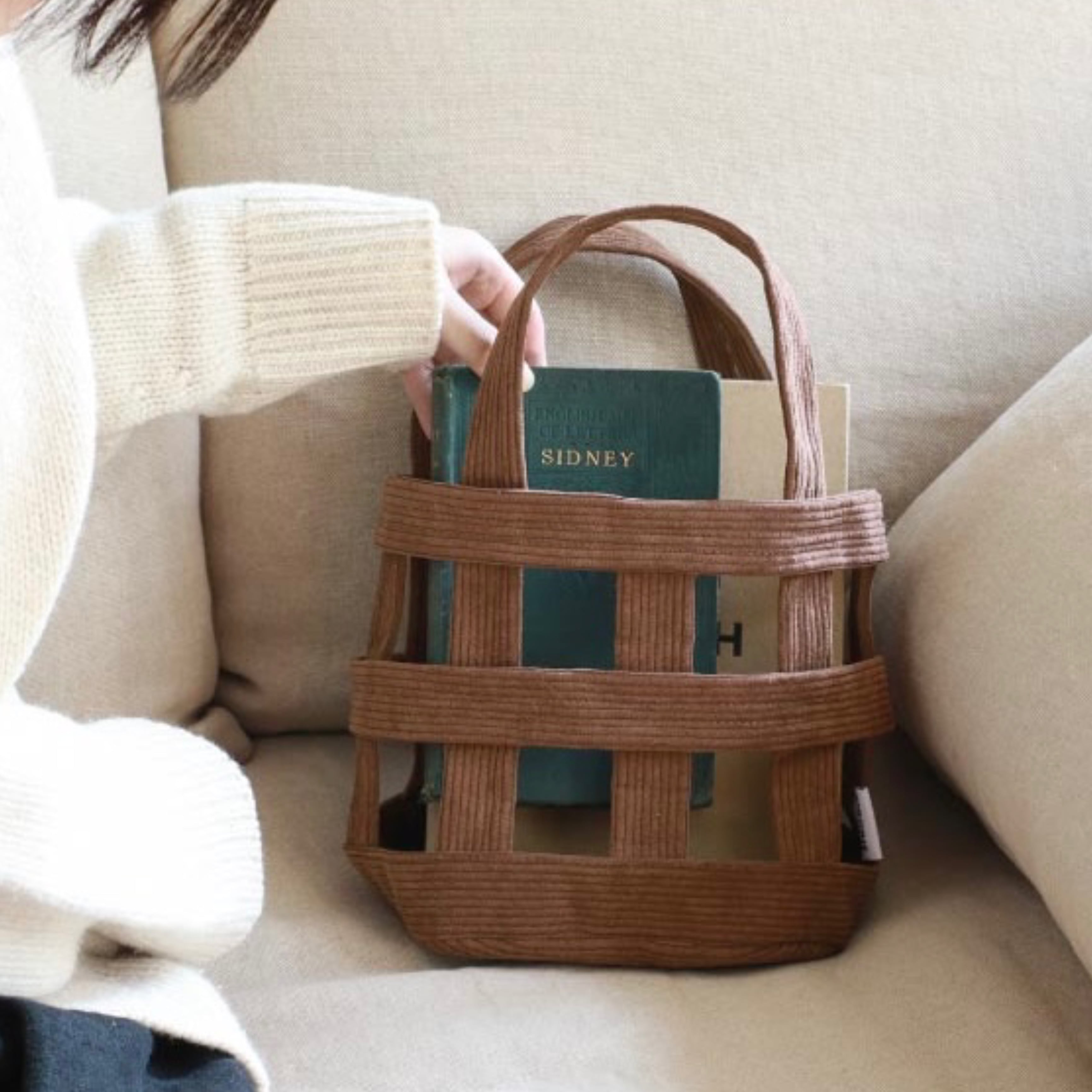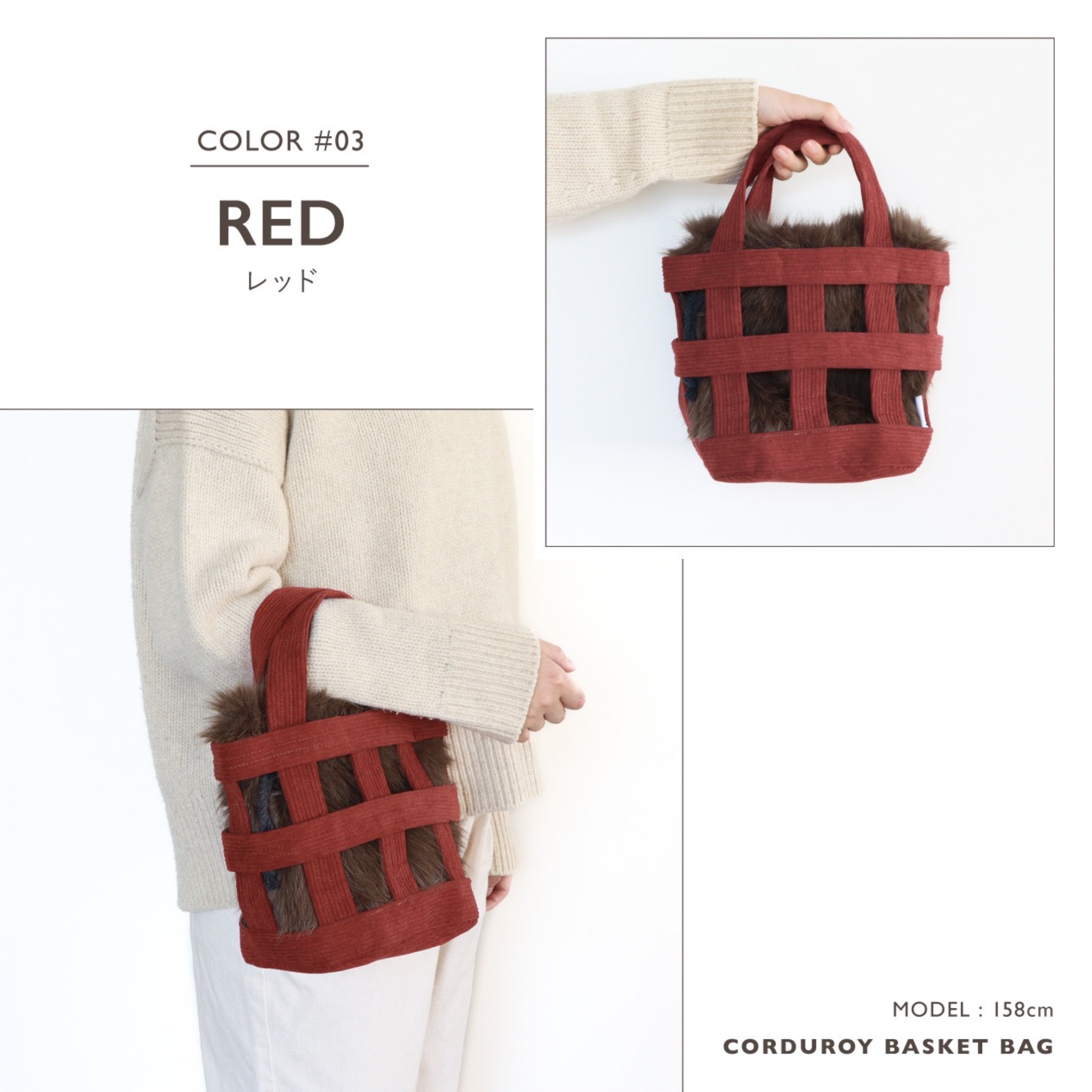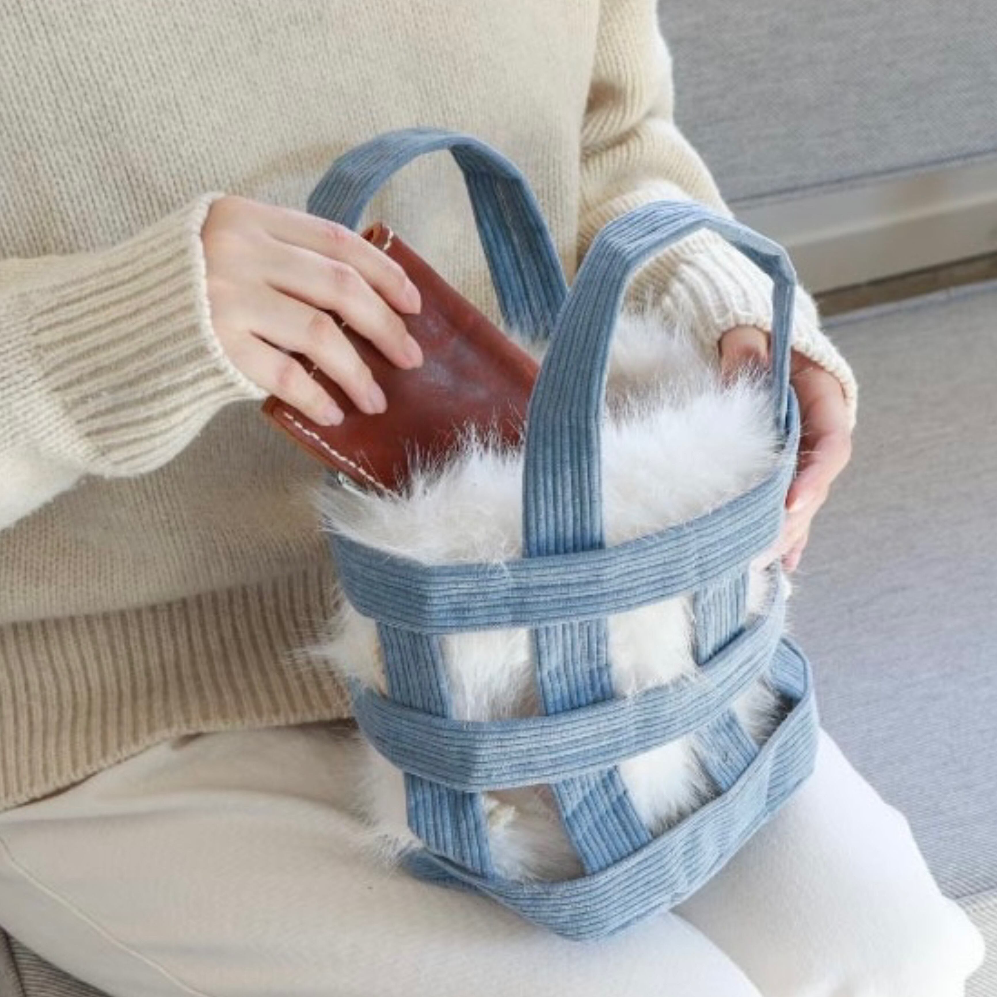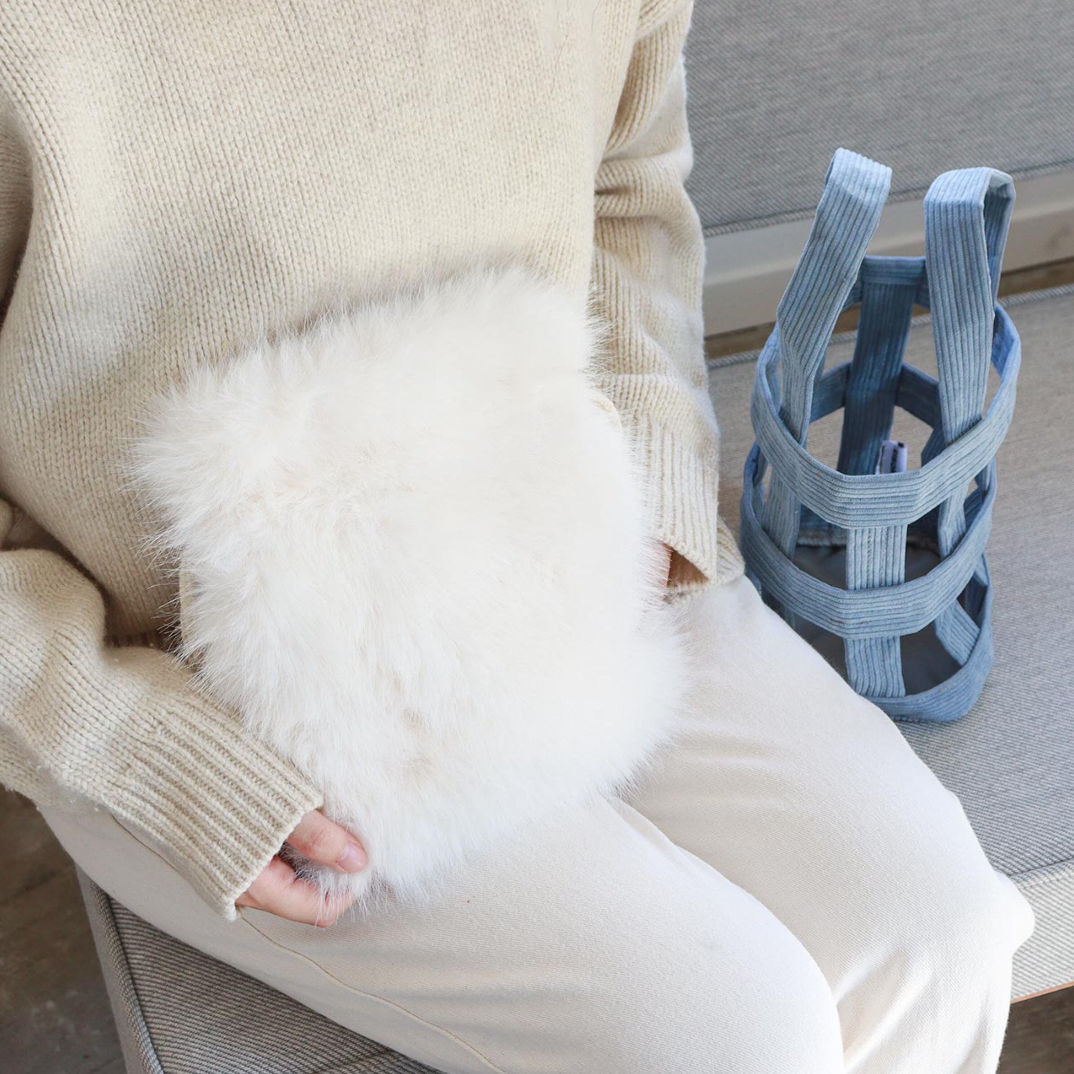 コーデュロイ素材のバスケットに、ふわふわのファー巾着を組み合わせた季節感あふれるバッグです。