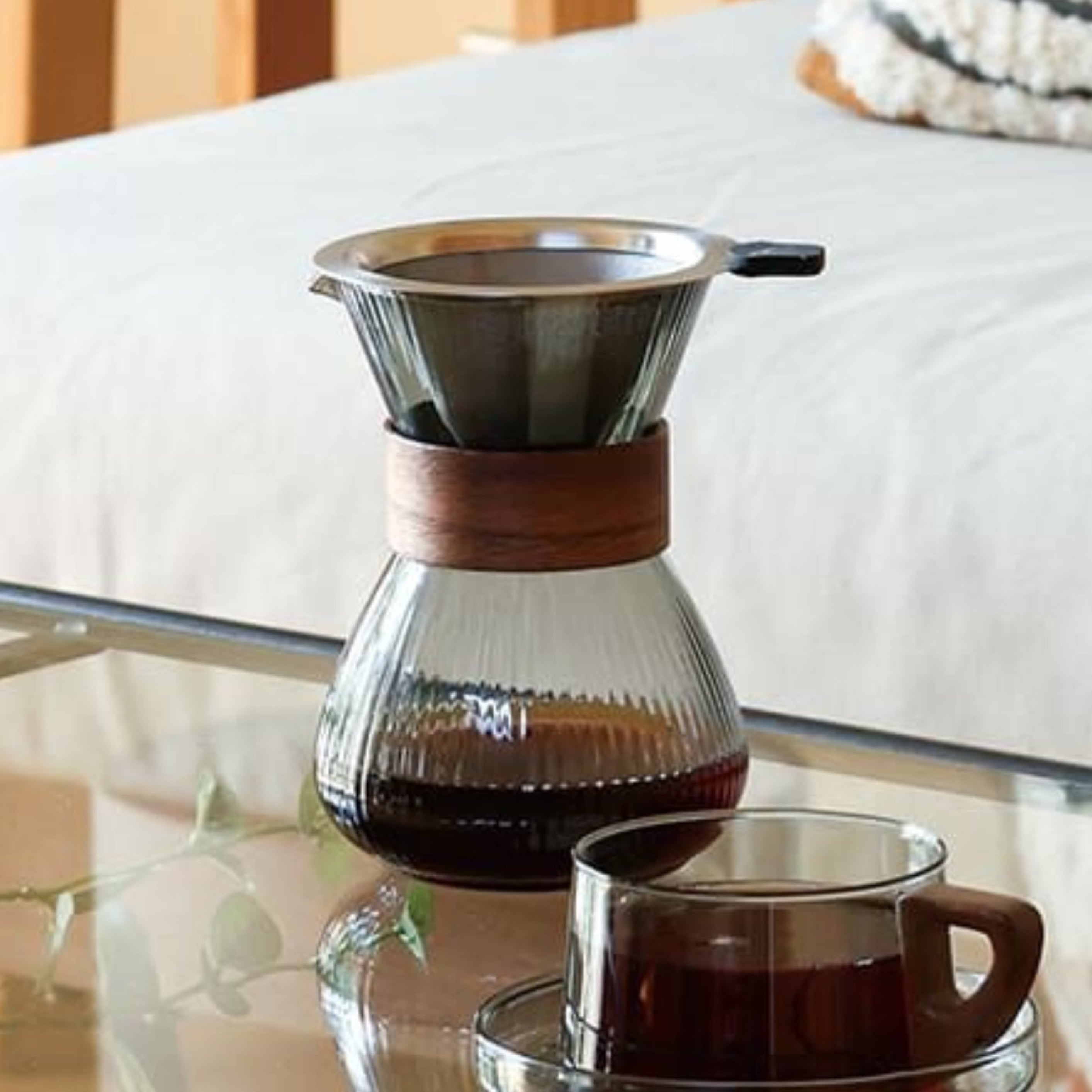 ステンレスドリッパー付きのコーヒーカラフェ。
