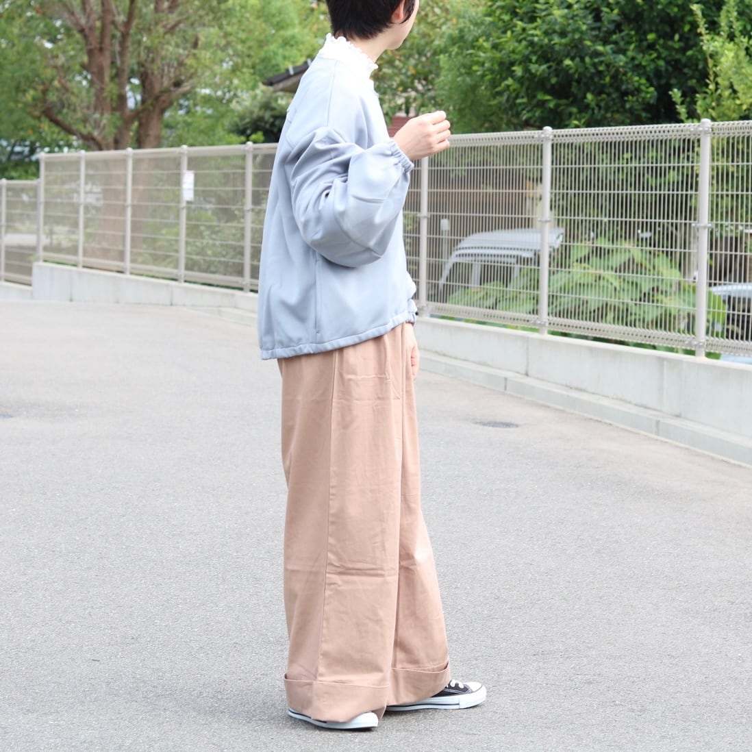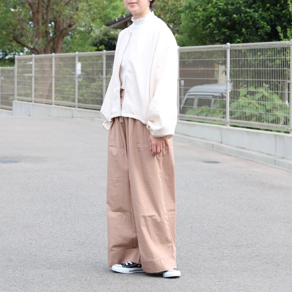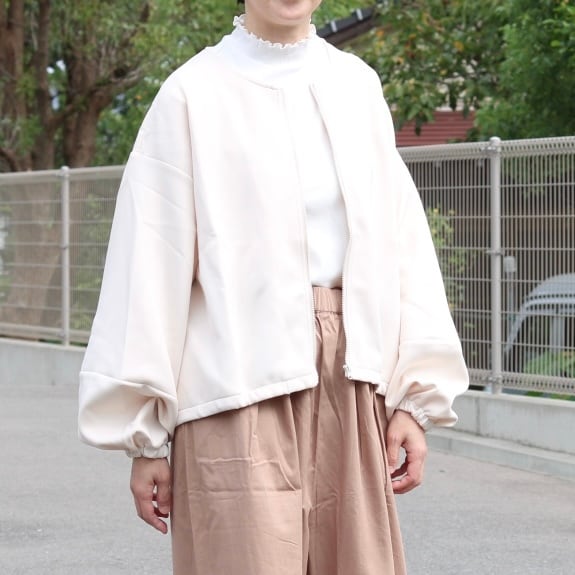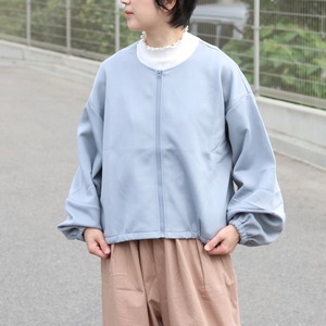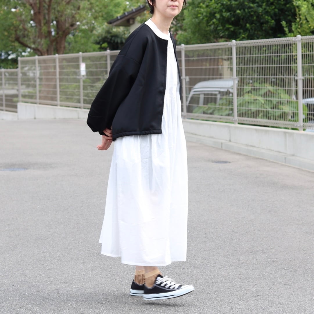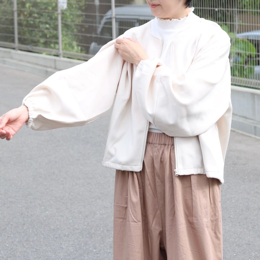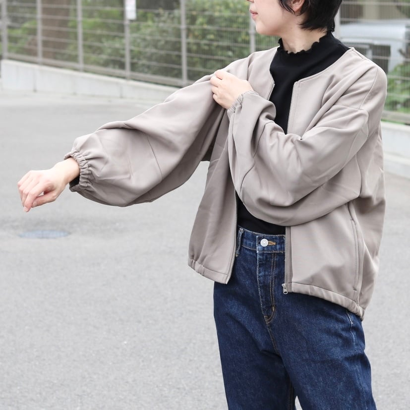 ノーカラーなのでボウタイやリボン、ハイネックなどデザイン性のある襟つきブラウスとも相性が良いです。