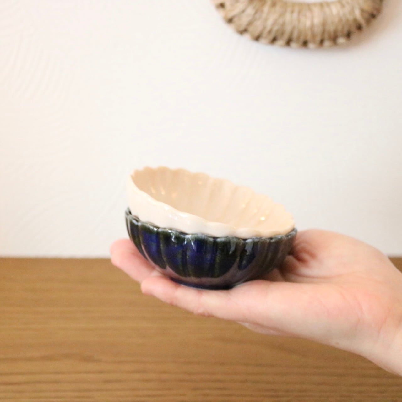 真珠のようなベージュ色とルリの深みのある青色は、どちらも食卓のコーディネートに使いやすい色合いです。