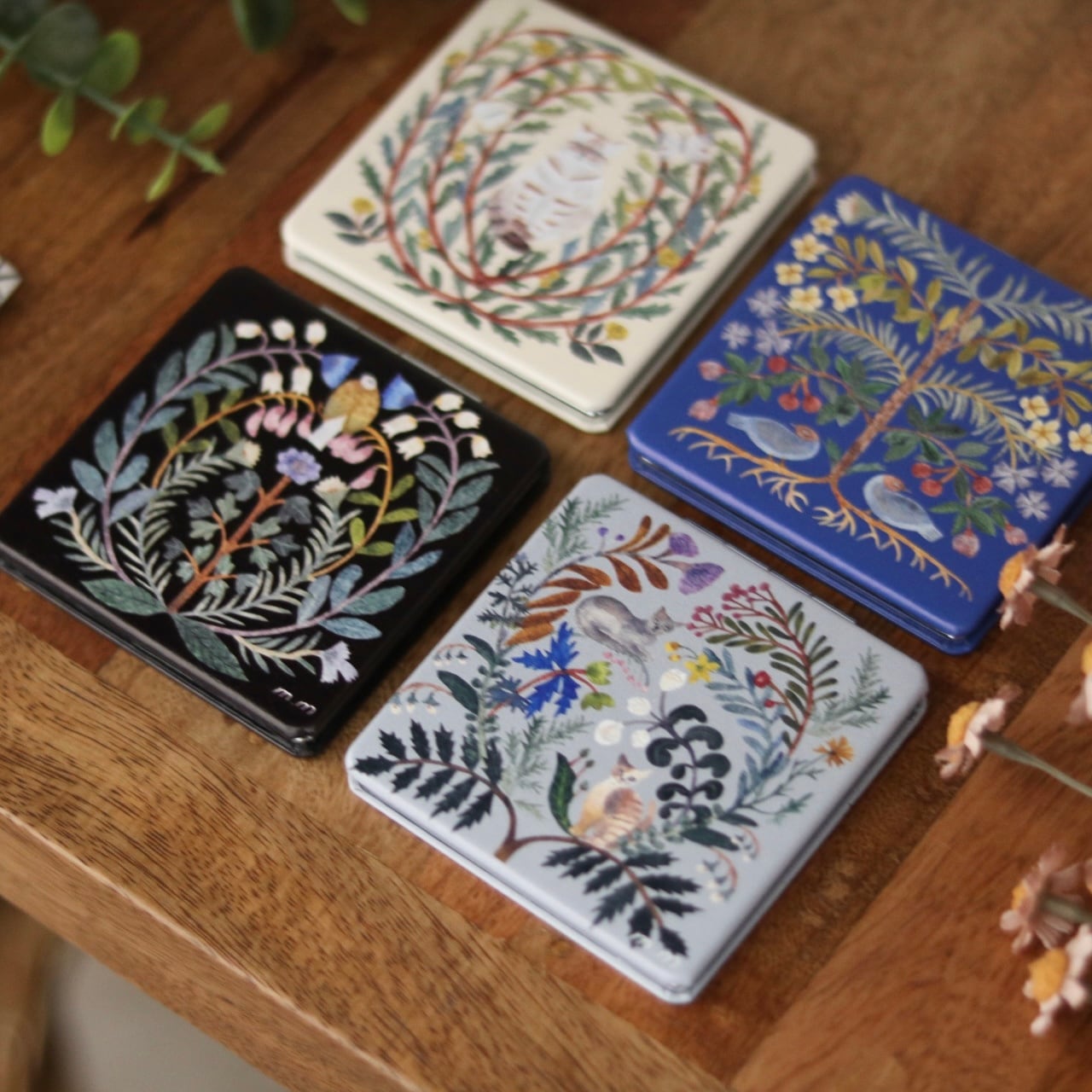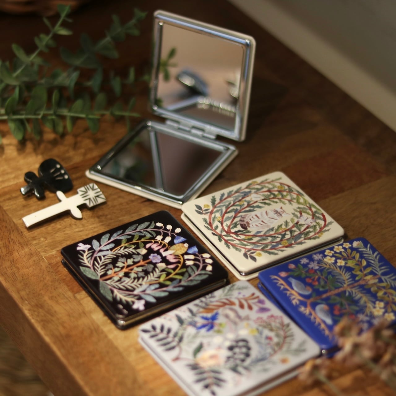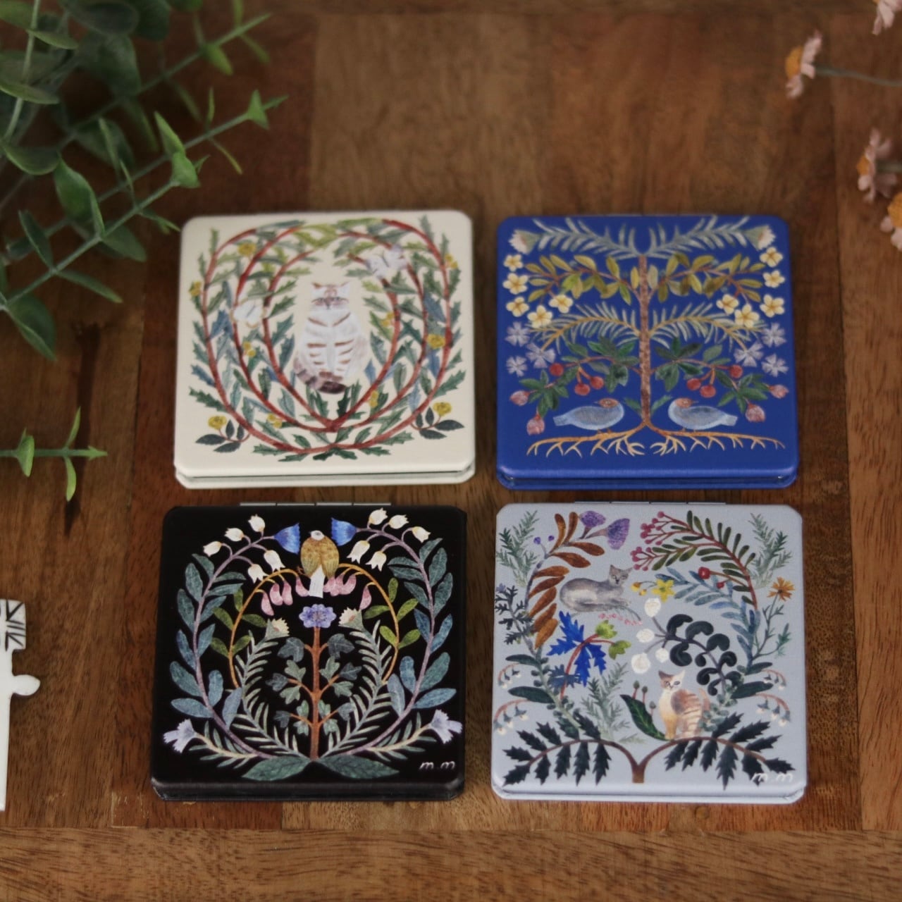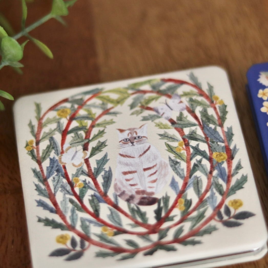植物と動物たちが寄り添う、切り絵デザインが印象的なコンパクトミラーは、等倍鏡と、細かいチェックに便利な拡大鏡の両面仕様。