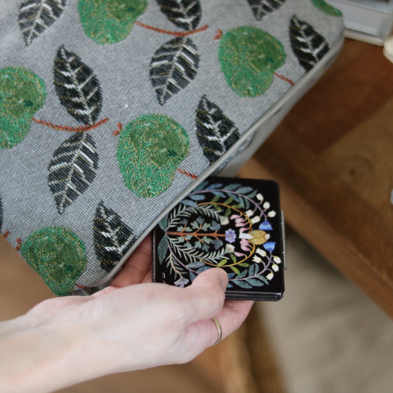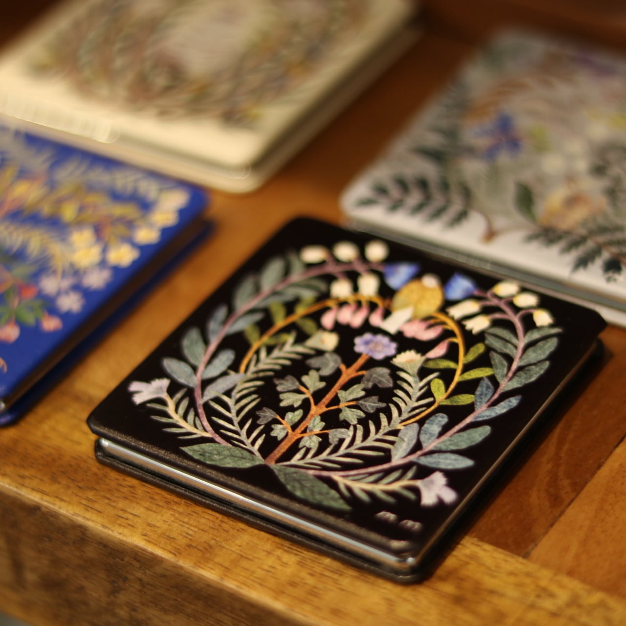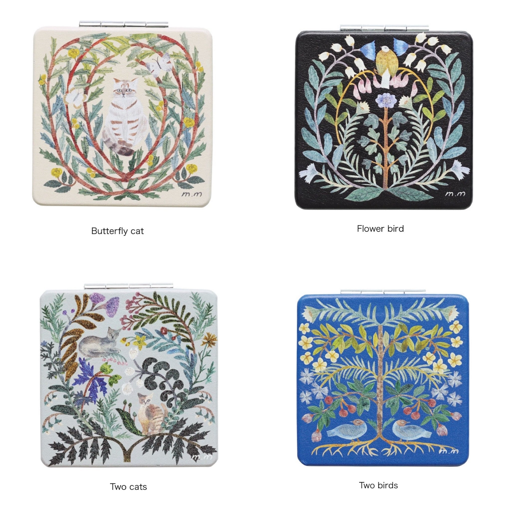 植物と動物たちが寄り添う、切り絵デザインが印象的なコンパクトミラーは、等倍鏡と、細かいチェックに便利な拡大鏡の両面仕様。