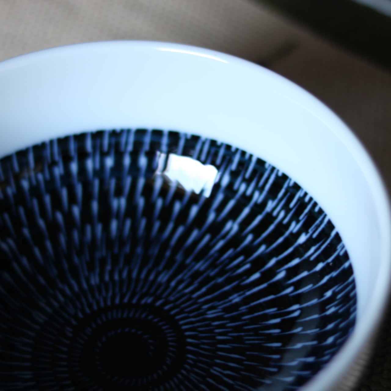 飛び鉋の模様が施された深い色合いの藍が美しい器です。