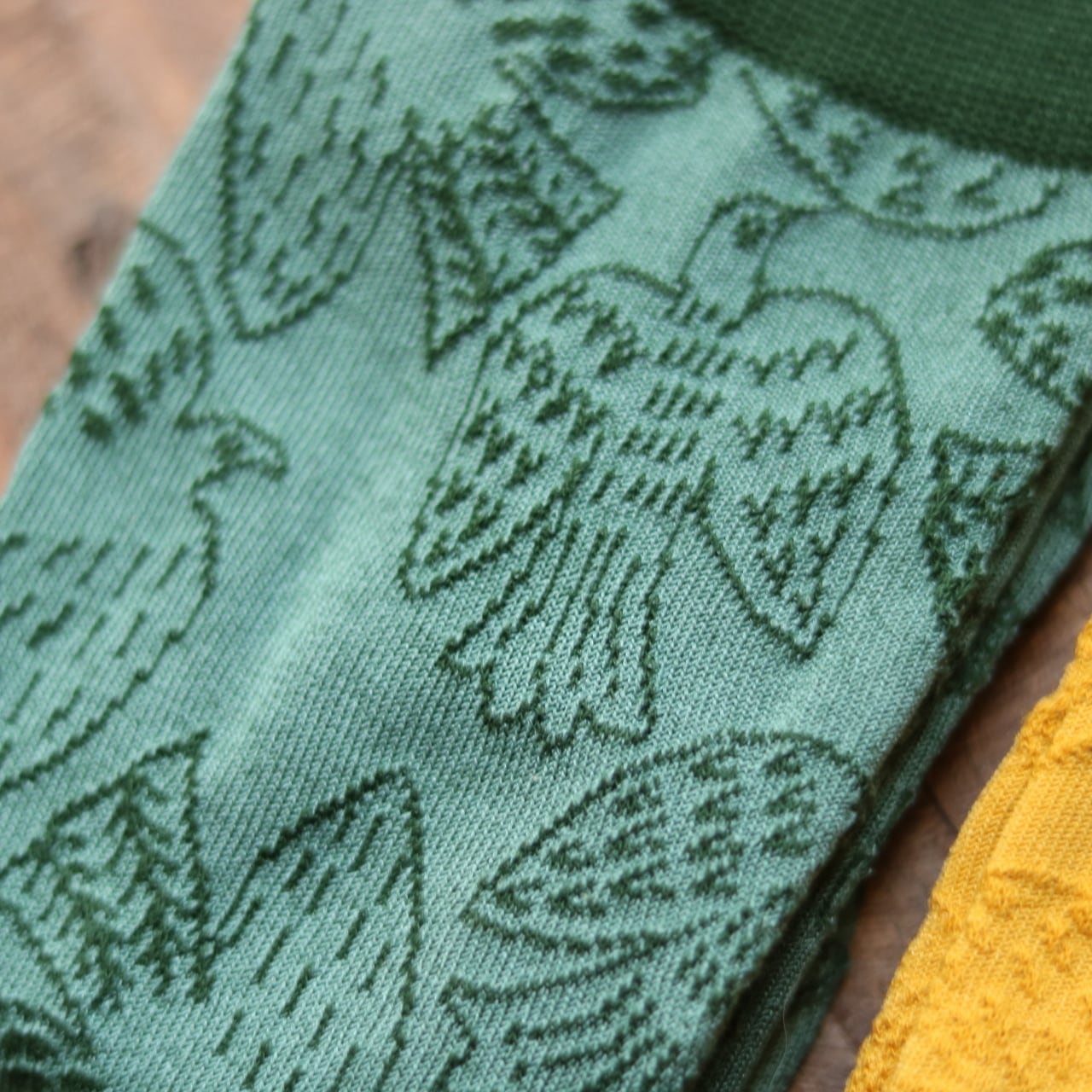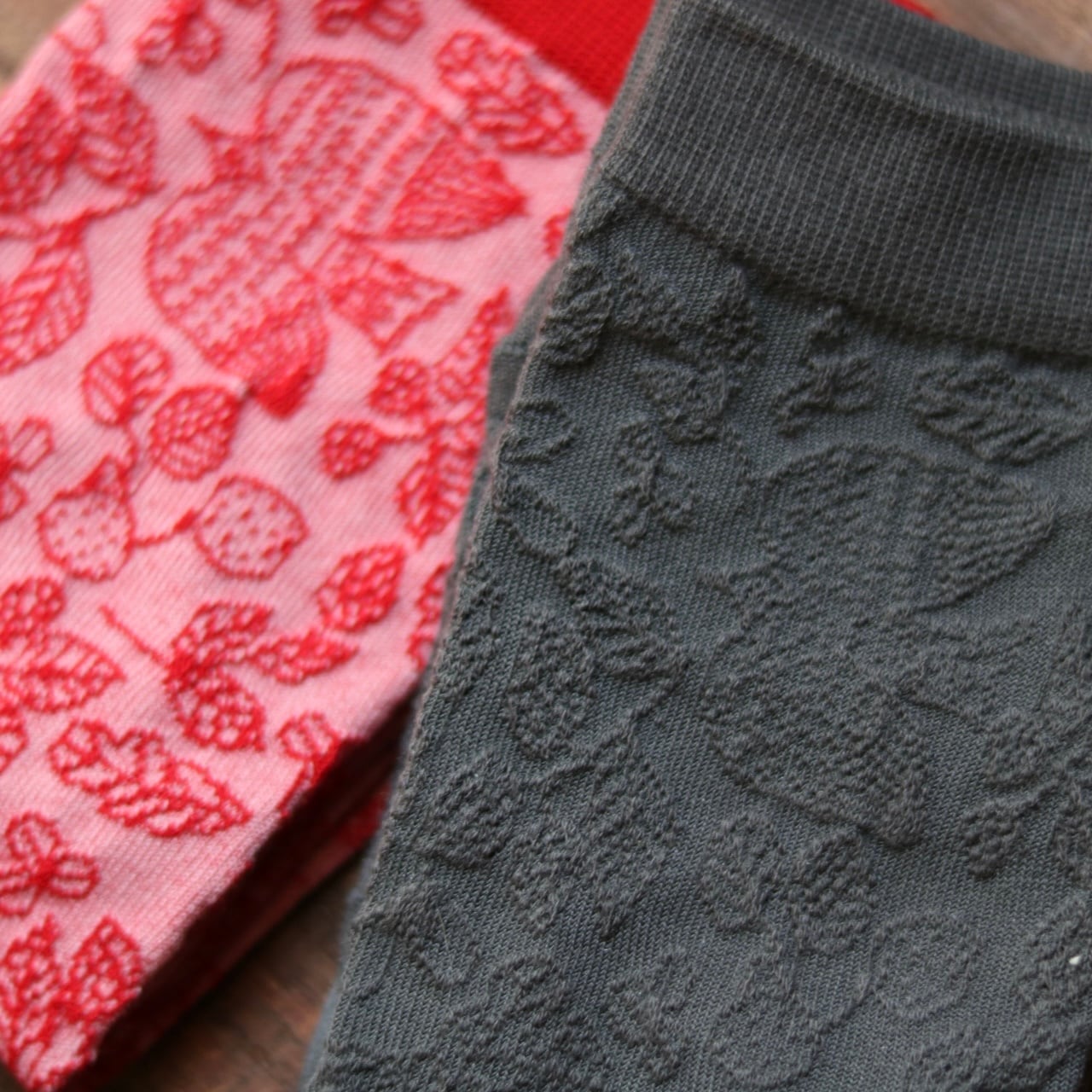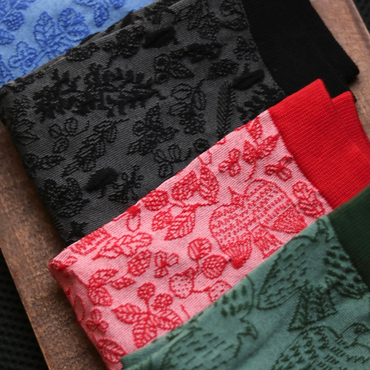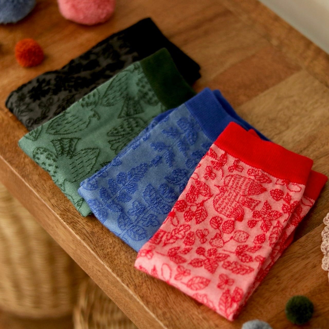 松尾ミユキさんの大人かわいいイラストが織られた靴下
