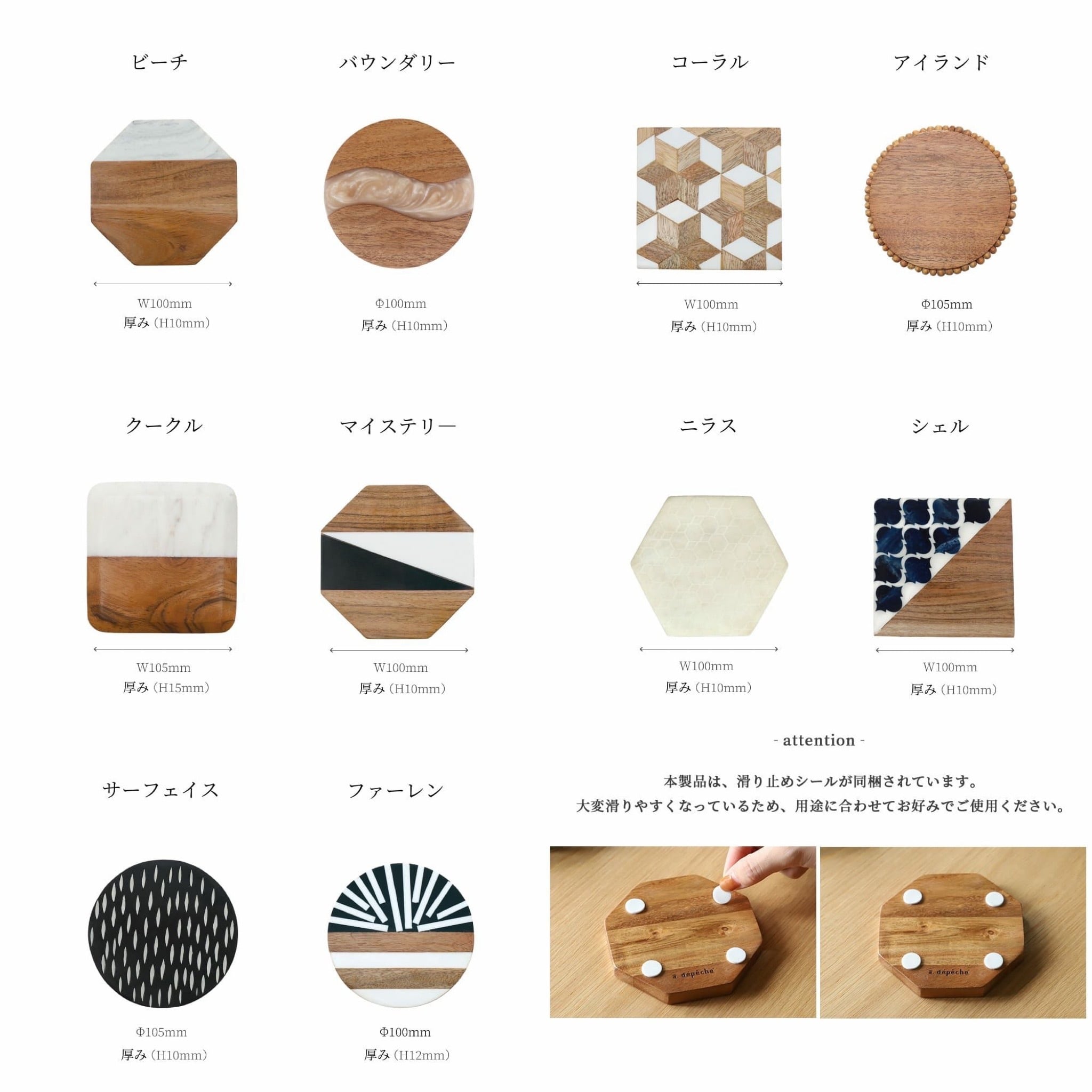 サンゴ、水面、砂浜、神秘的な…など海に纏わる表現で一つ一つ名前がついているMaare コースターです。