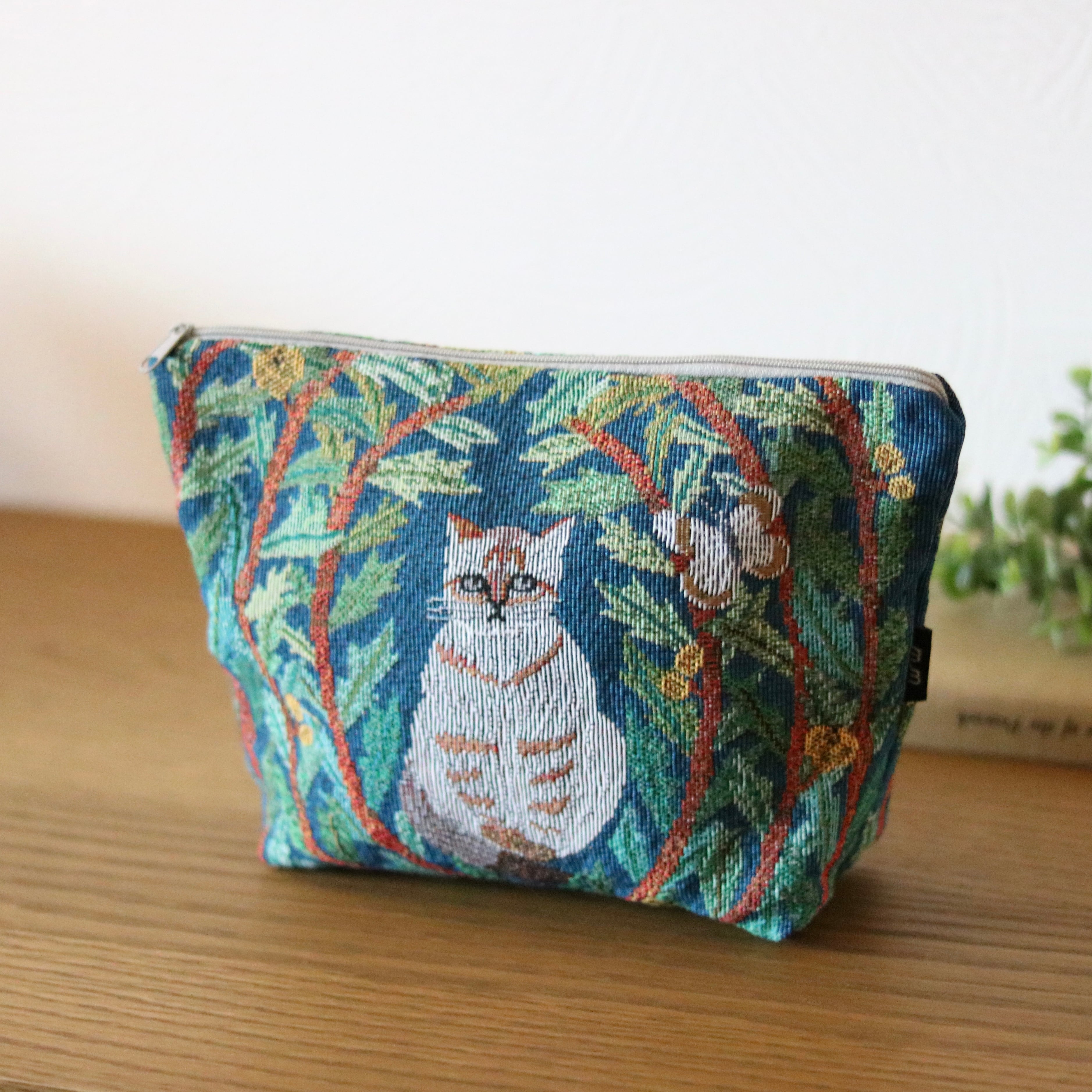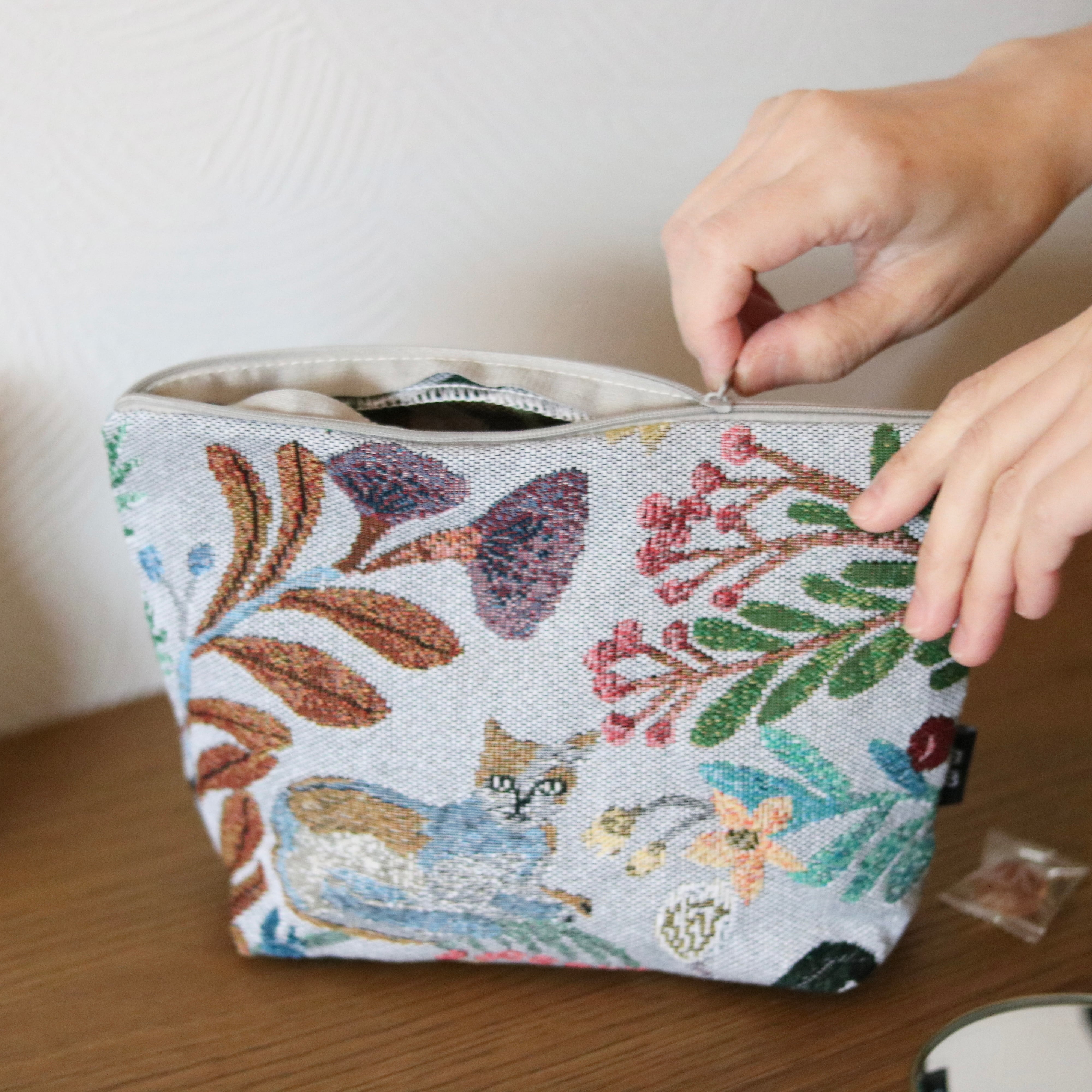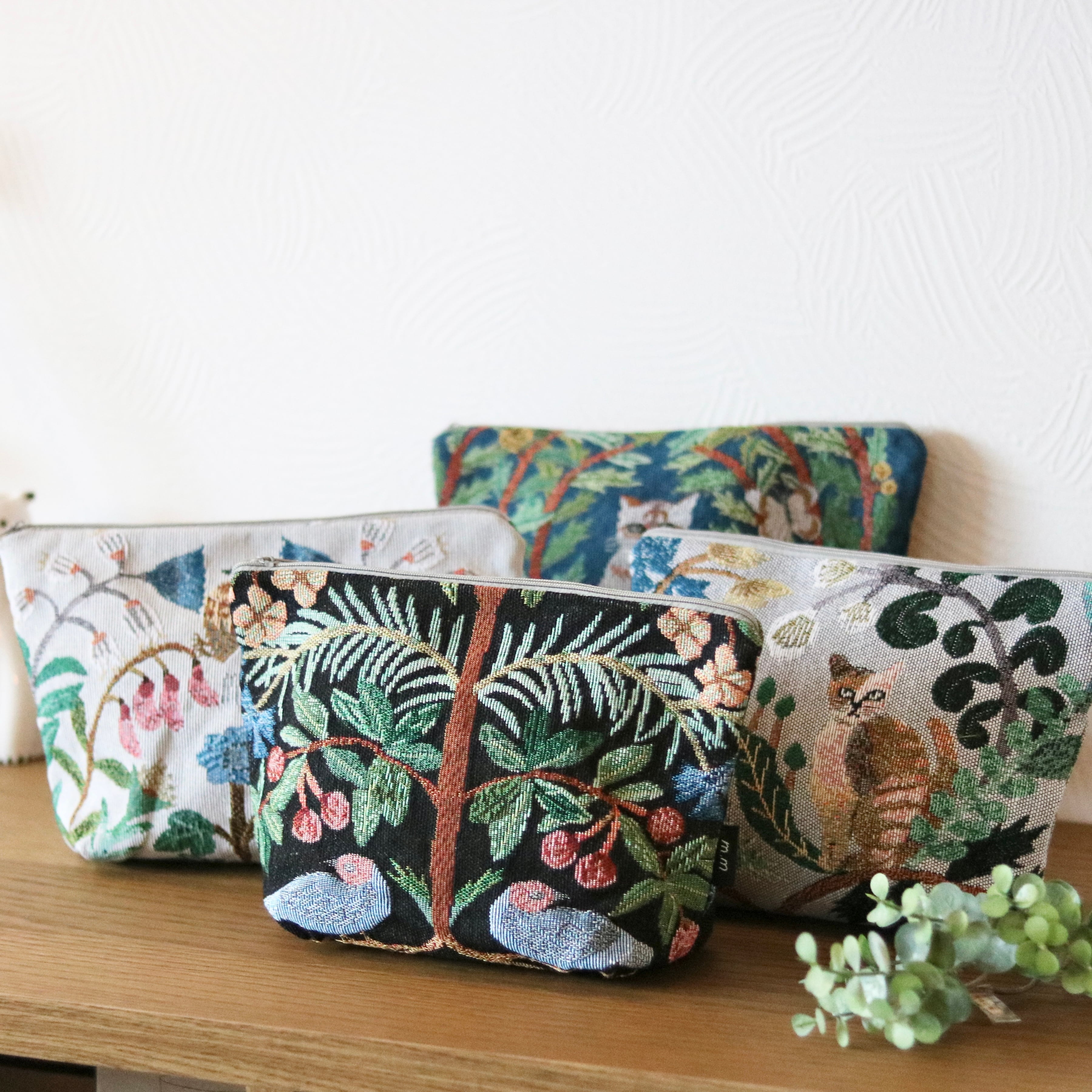 松尾ミユキさんの描くイラストが織り込まれたゴブラン素材のポーチ