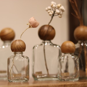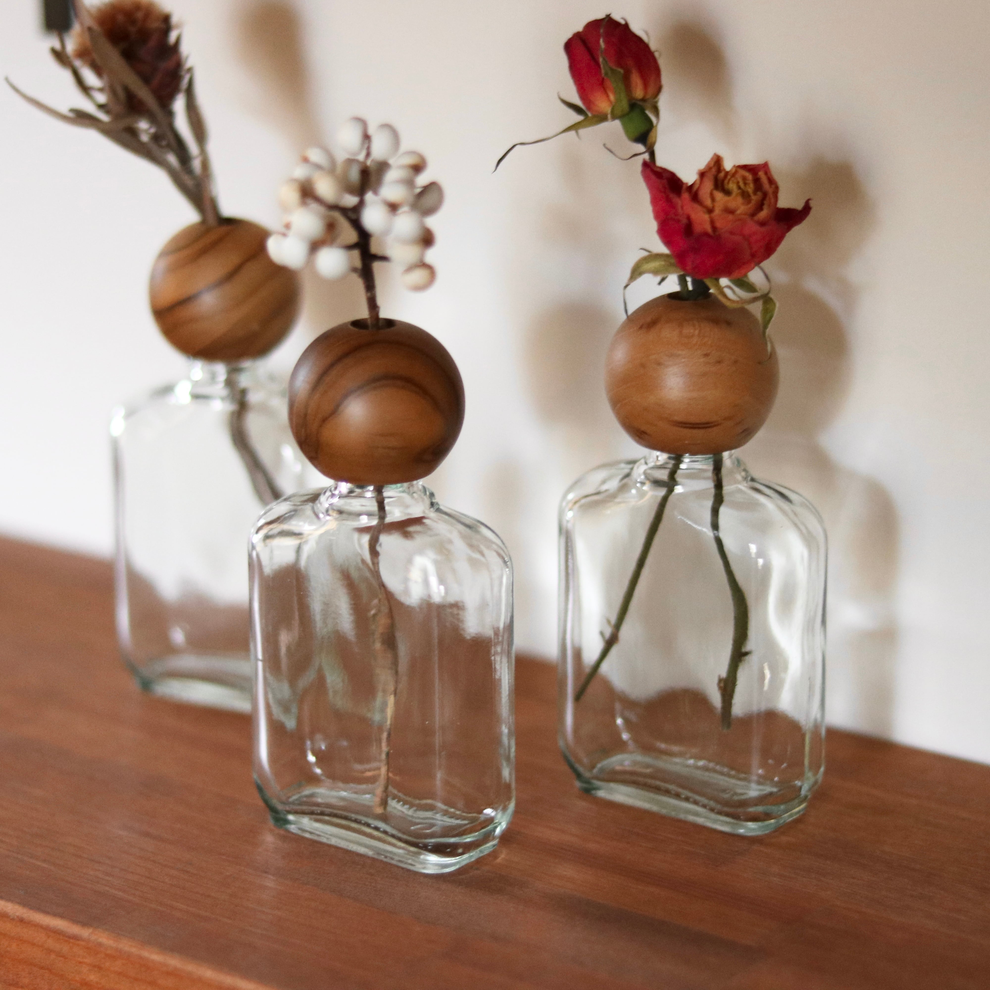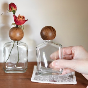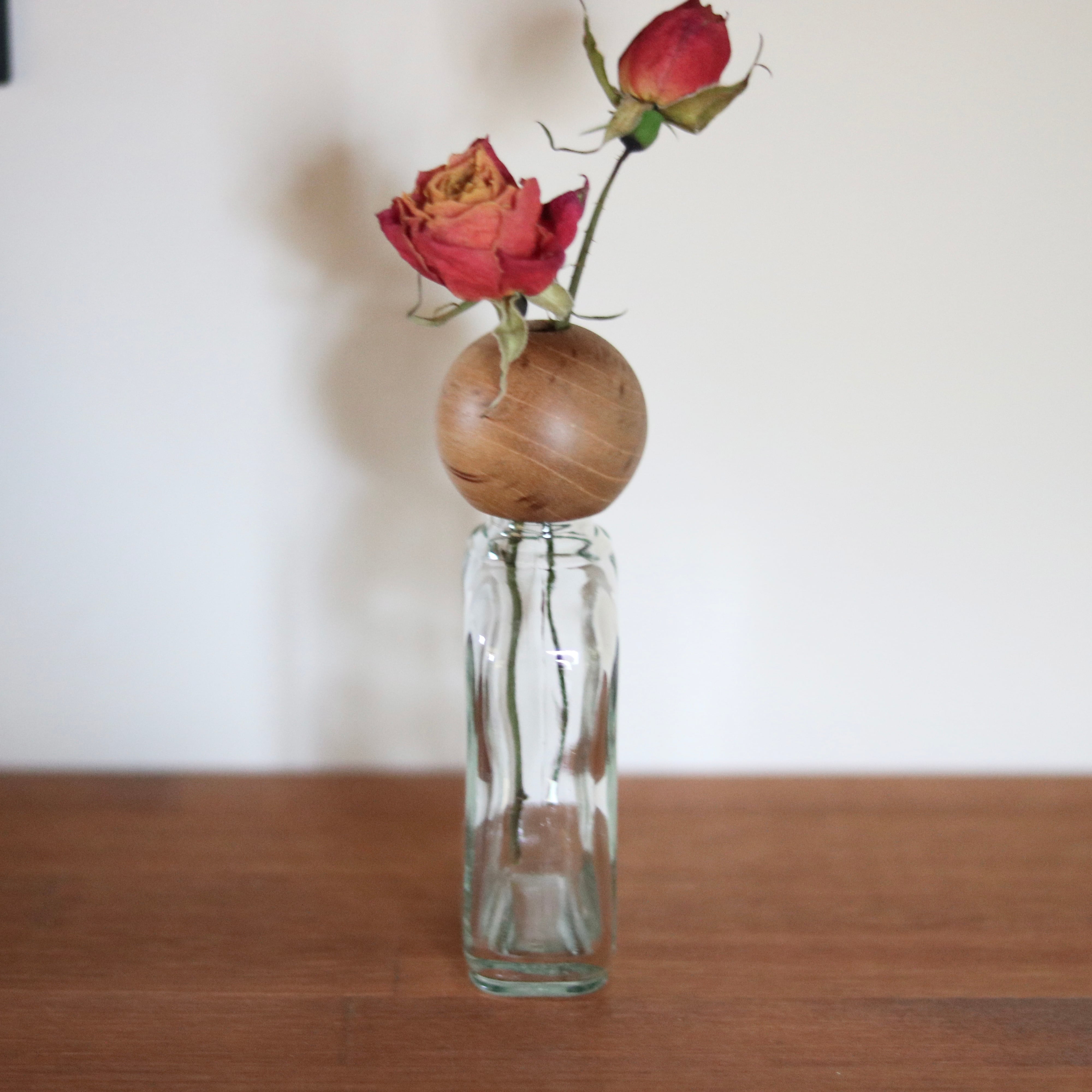 異素材の組み合わせ 木とガラスが織りなすナチュラルで洗練されたフラワーベースです。