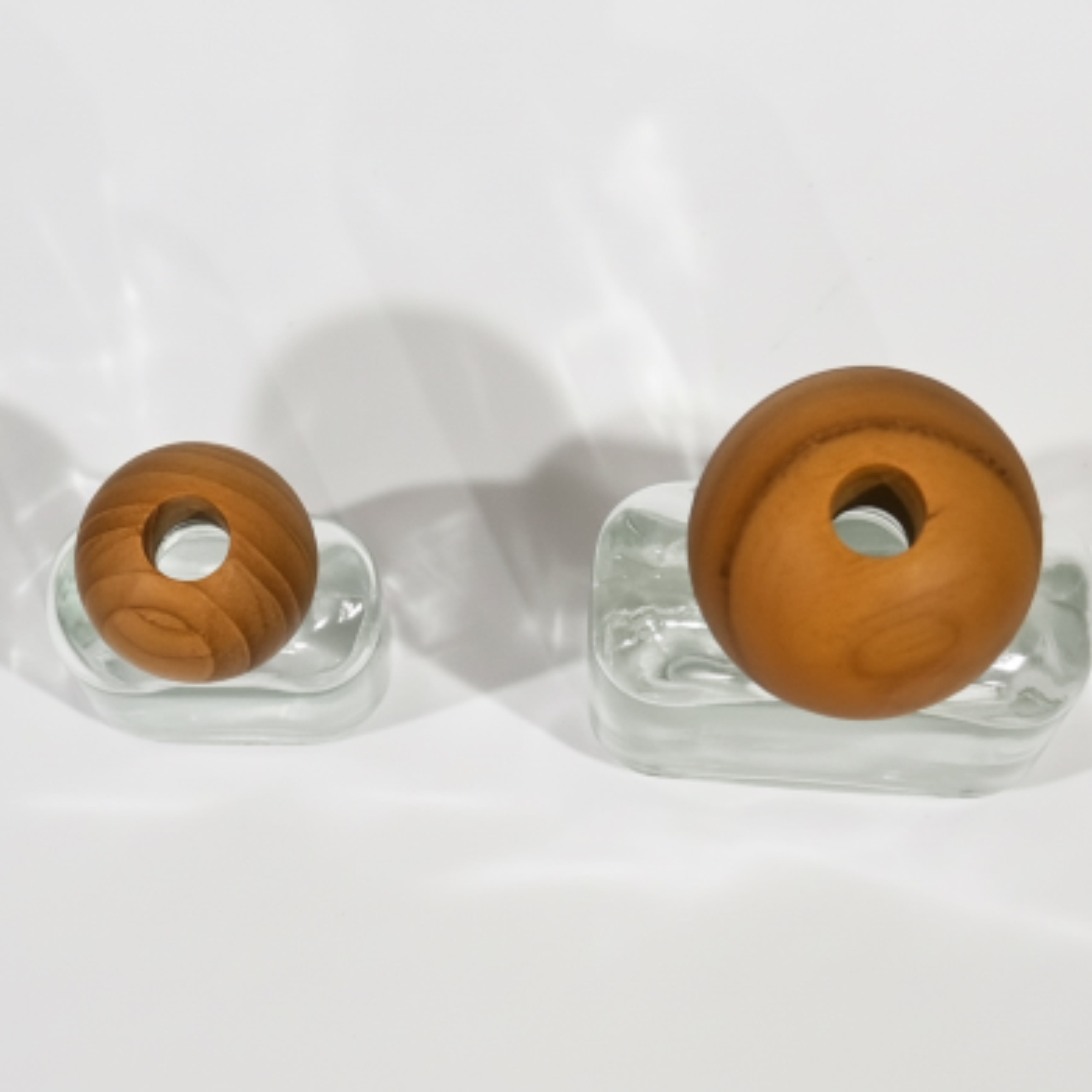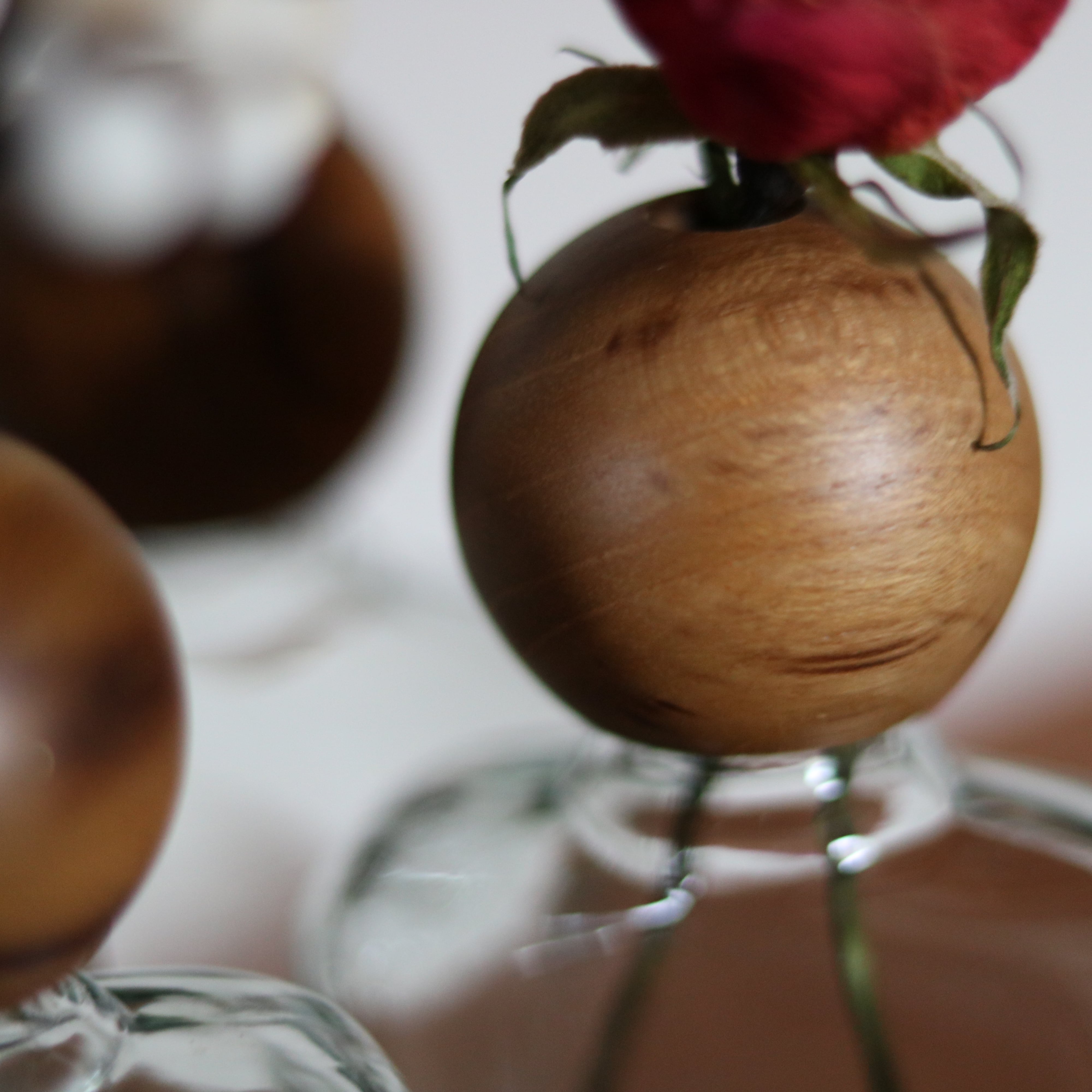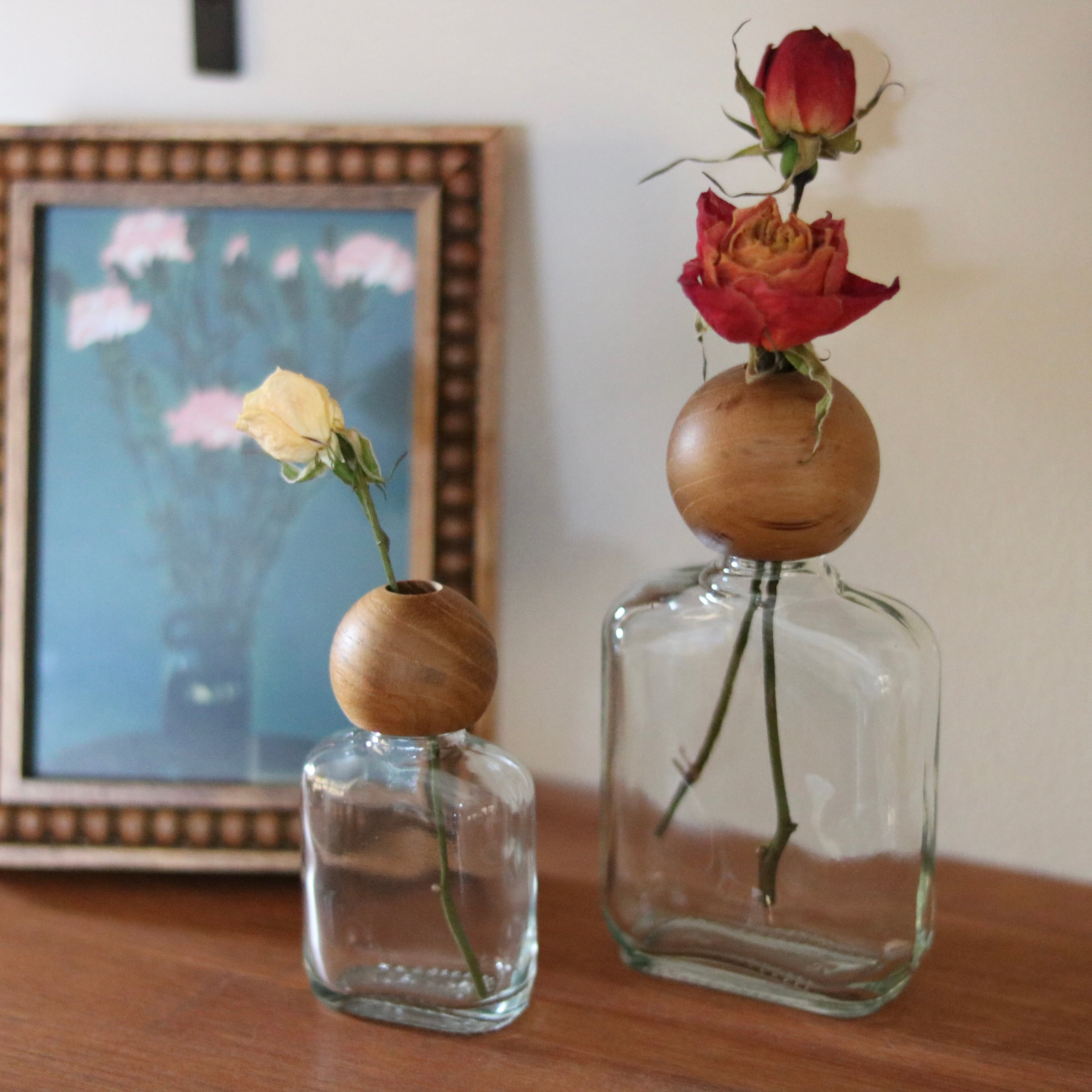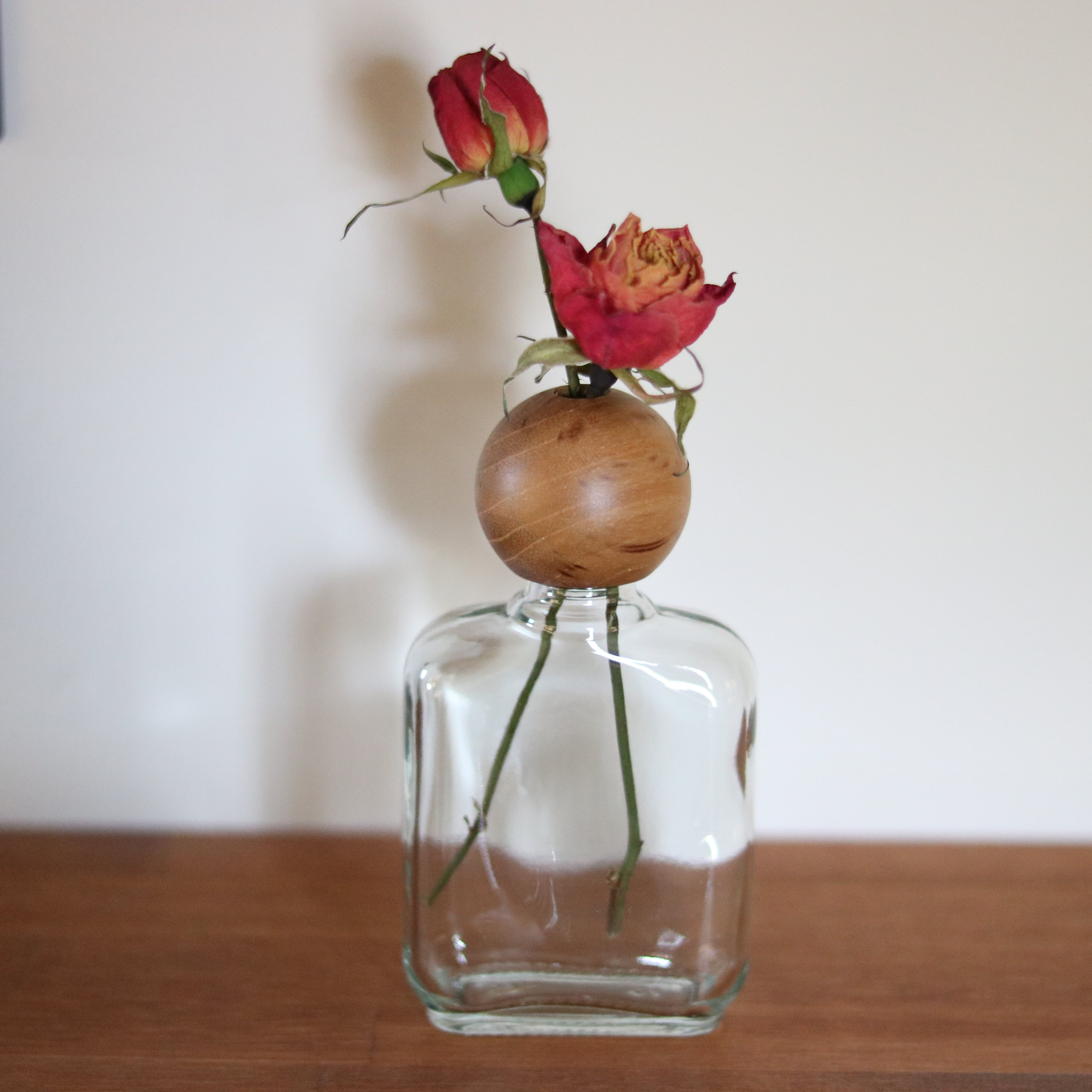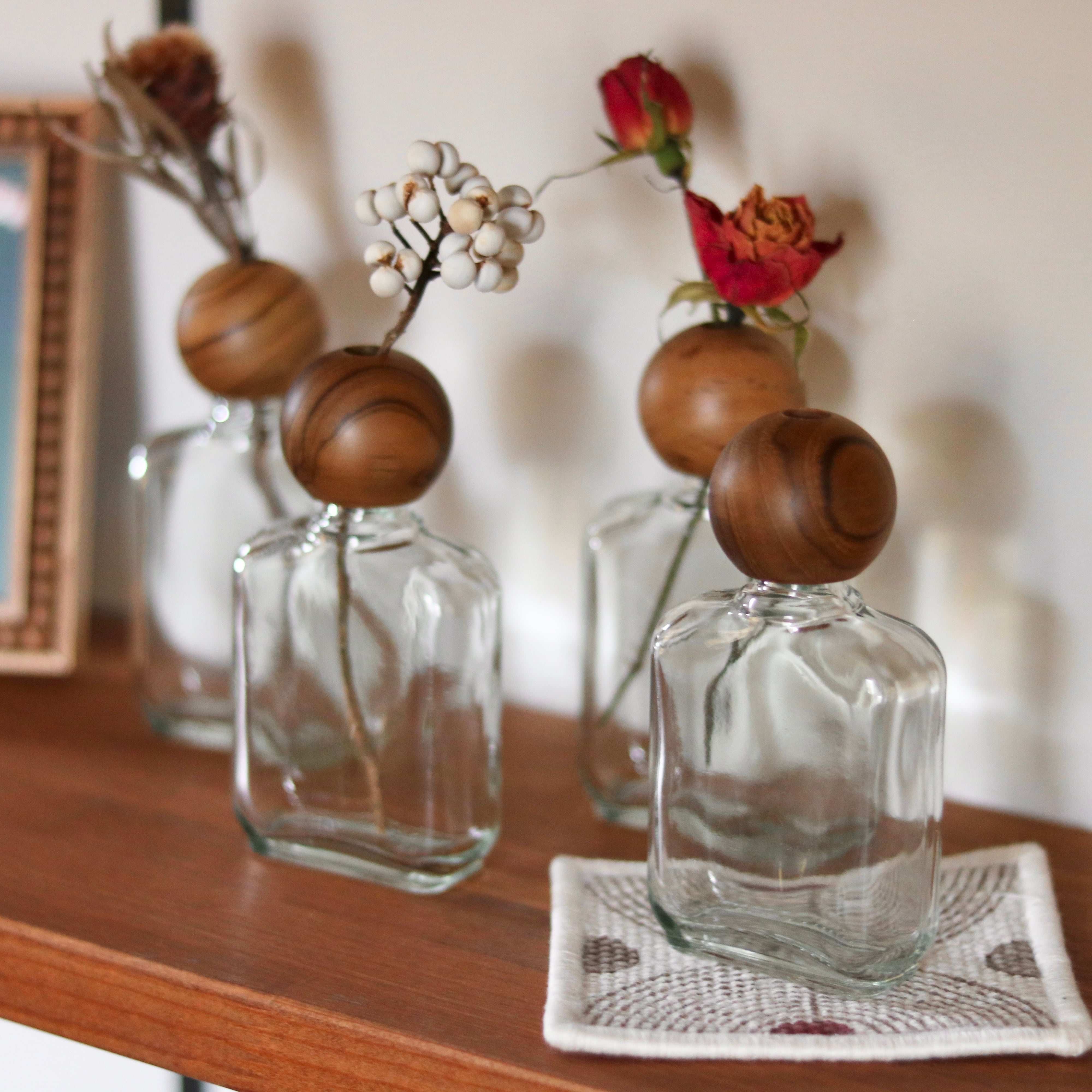 一輪の花を優しく引き立てるチークウッドとガラスのフラワーベース