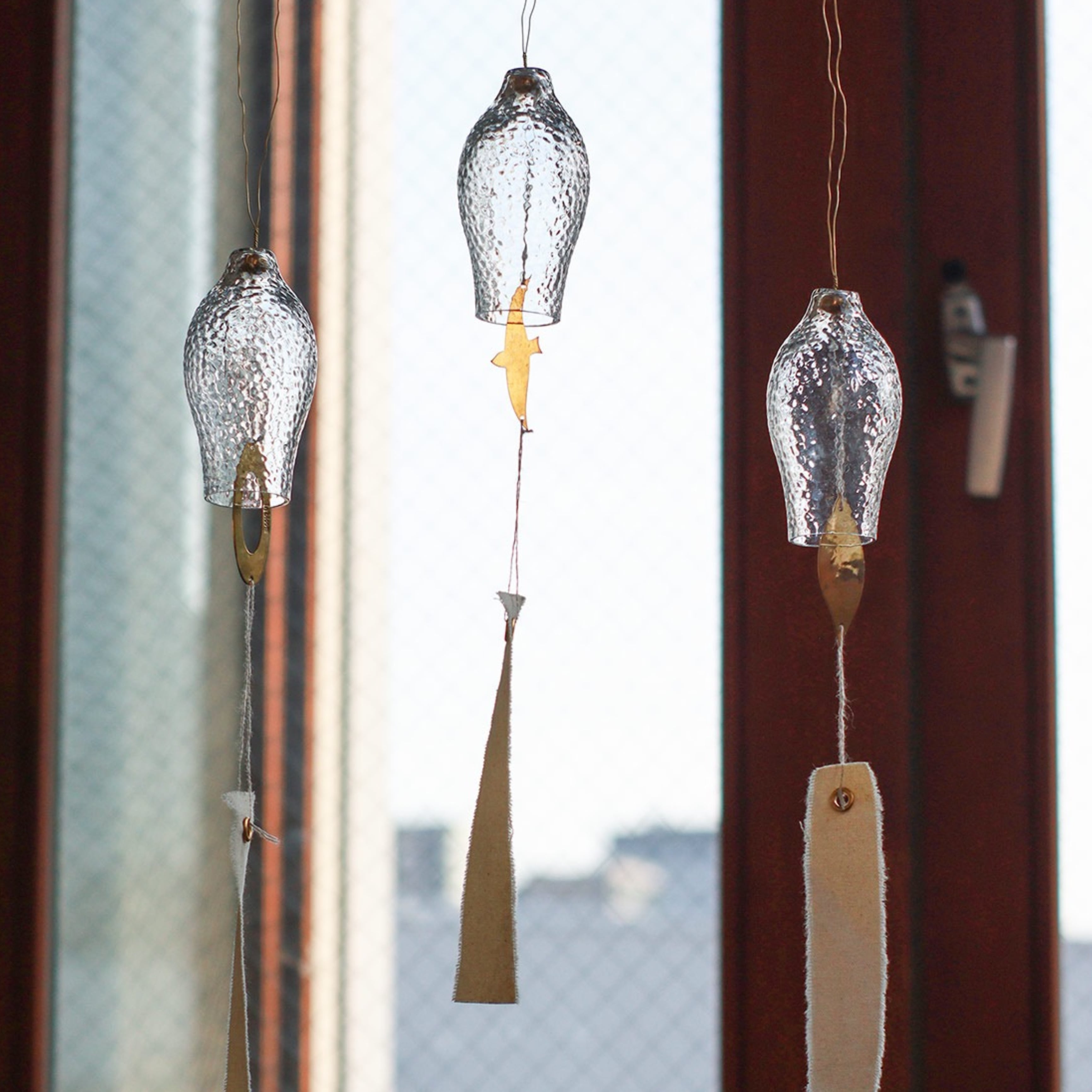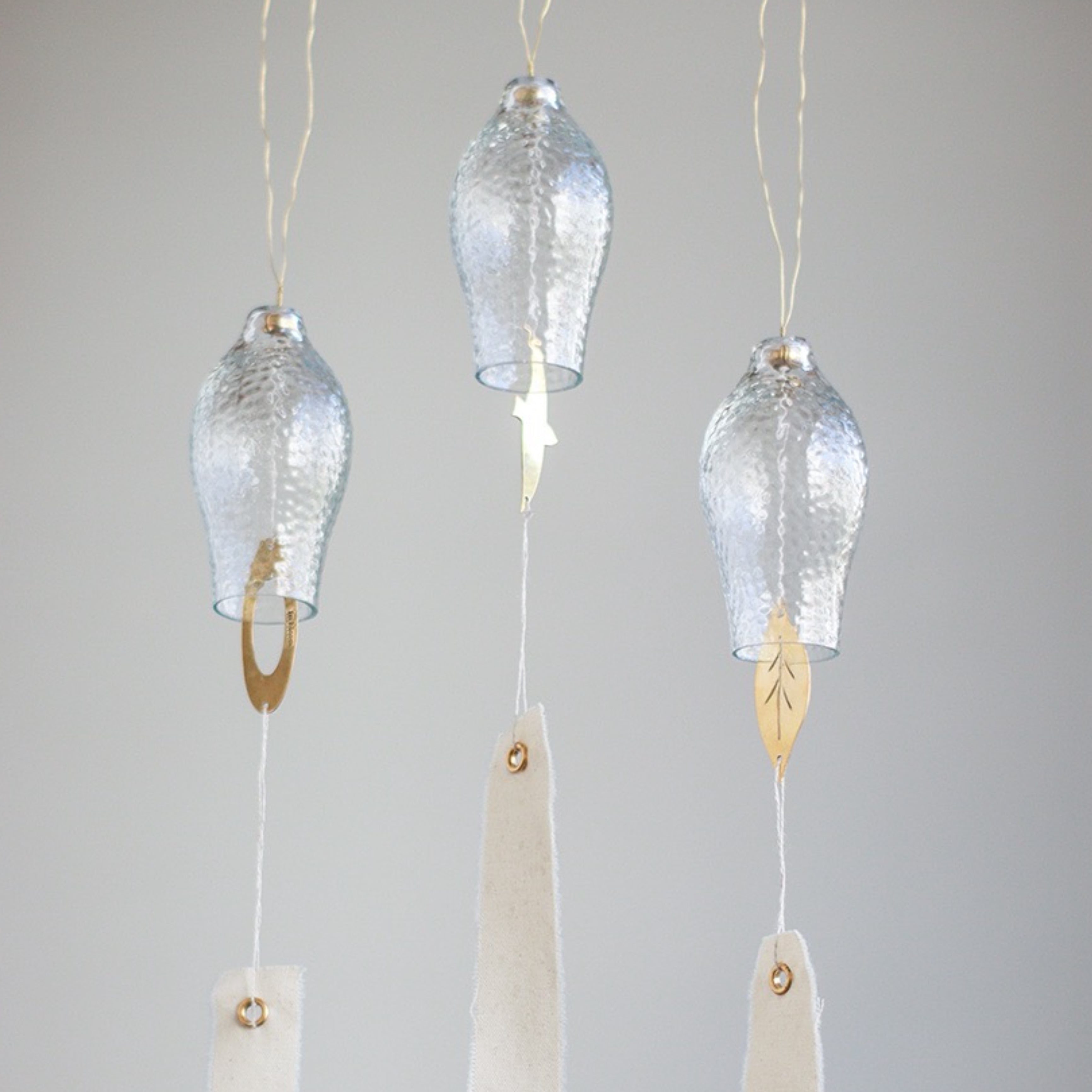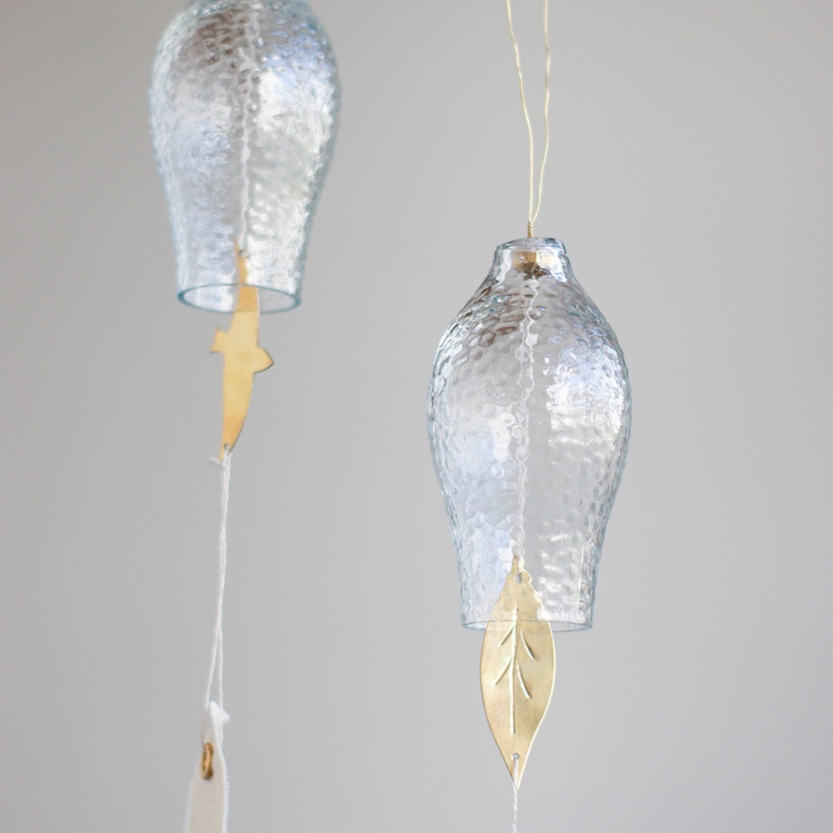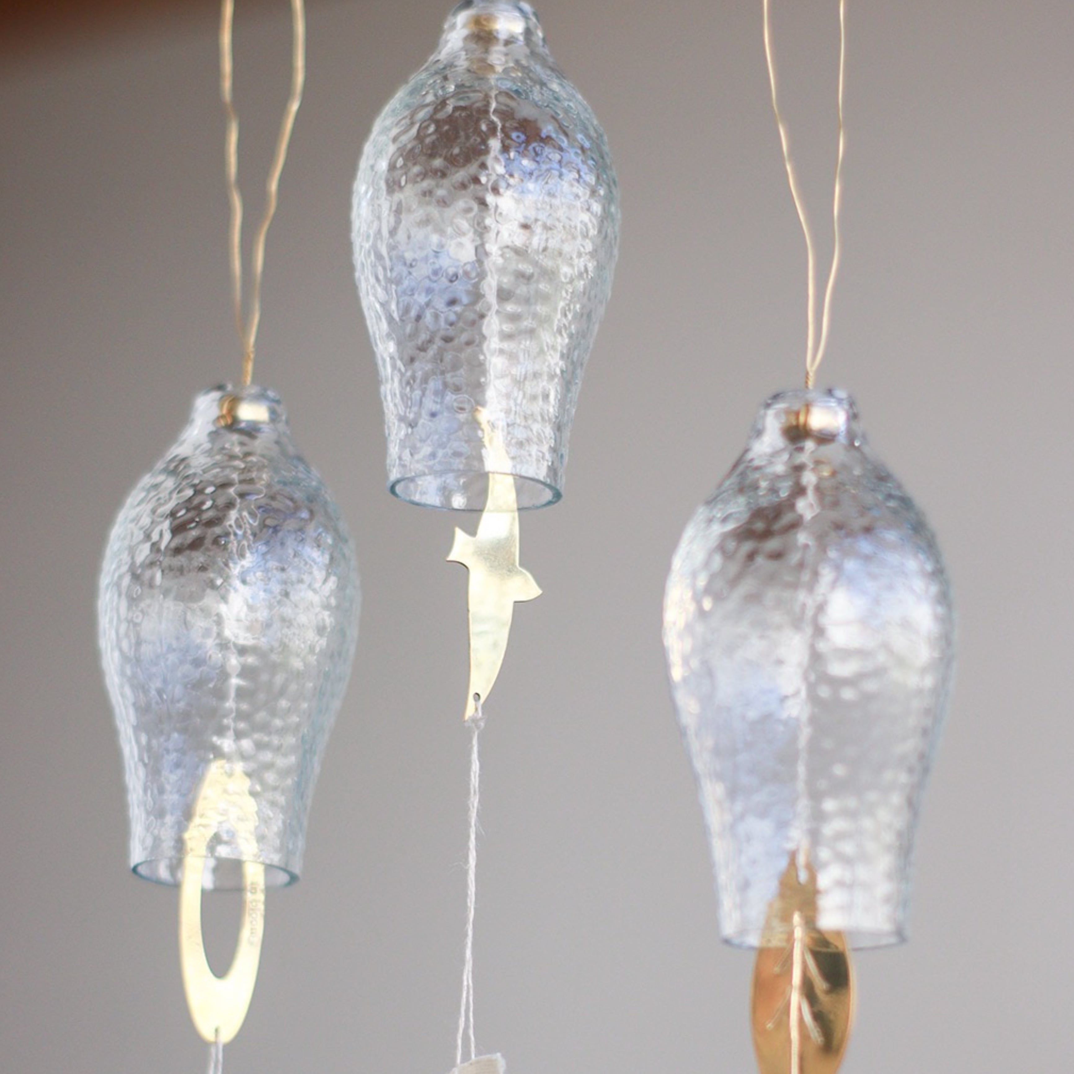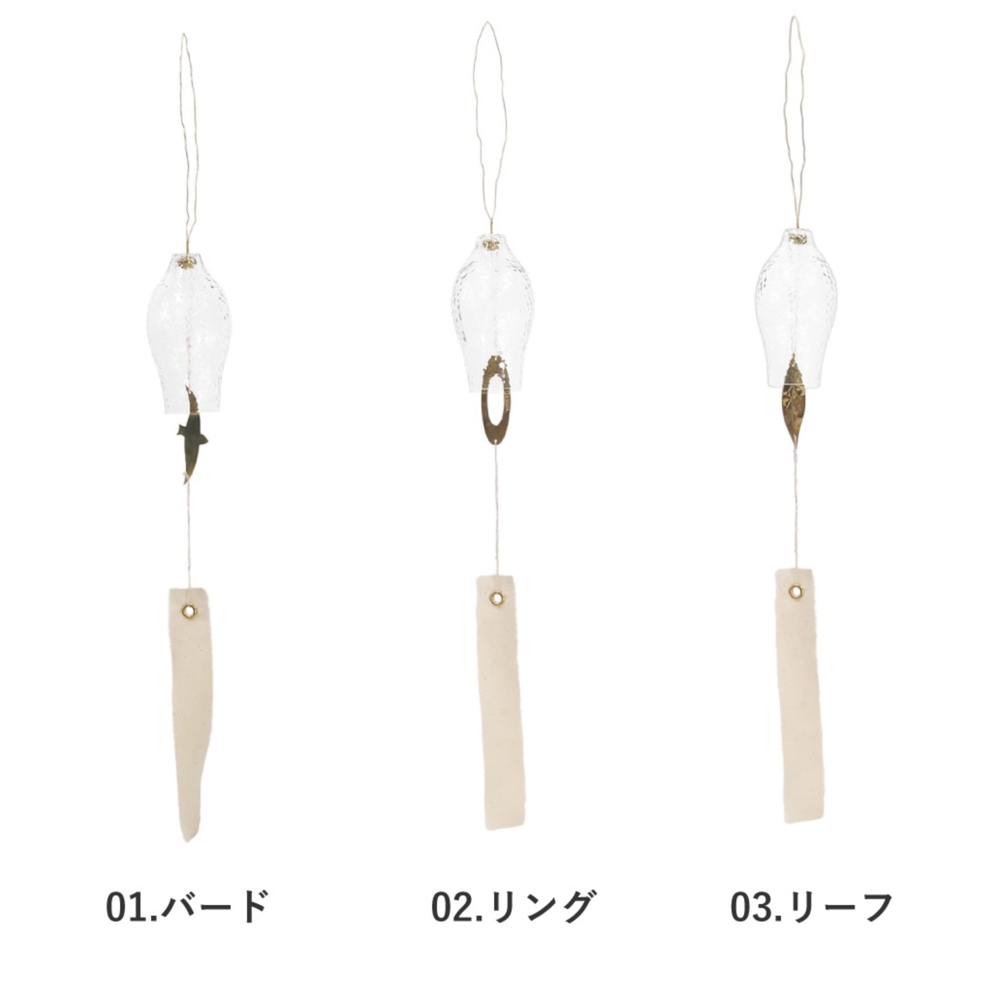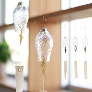 それぞれ異なるデザインで、ガラス部分に真鍮のパーツが当たることで、澄んだ美しい音色が心地よく響きます。