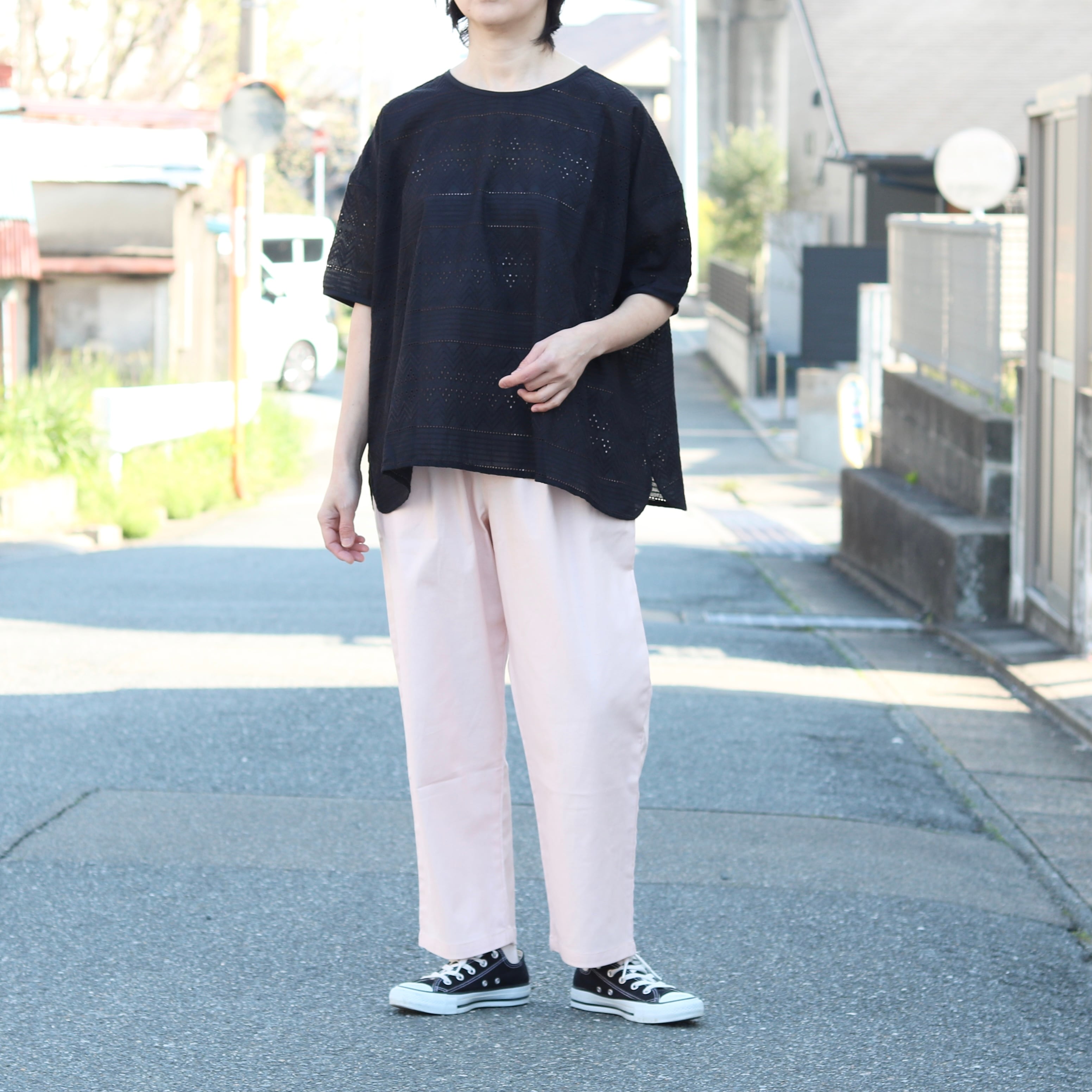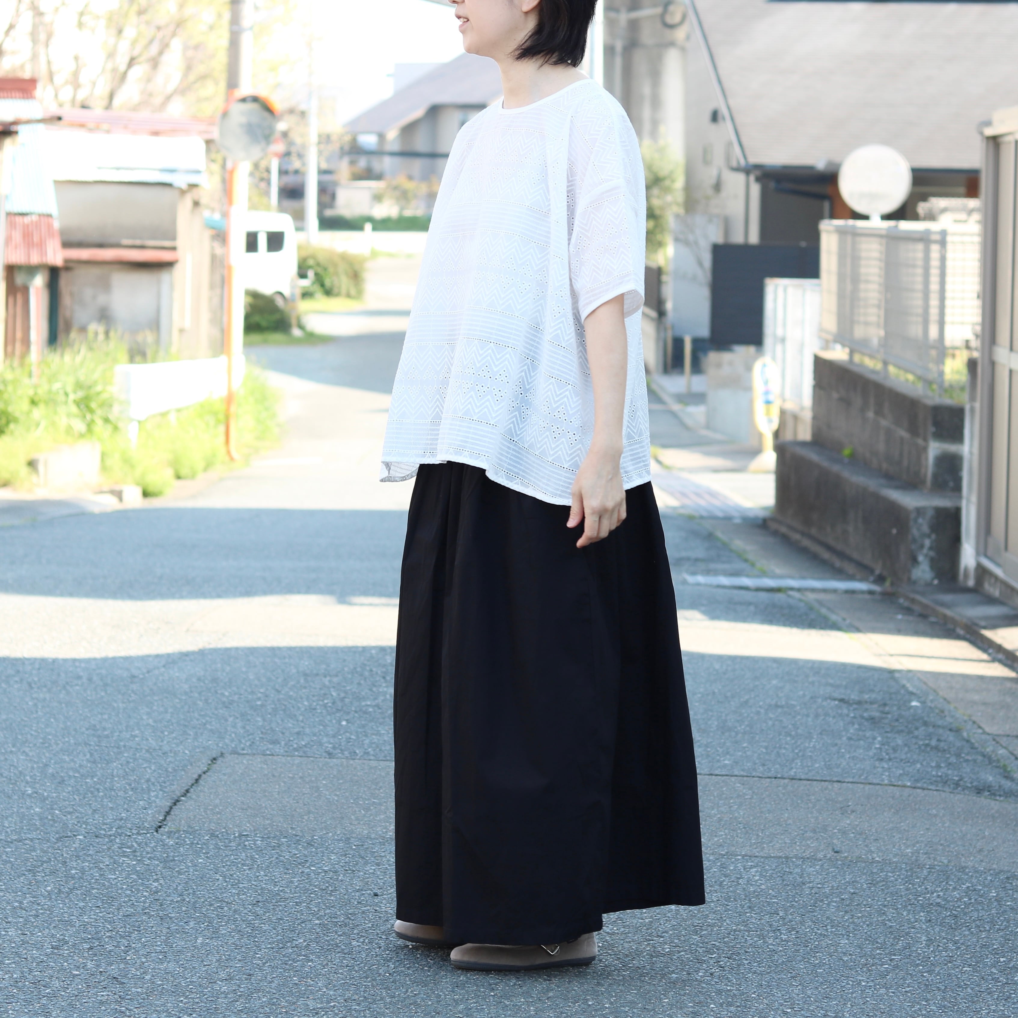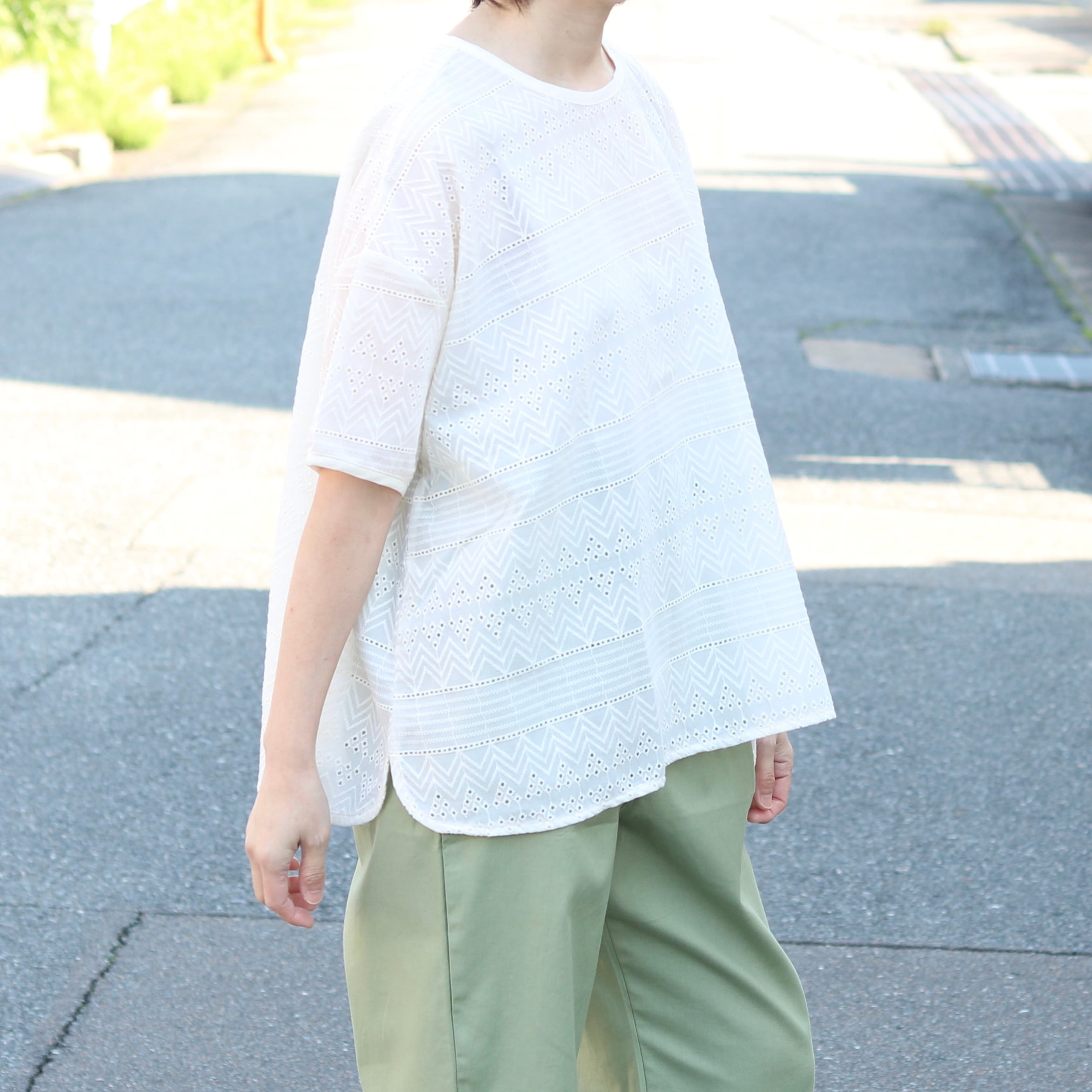 総刺繍で見栄えがワンランクアップのするブラウスは、やや広めにとった身幅で体型を気にせず着用いただけます。