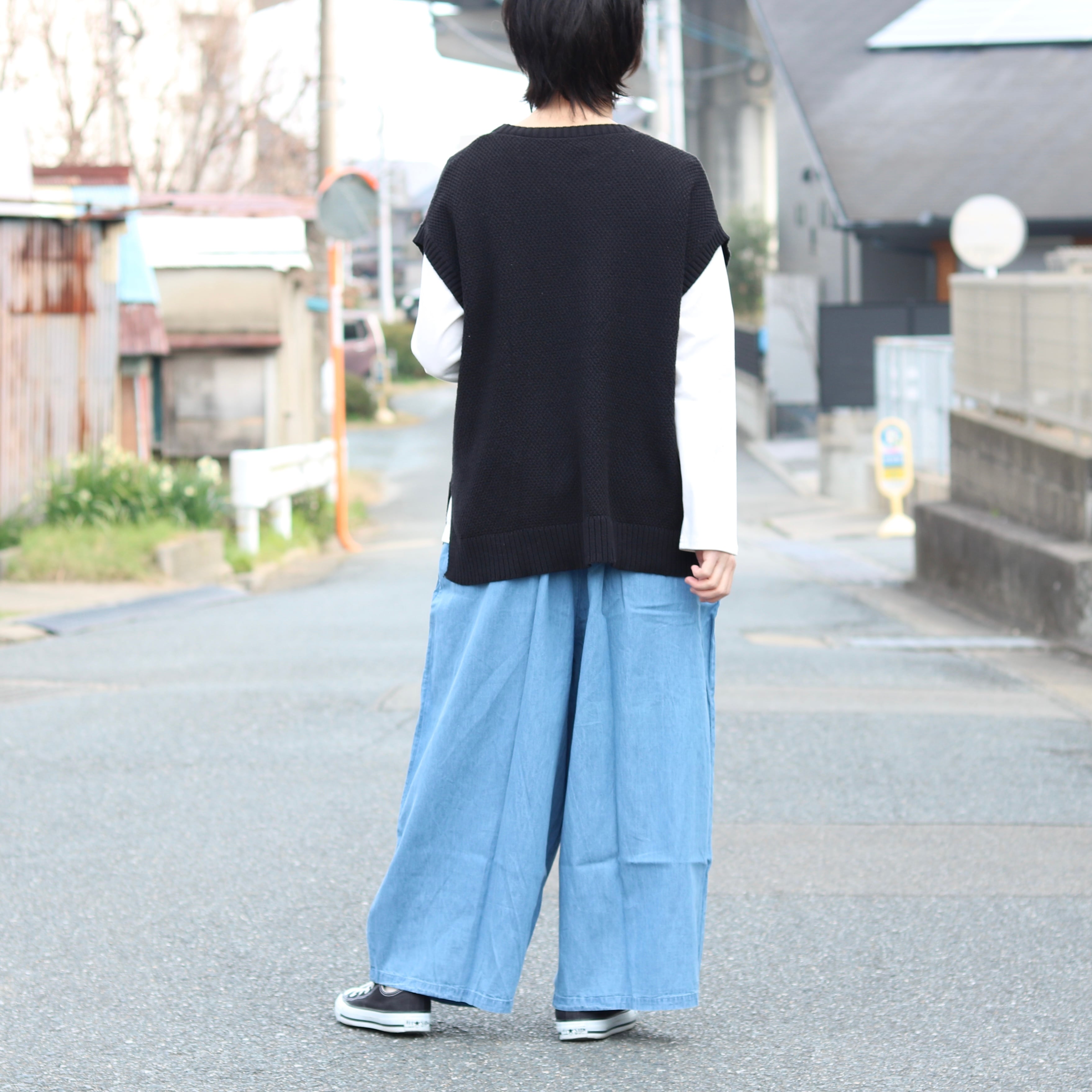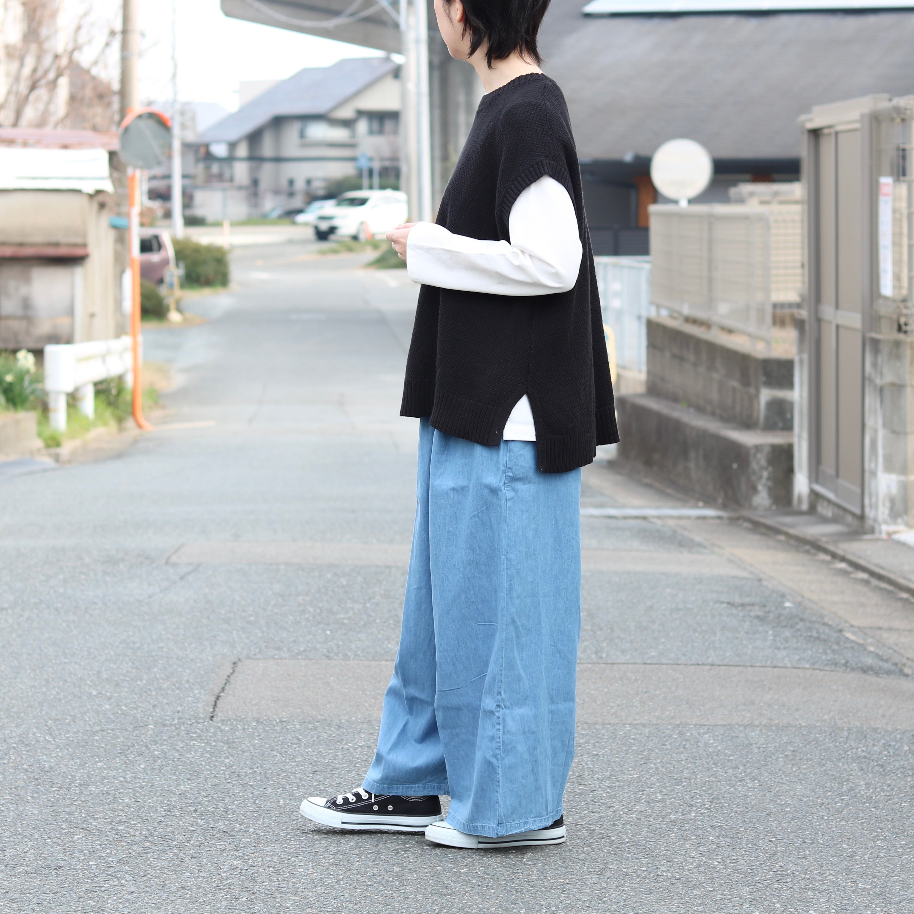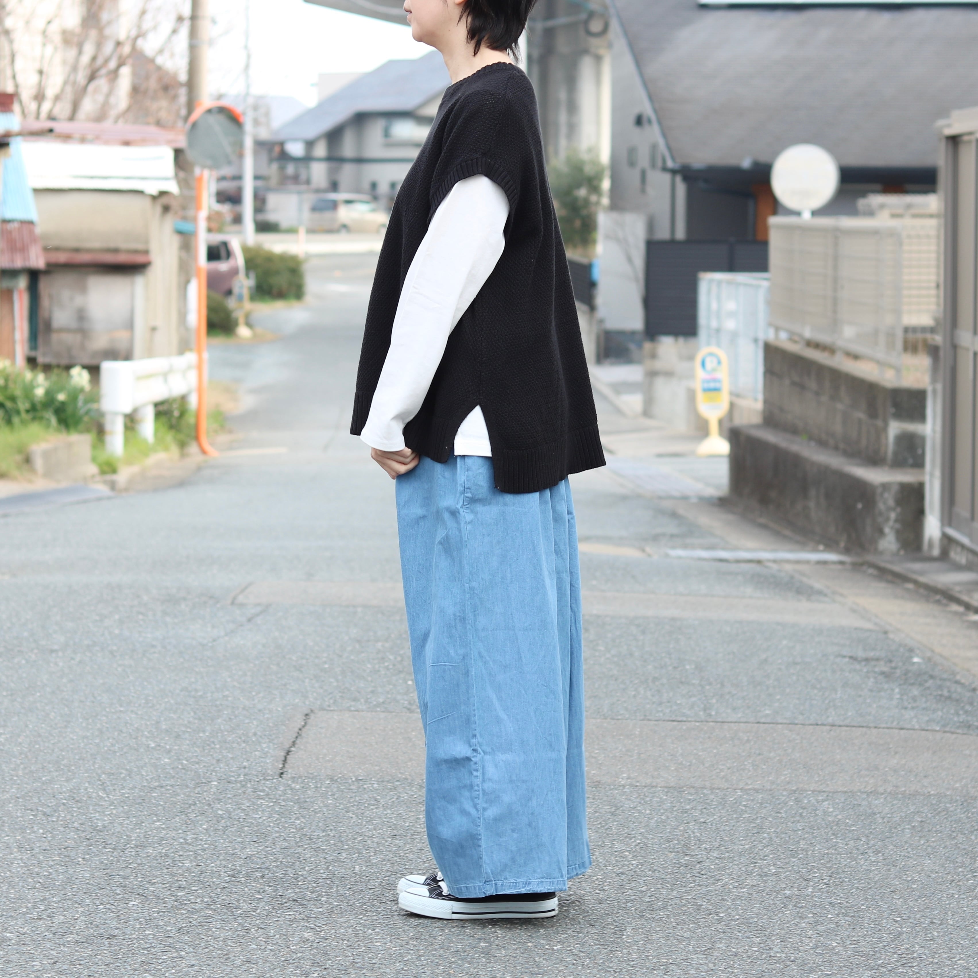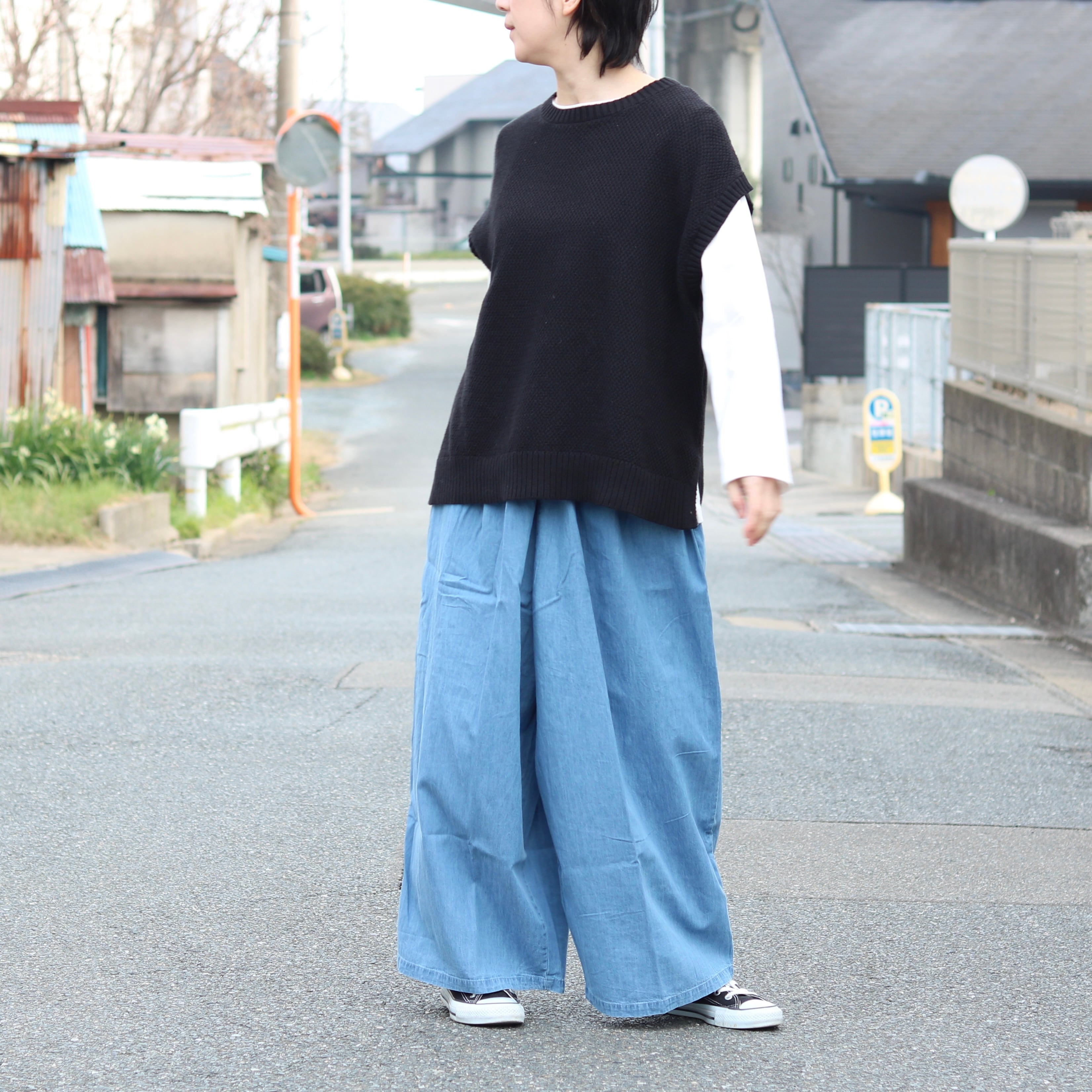 デニム タック ワイドパンツ