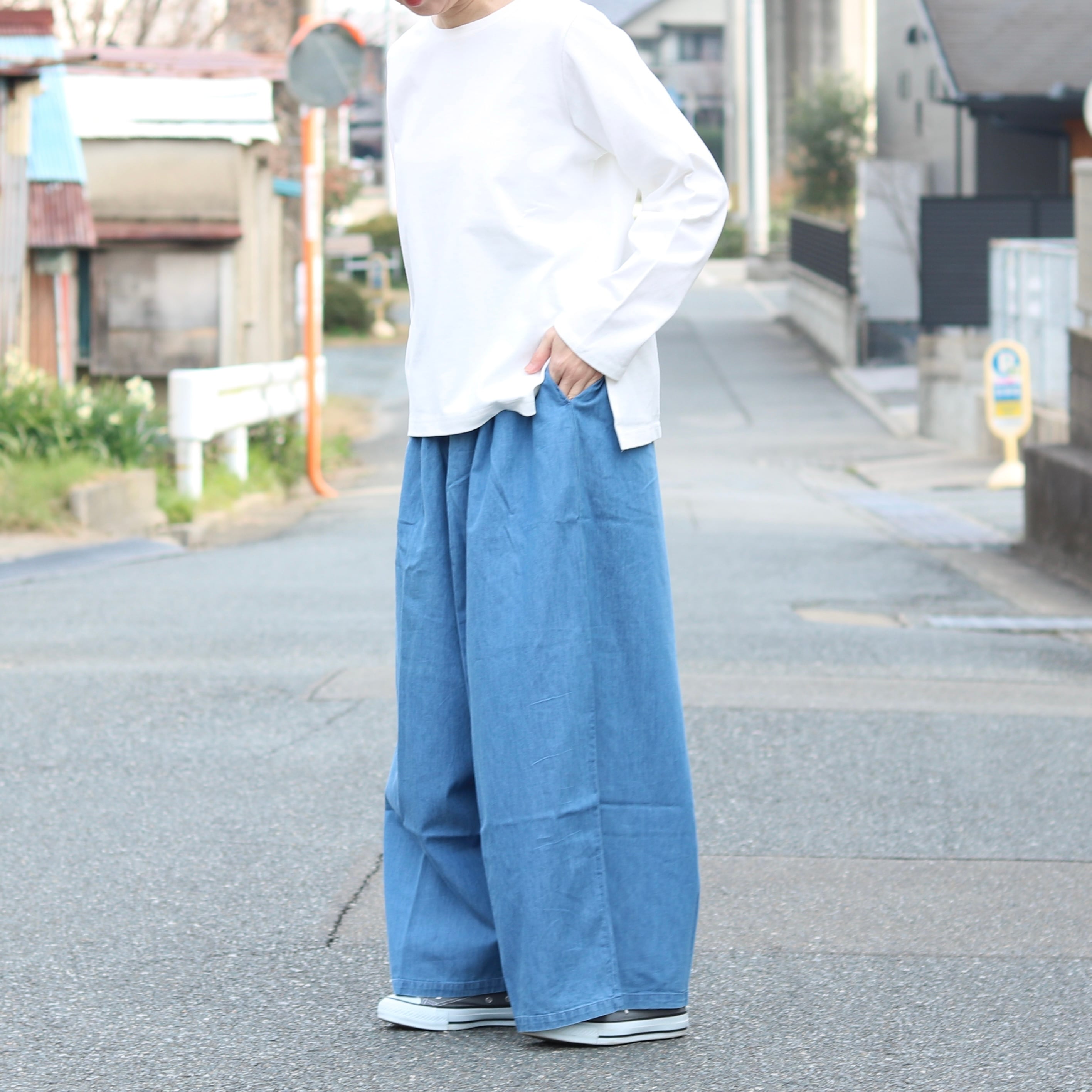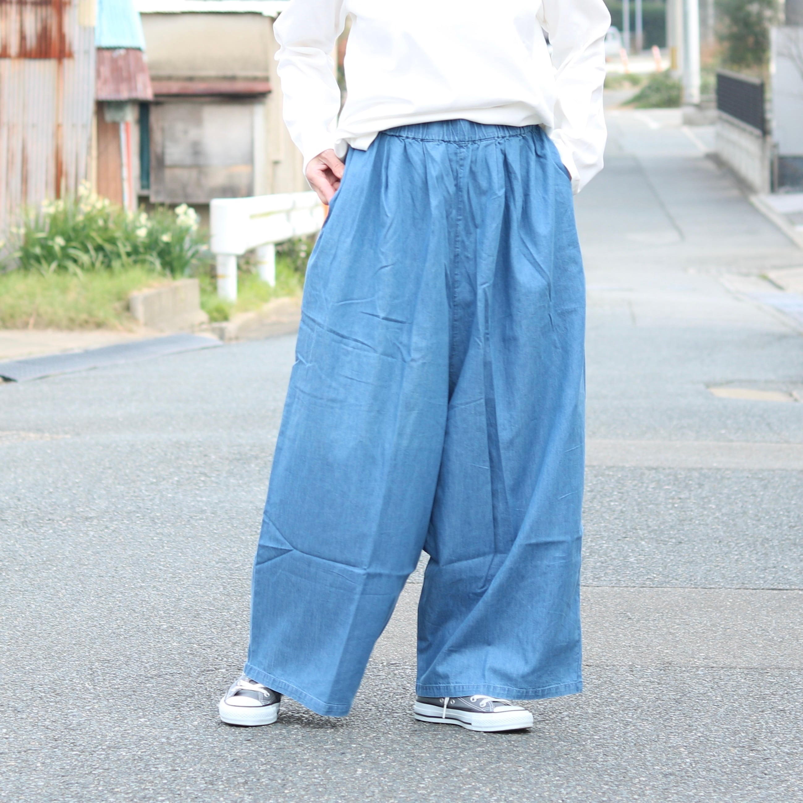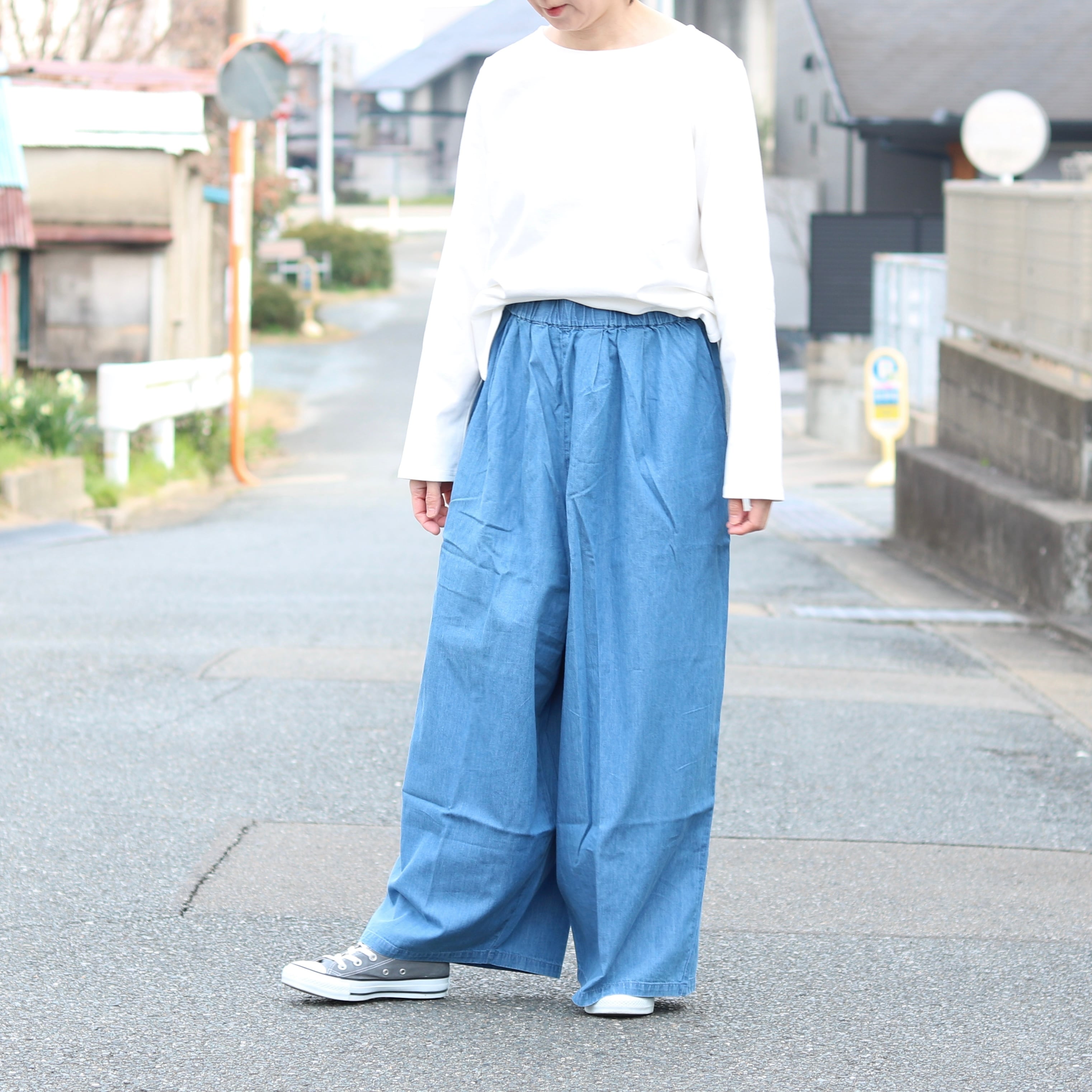 薄めのデニム生地がさらっと着られるワイドパンツ