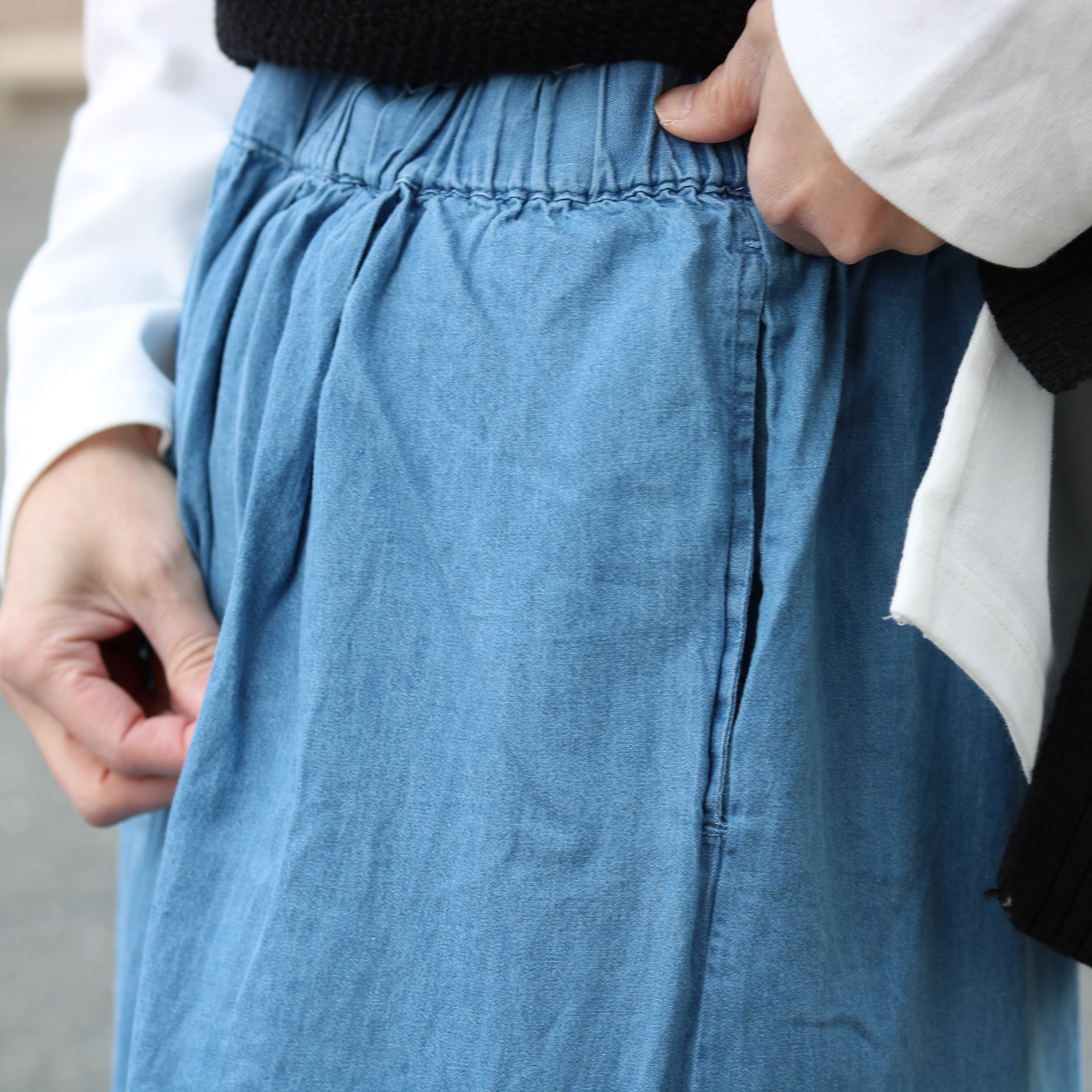 デニム色の薄さがコーデネートに取り入れやすく、ナチュラルにもカジュアルにも合わせるトップスによって変わり、楽しめる一着です。