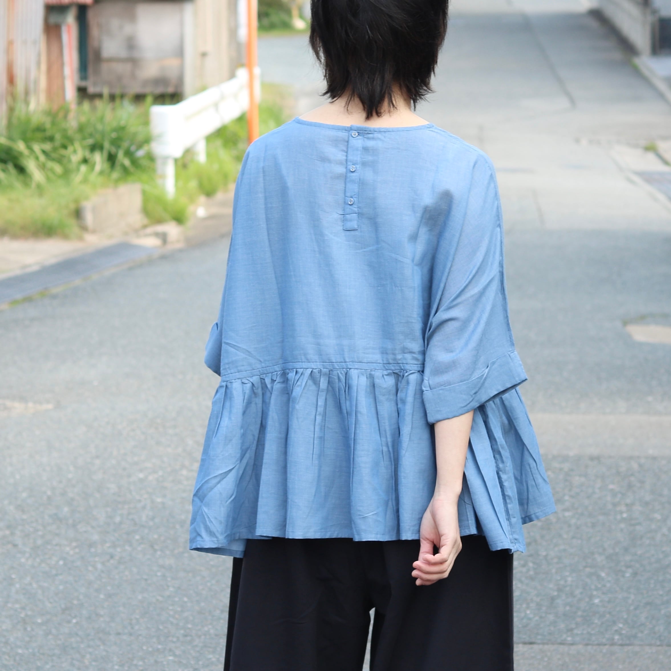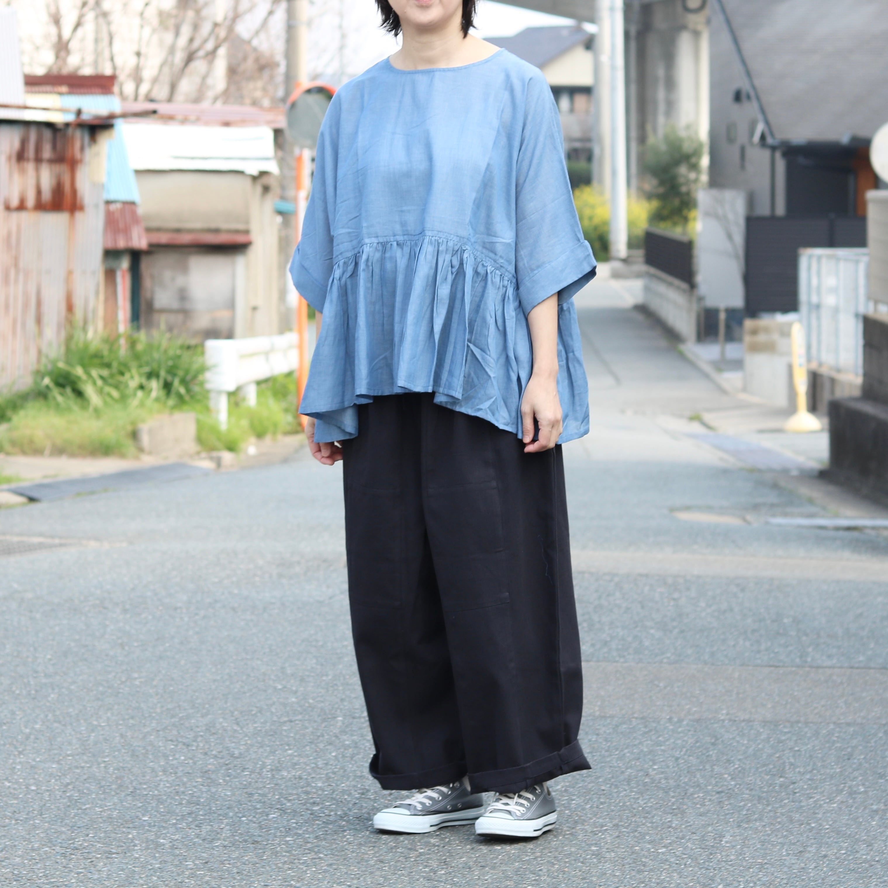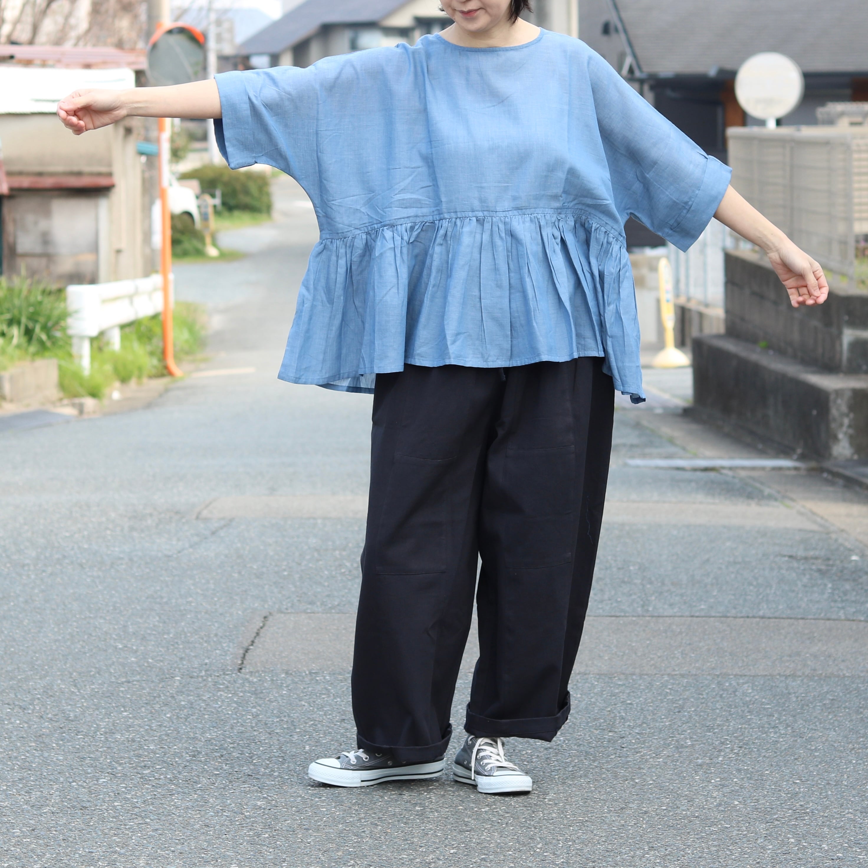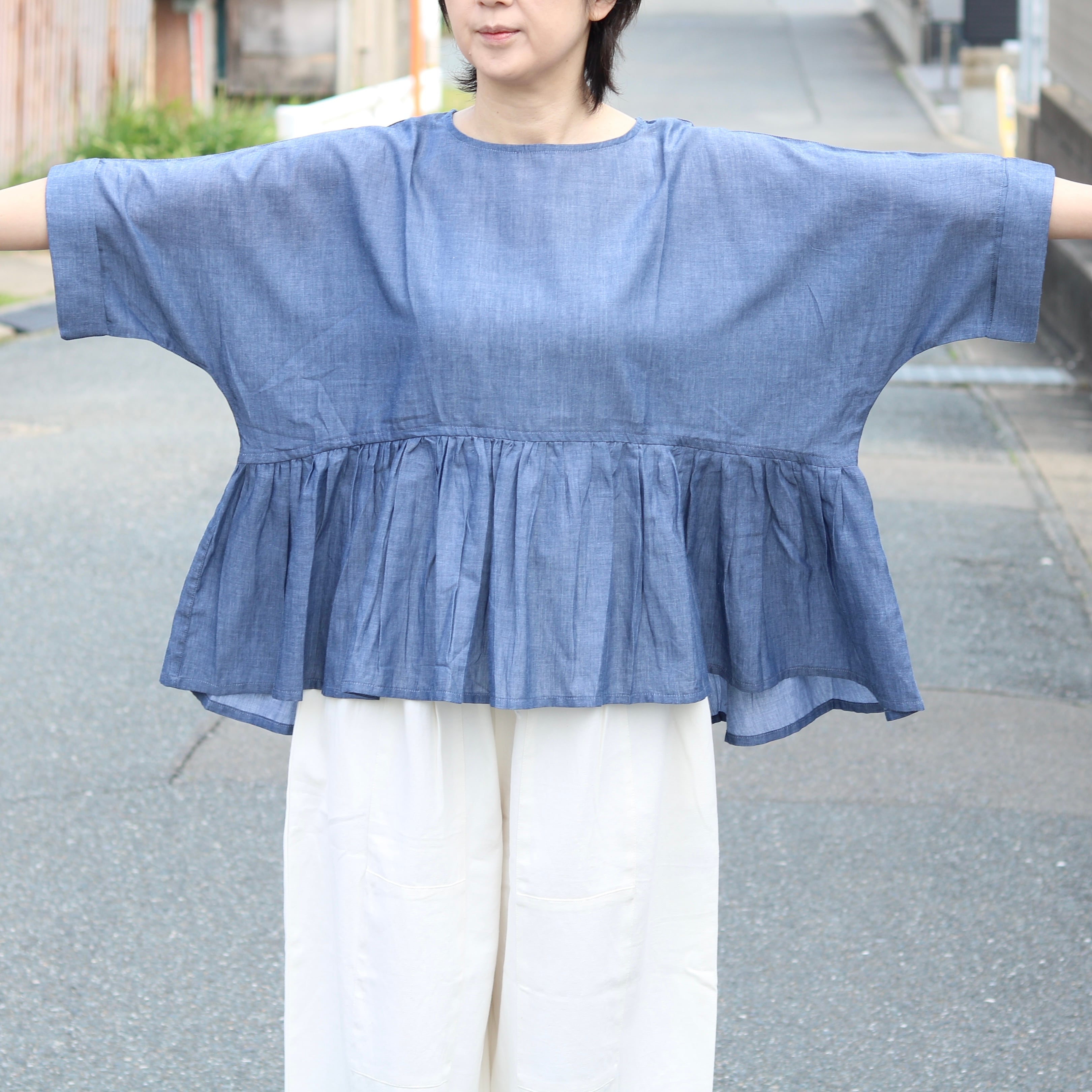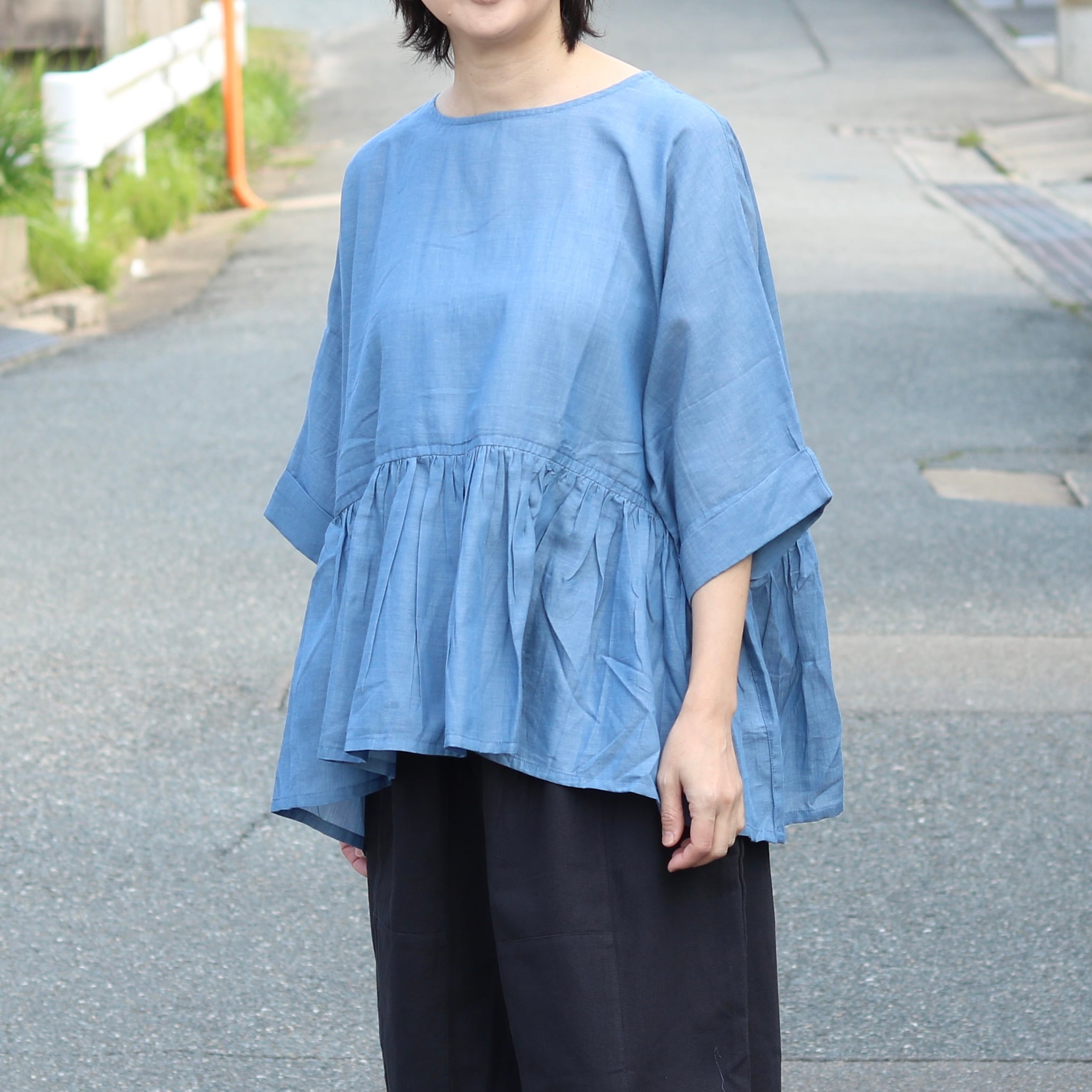 ドルマンスリーブとギャザーの組合せが、ゆとりあるサイズ感を生み出し、体型も気にせず着ていただけます。