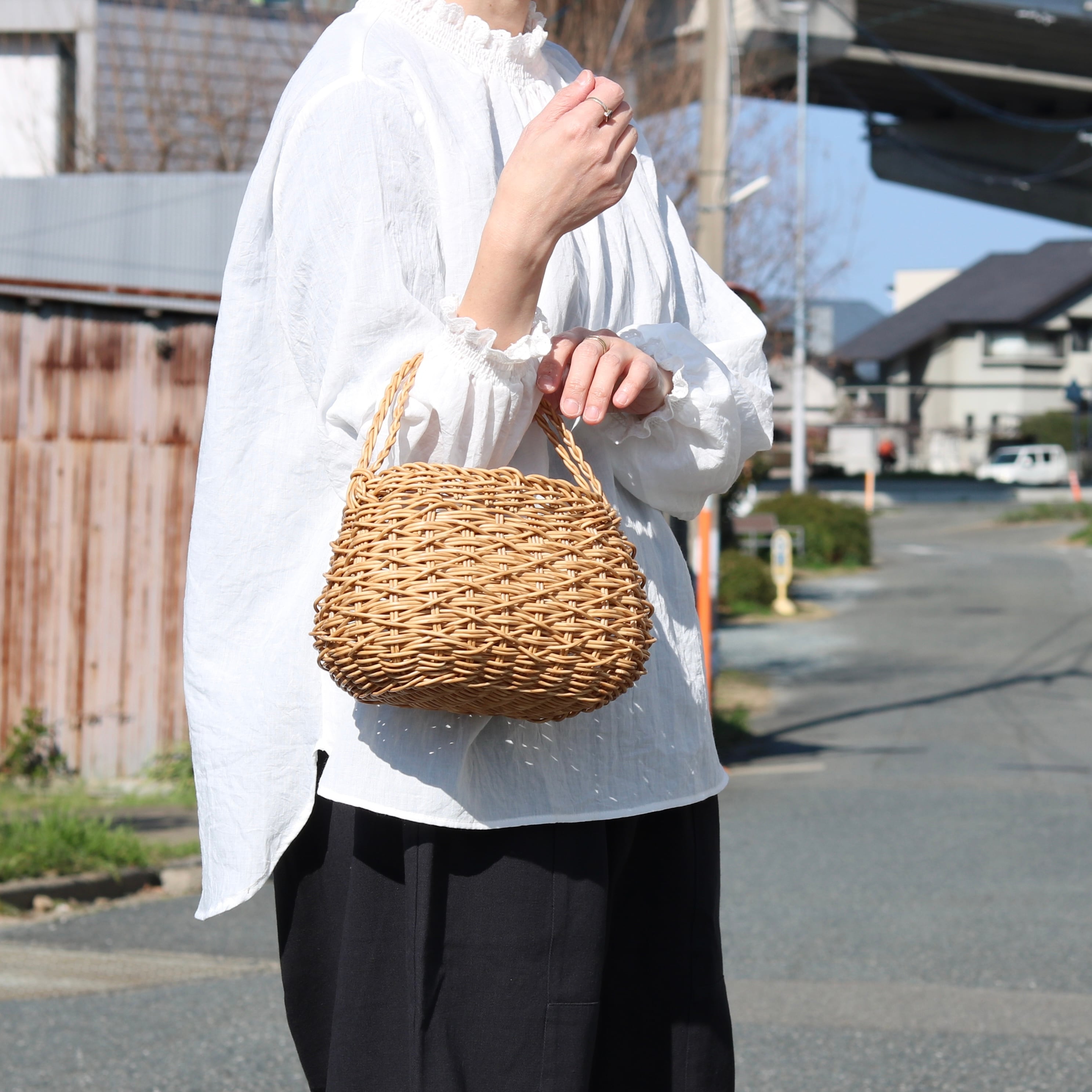 小さめサイズのラウンドバッグは、天然素材で編まれたような自然な温かみのあるデザイン。