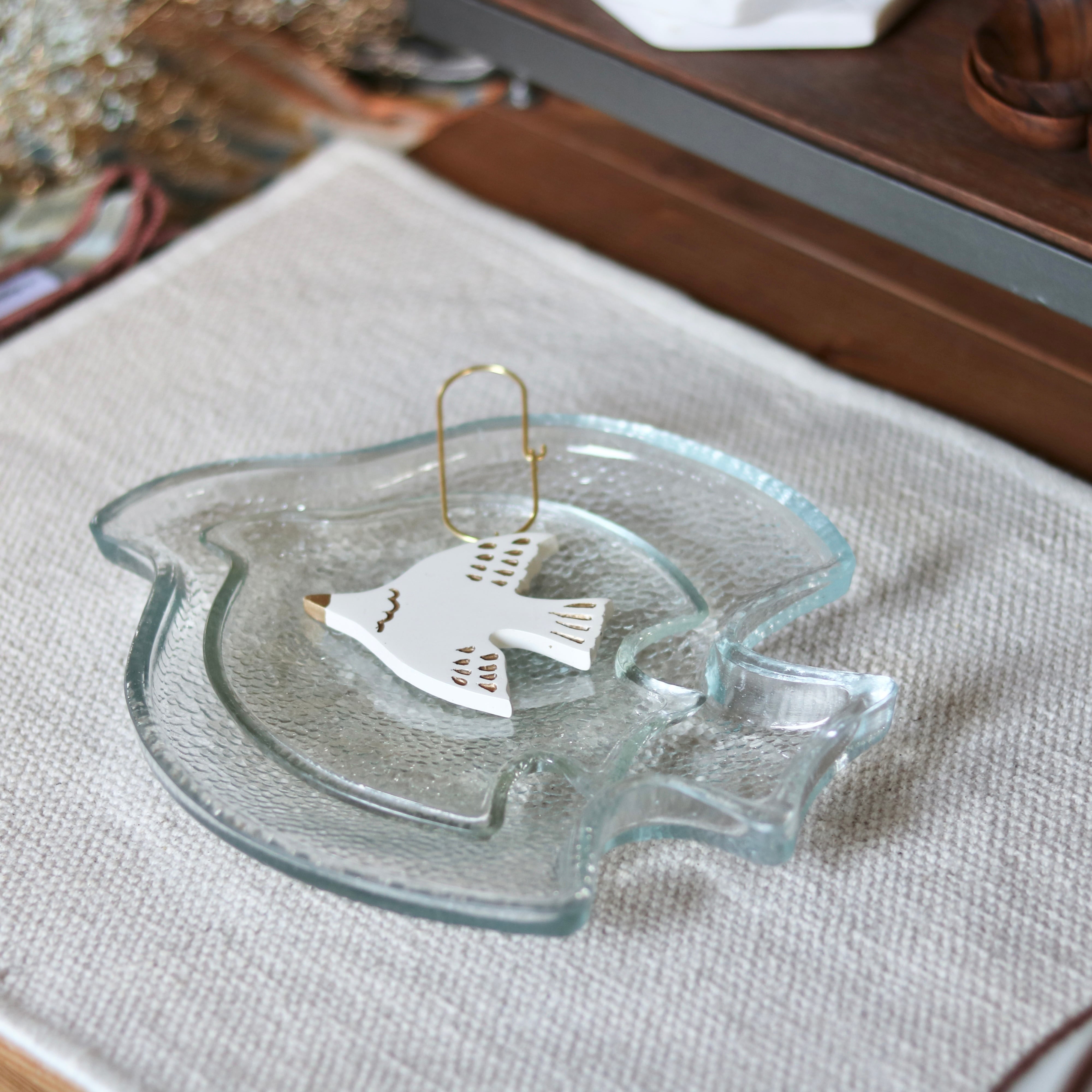 トリの形のデザインがかわいいプレートは、ゆらぎあるガラスの風合いが光を柔らかく反射し、どんな料理も涼やかで清潔感のある表情に仕上げます。