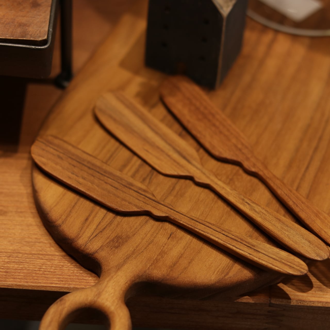 タイ北部のチェンマイにてオリジナル商品を作っています。これまで培ってきた経験を生かし、お客様に感動や喜びを感じていただける付加価値を追求している『Co-Labo』メイン素材であるチークは、タイ政府が計画的に植林されたものが育ち、自然を壊すことなく、シリアルナンバーが付いたものを実際に現物を見て購入しています。貴重な素材は、端材もカトラリーや小さいお皿、箸置きなど余すことなく使い切ります。森からの貴重な恵みをいつまでも愛着を持って使って頂ける商品を作っています。