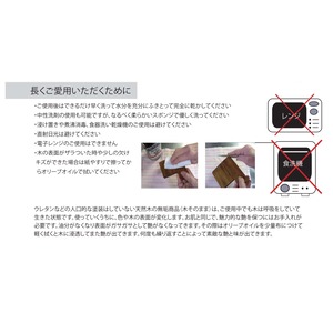 お手入れ方法は簡単です。ご家庭でお使いの食用のオイルを少々布に付けて商品の表面を拭くだけです。オリーブオイルやえごま油、亜麻仁油などが木材と相性が良いと言われています。お手入れの頻度は、使い方にもよりますが、10~20回ご使用ごとに一回が目安です。ただし、熱い料理に使用されるときは、通常より早く表面があれてきます。表面がざらついてきたなと感じたときは、ホームセンターなどで販売しているサンドペーパー320番前後で表面の気になる部分を滑らすように軽く擦ってください。