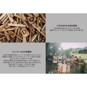 タイ北部のチェンマイにてオリジナル商品を作っています。これまで培ってきた経験を生かし、お客様に感動や喜びを感じていただける付加価値を追求している『Co-Labo』メイン素材であるチークは、タイ政府が計画的に植林されたものが育ち、自然を壊すことなく、シリアルナンバーが付いたものを実際に現物を見て購入しています。貴重な素材は、端材もカトラリーや小さいお皿、箸置きなど余すことなく使い切ります。森からの貴重な恵みをいつまでも愛着を持って使って頂ける商品を作っています。