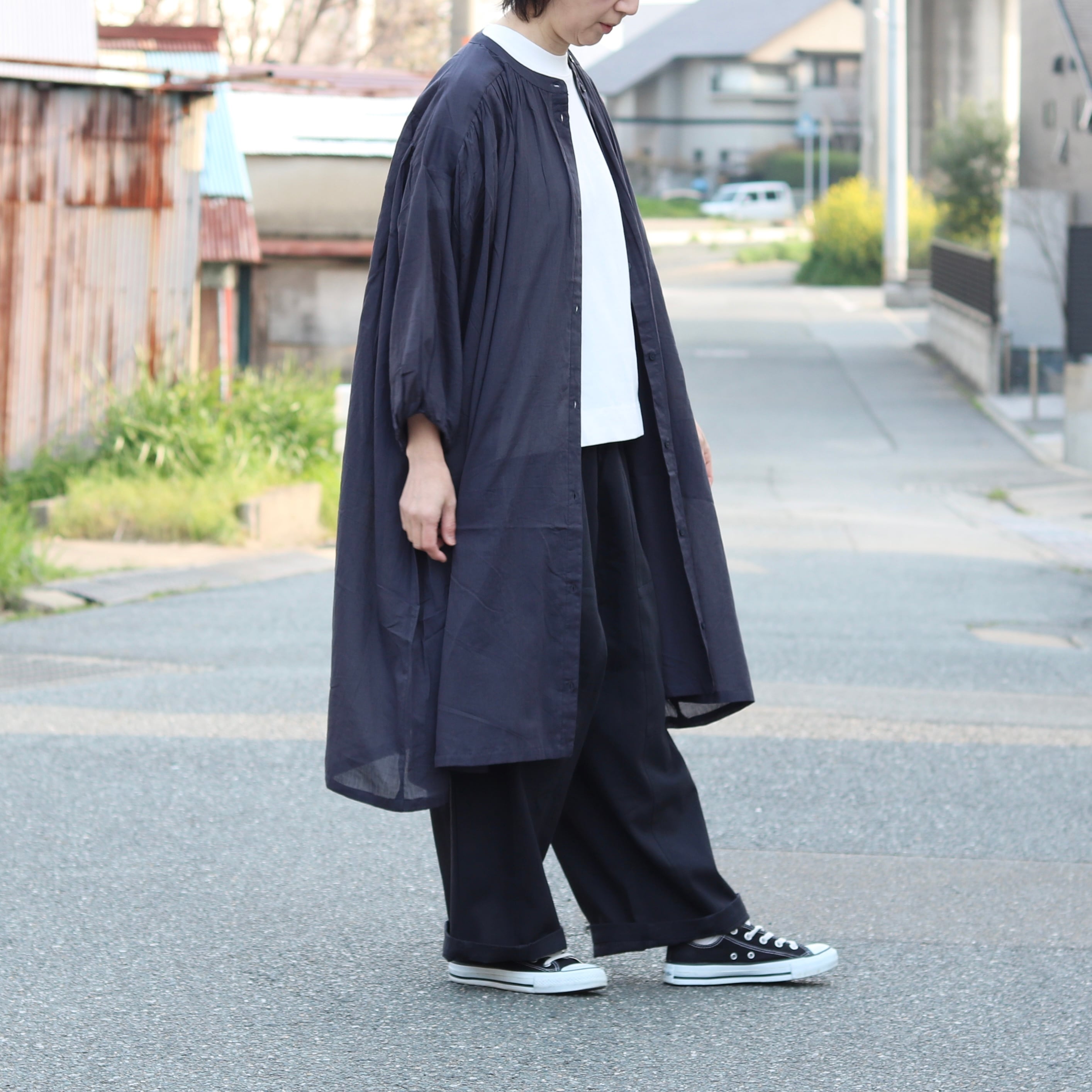 すっきりとしたギャザーワンピースは、羽織としても使え様々なコーディネートを楽しめる着まわしができる一枚です。
