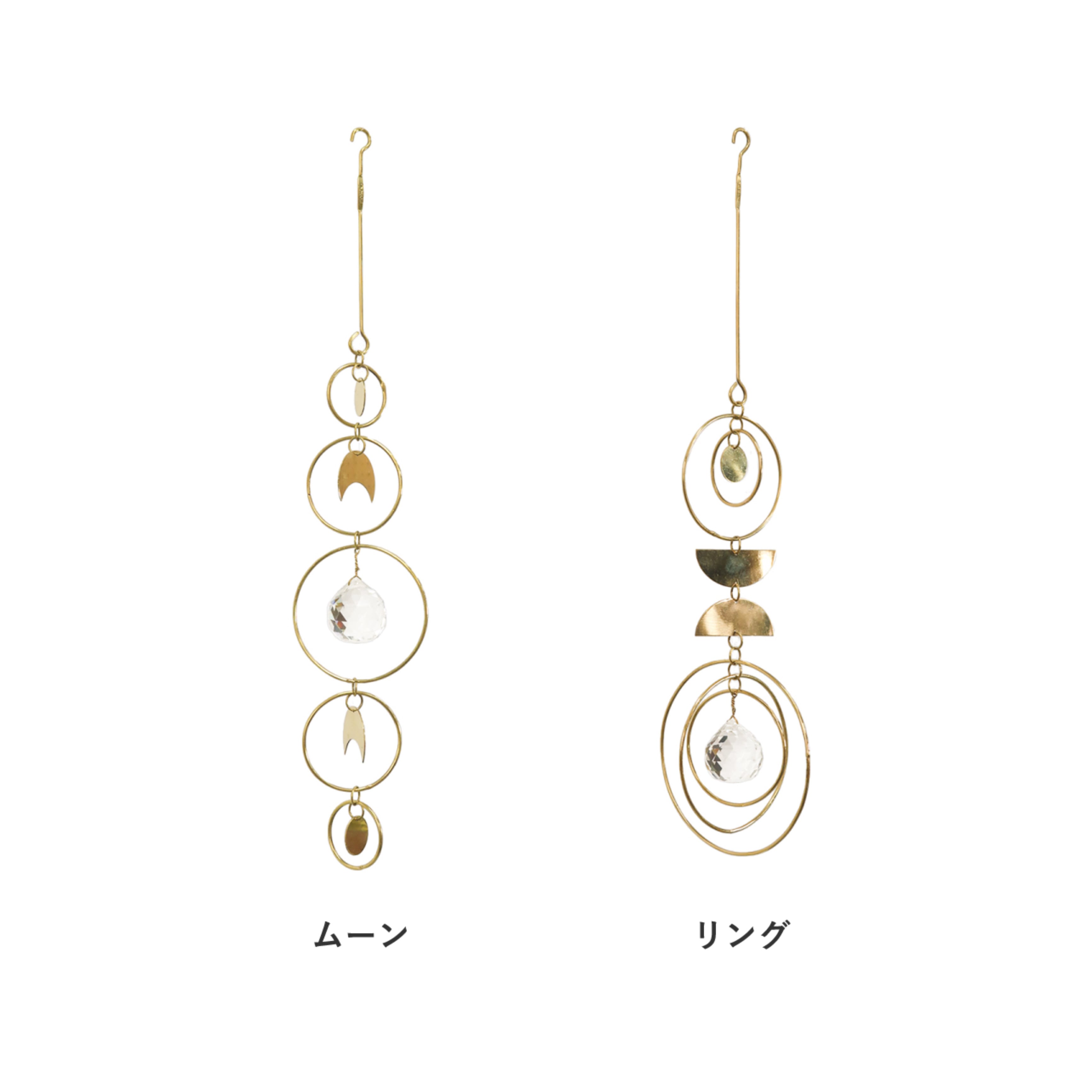味わい深い真鍮でできた月のモチーフや、幾重にも重なるリングにガラスのパーツを組み合わせた、シンプルで洗練されたデザイン。
