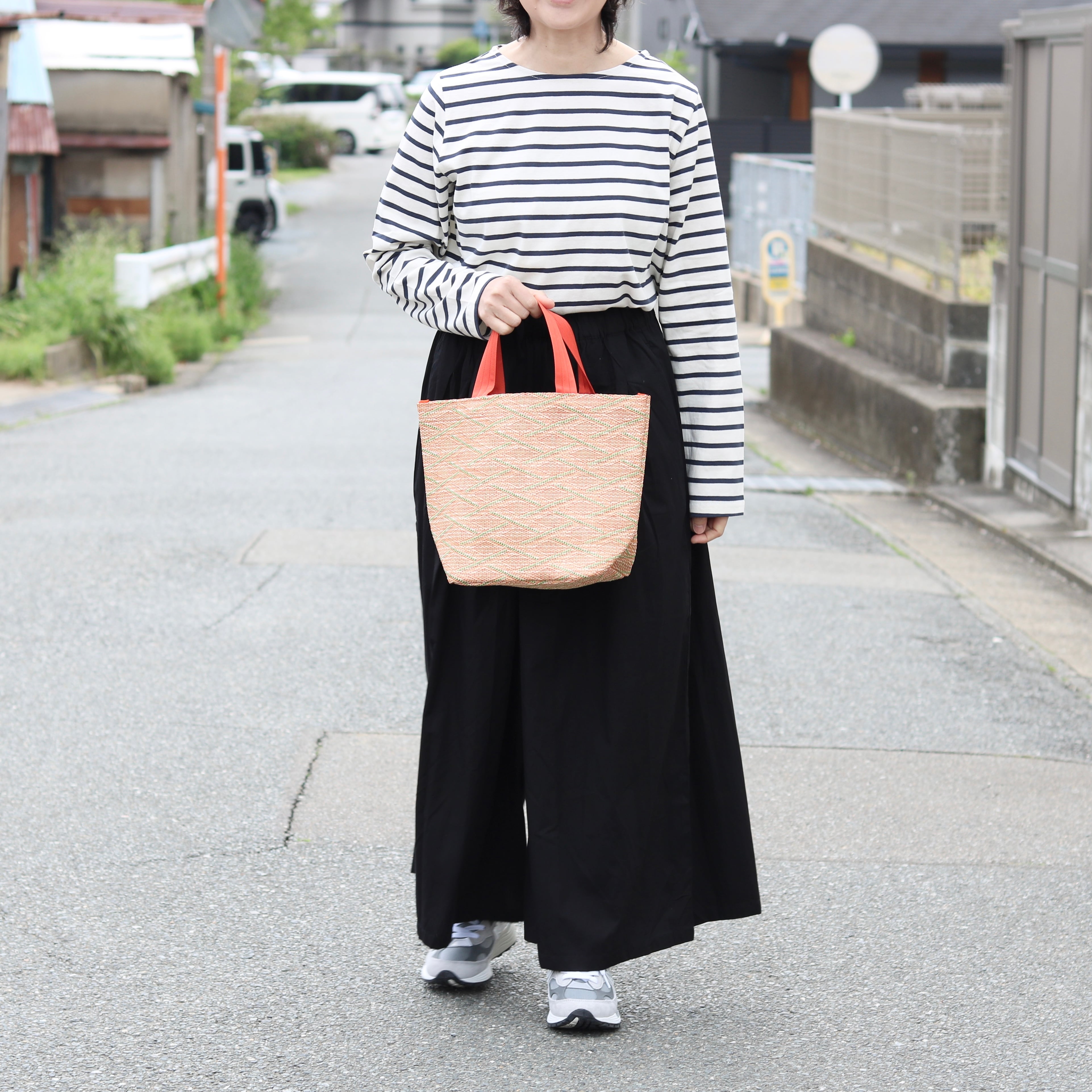 古い織機を用いて、細いポリプロピレン素材を丁寧に編み上げたシートを使ったバッグです。