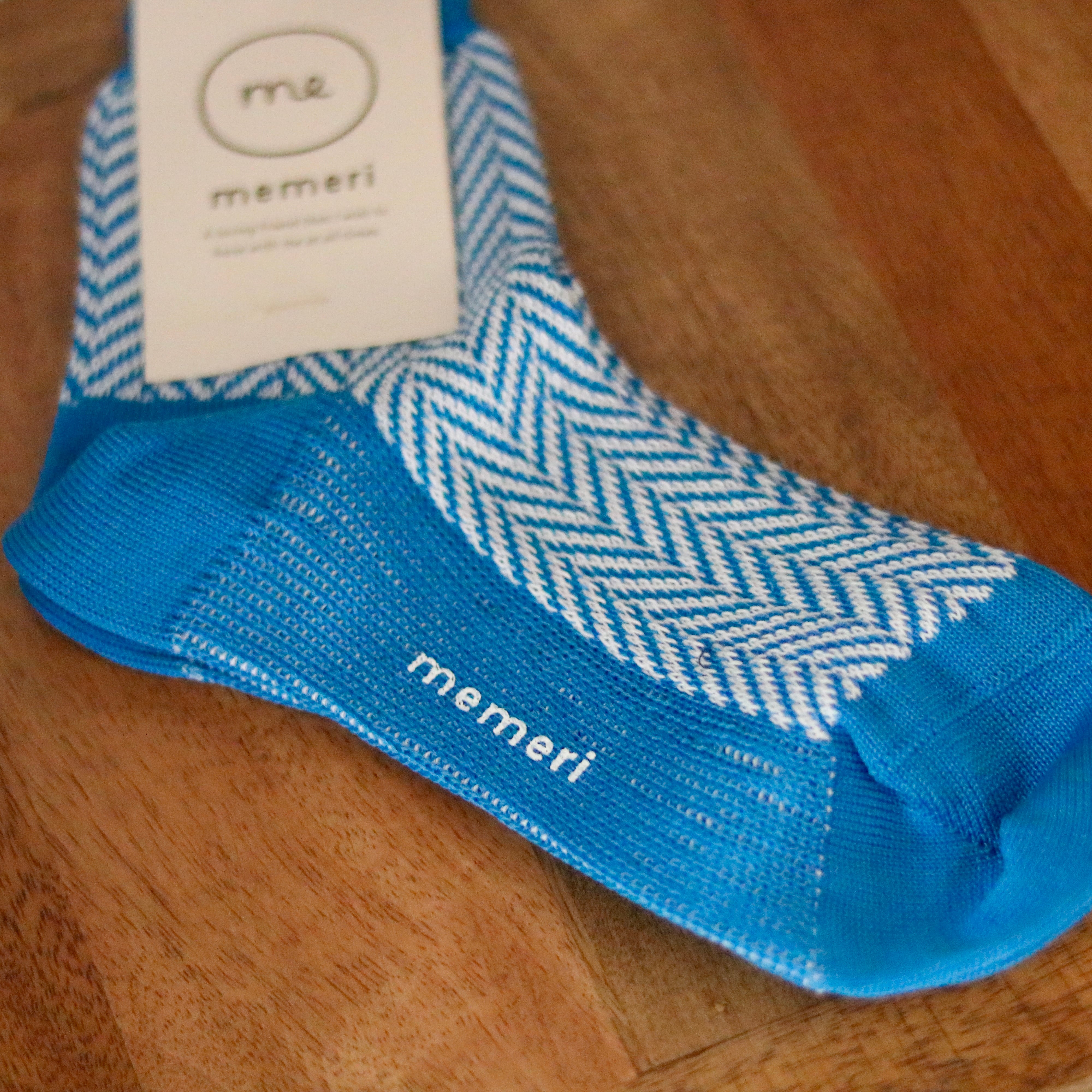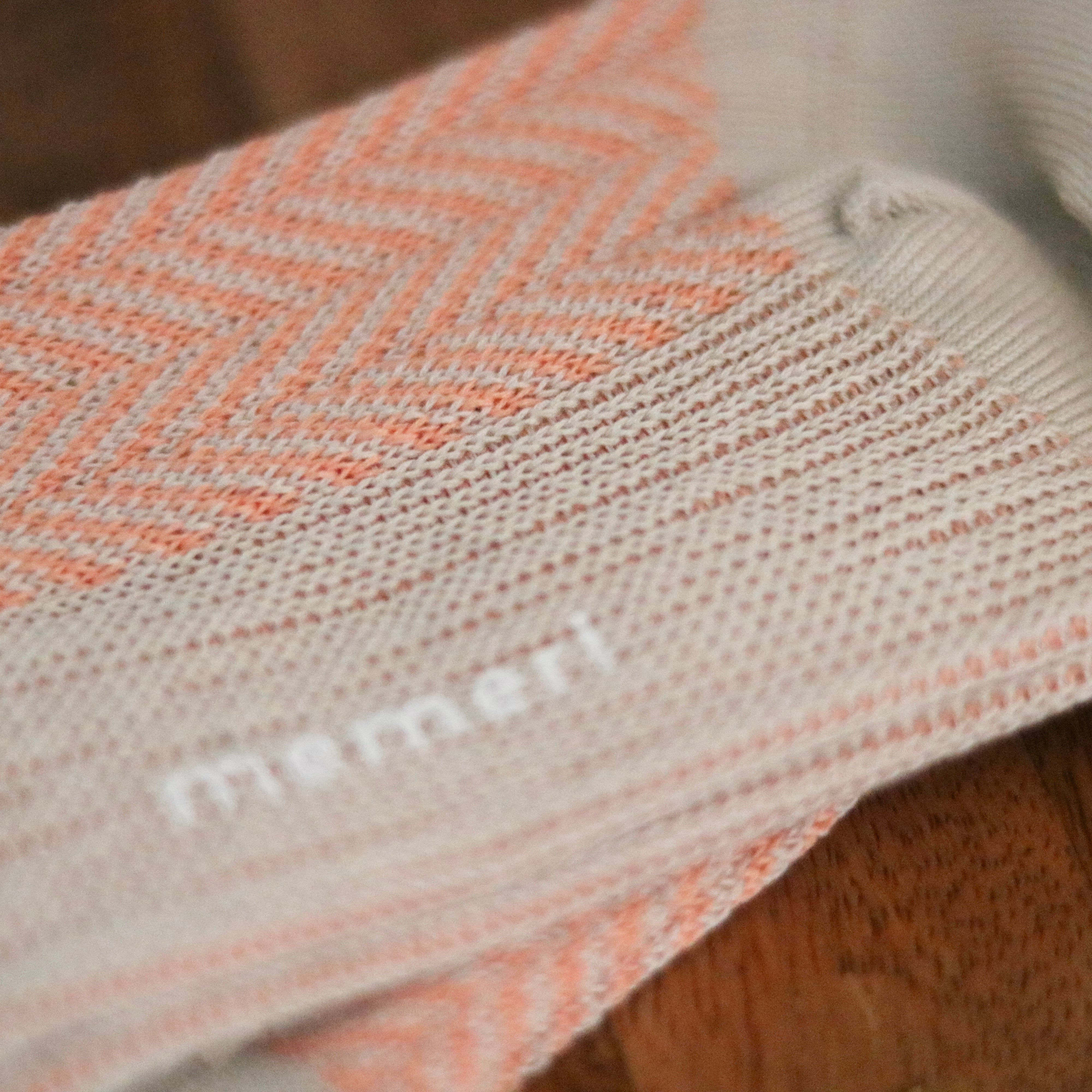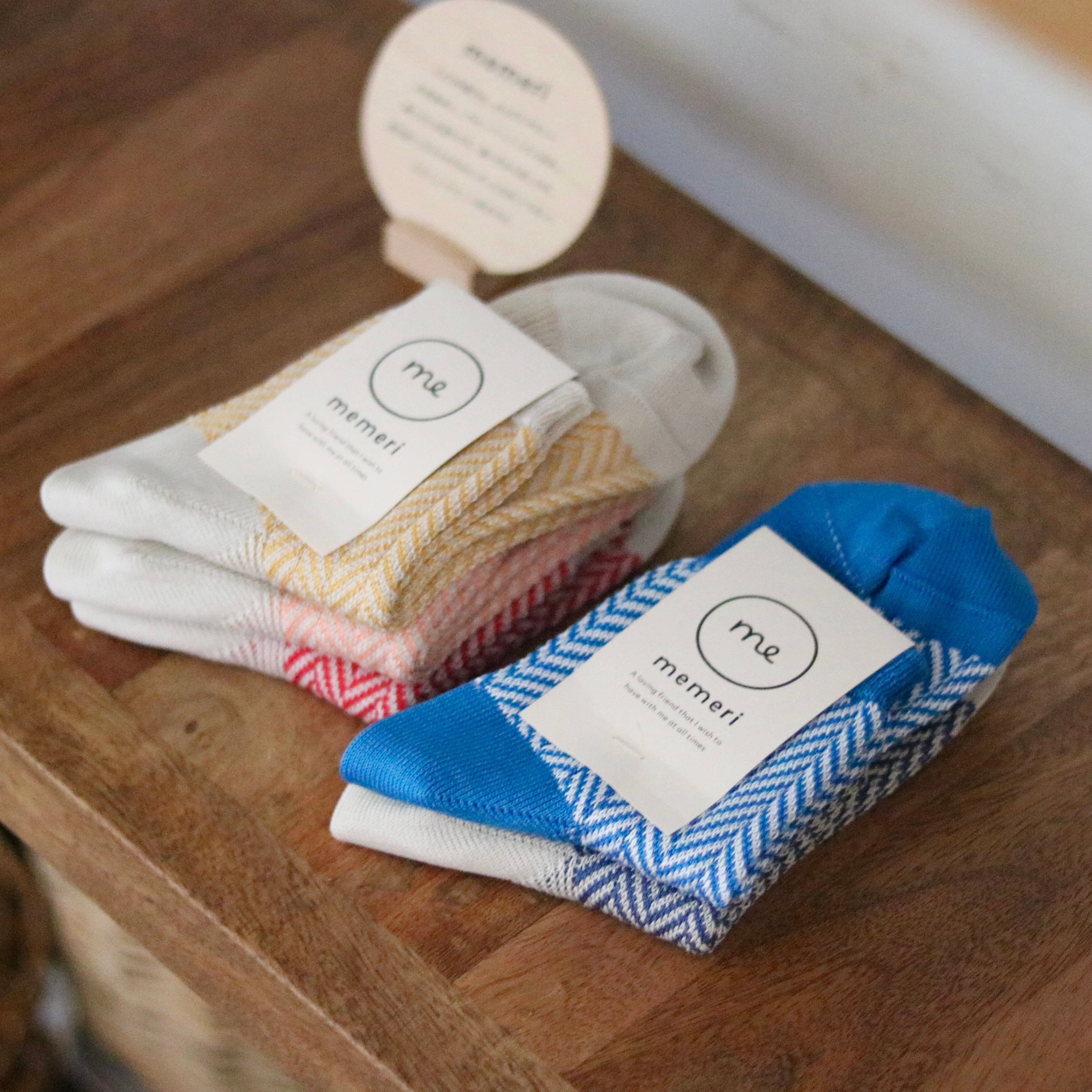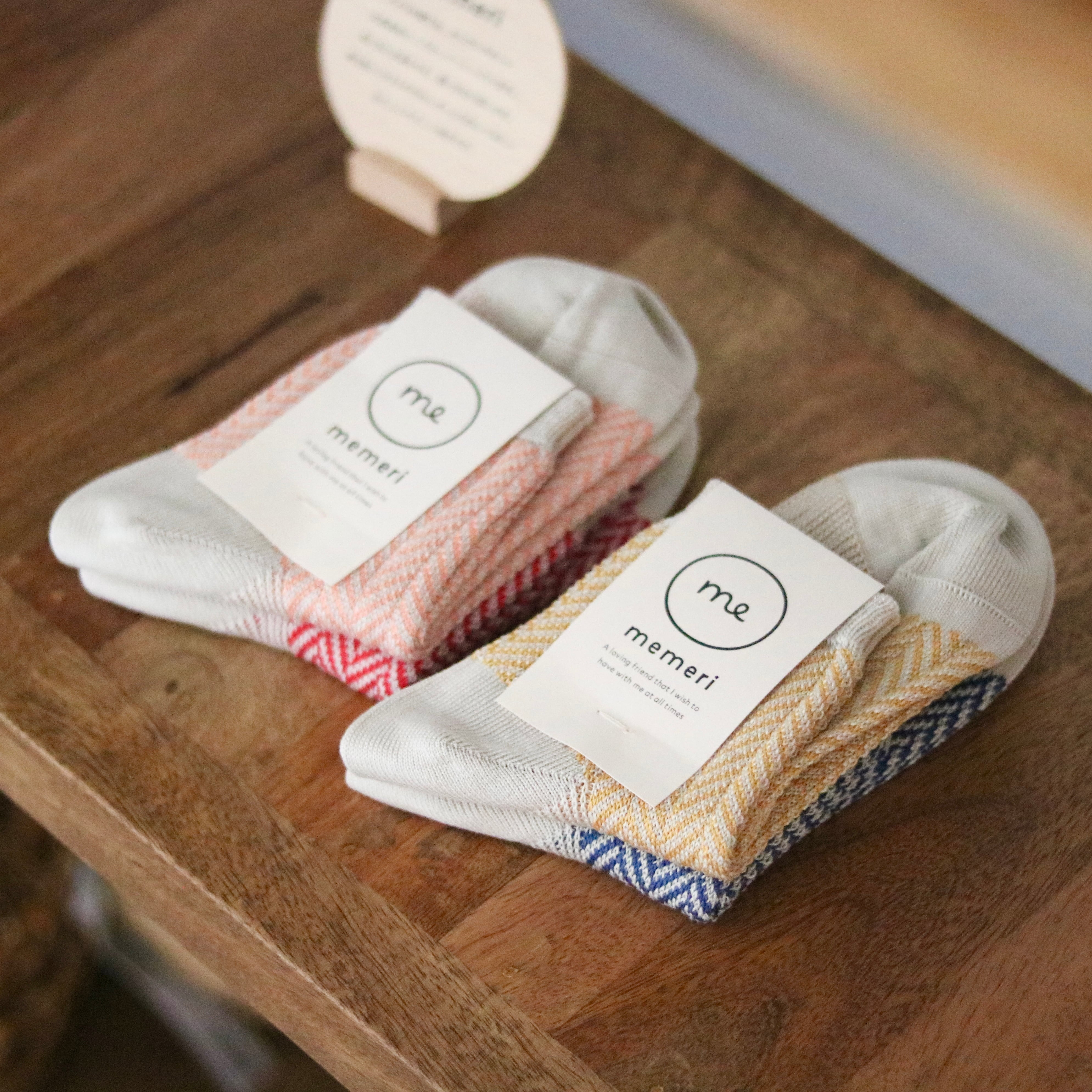 メメリの靴下は、シルク・ウール・リネン・コットンなど、からだにやさしい天然素材にこだわってつくっています。寒い日には温もりを、暑い日なら涼しさを。春夏秋冬、移ろいゆく日本の季節と暮らすわたしたちにぴったりのニットアイテムを届けたい。そんな思いから生まれました。 生産はすべて1950年から天然素材の靴下をつくり続けるファクトリーによる安心の日本製。毎日身につけるものだから、ずっとそばにいてほしい、わたしにやさしい味方です。