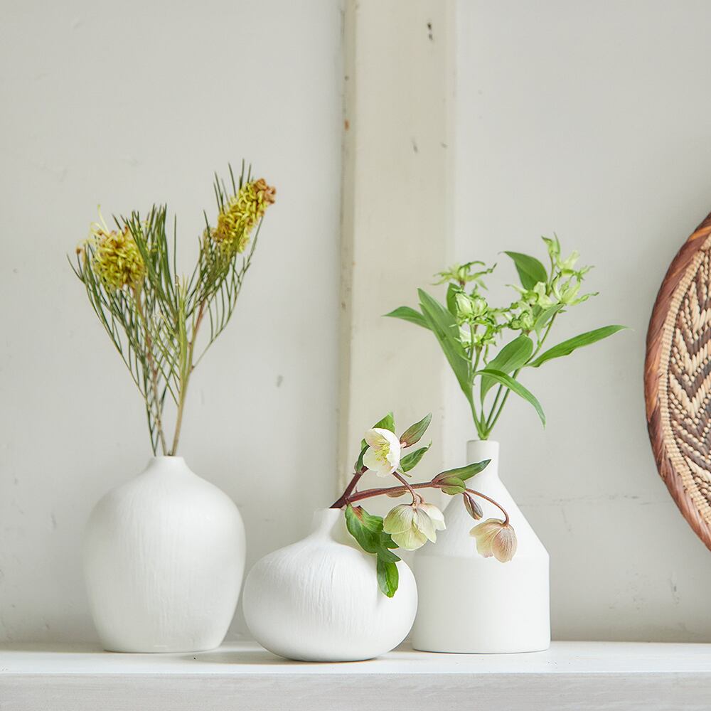 ナチュラルな白いボディに繊細なラインを施しており、どんなインテリにも馴染む主張しすぎないデザインなので、 置くだけでお部屋が柔らかい印象を演出し、韓国インテリアや北欧インテリアとも相性抜群のフラワーベースです。