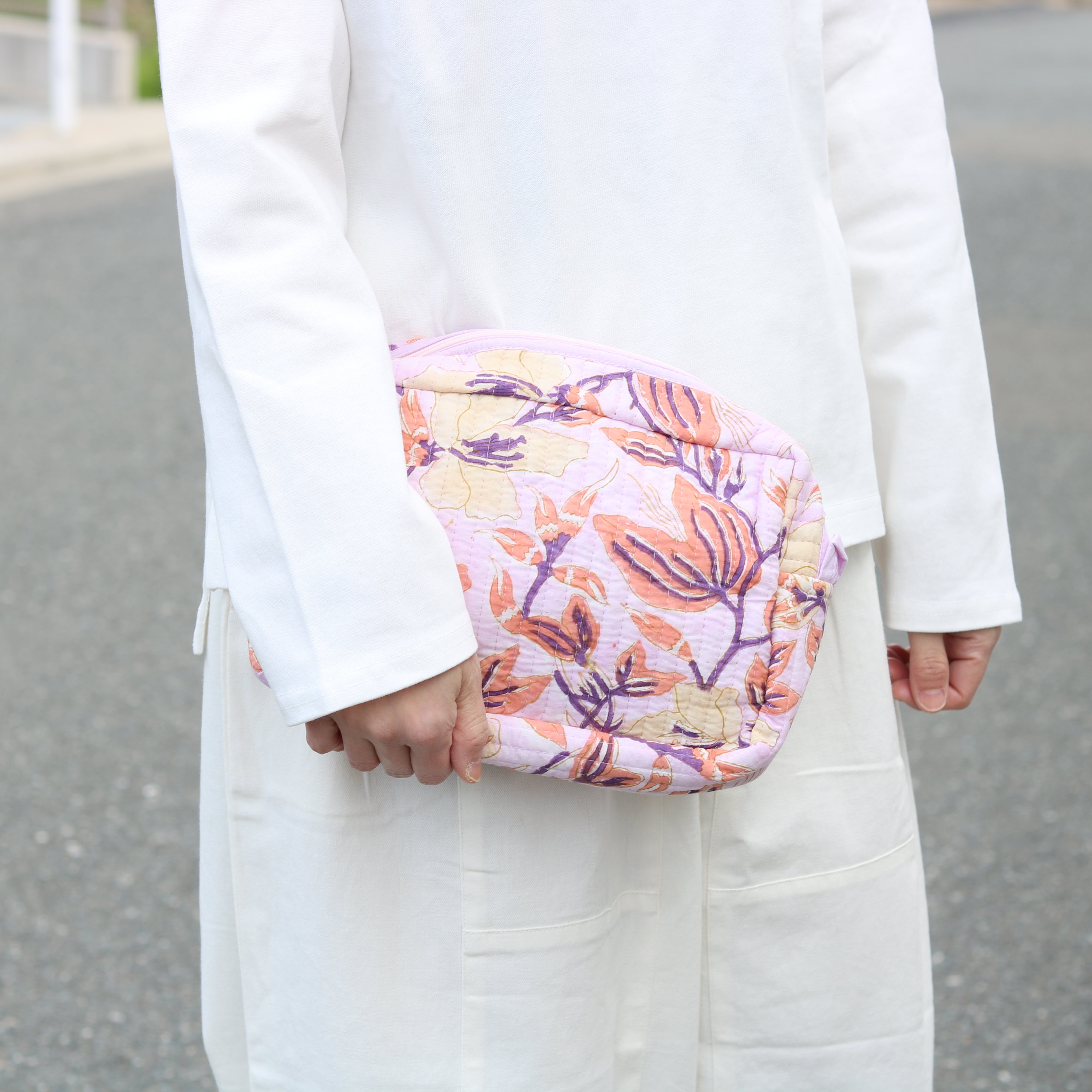 ブロックプリントを使用した大容量キルトポーチは、おむつやおしりふきが入るママたちにもうれしいアイテム。